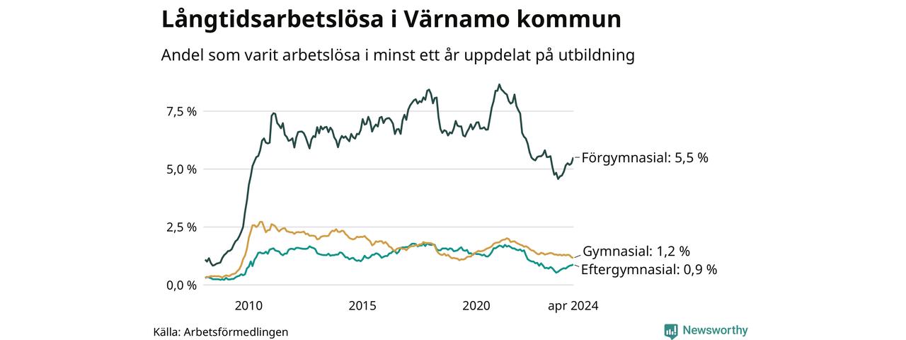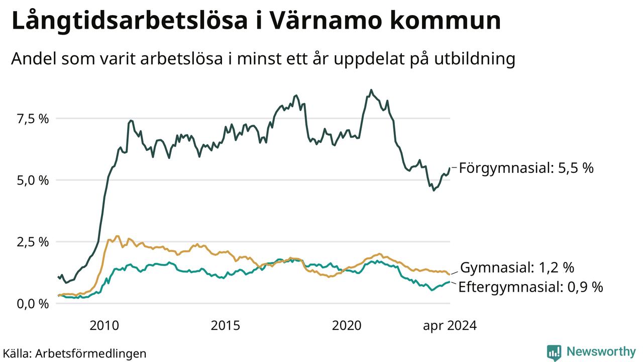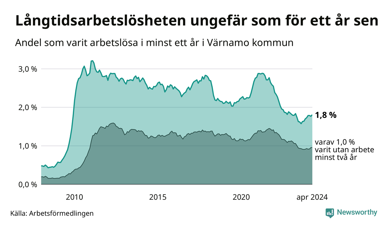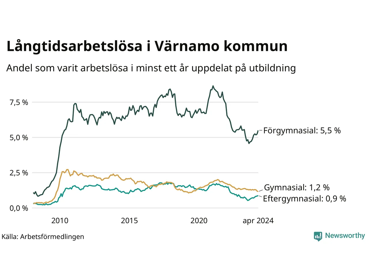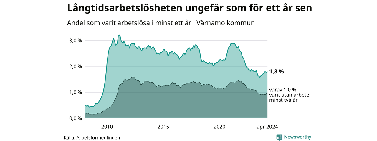 I april hade 322 Värnamobor varit arbetslösa i minst ett år, vilket är sju fler än månaden innan. 322 personer motsvarar 1,8 procent av arbetskraften i kommunen – andelen långtidsarbetslösa är ungefär på samma nivå som för ett år sedan.