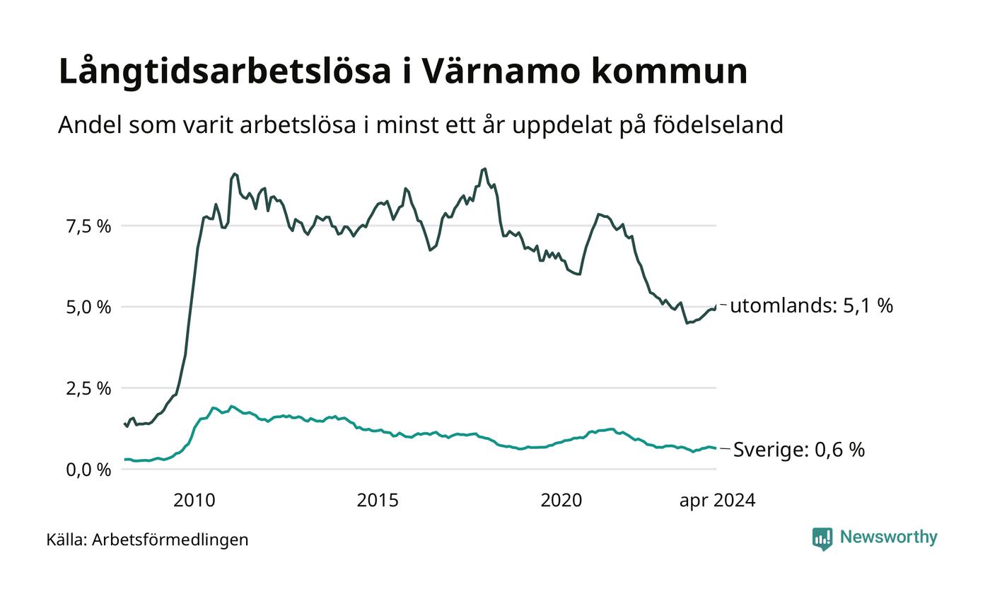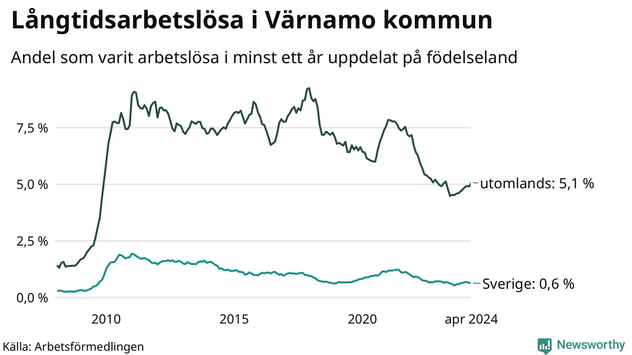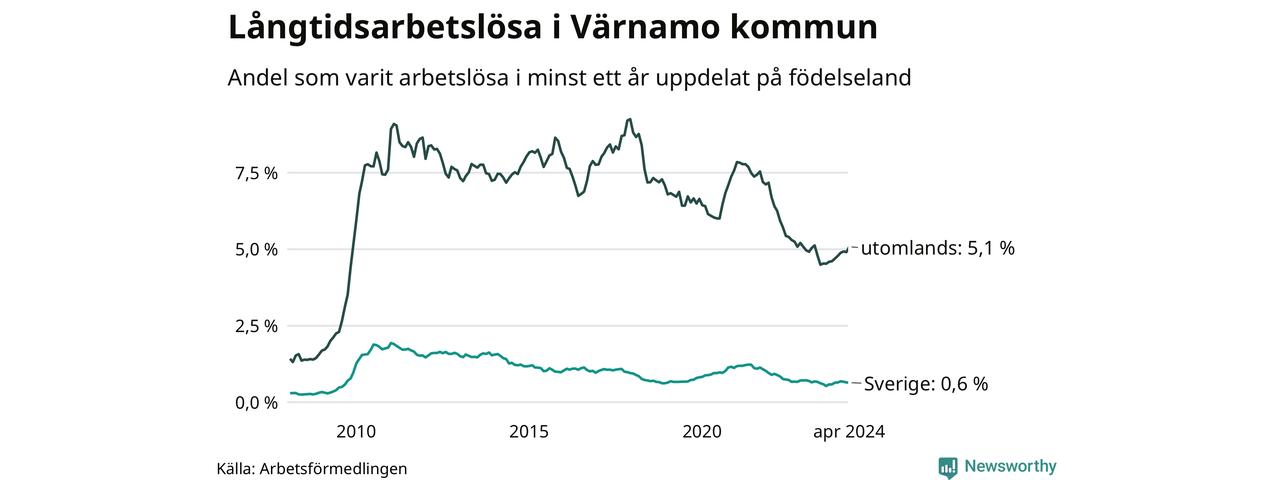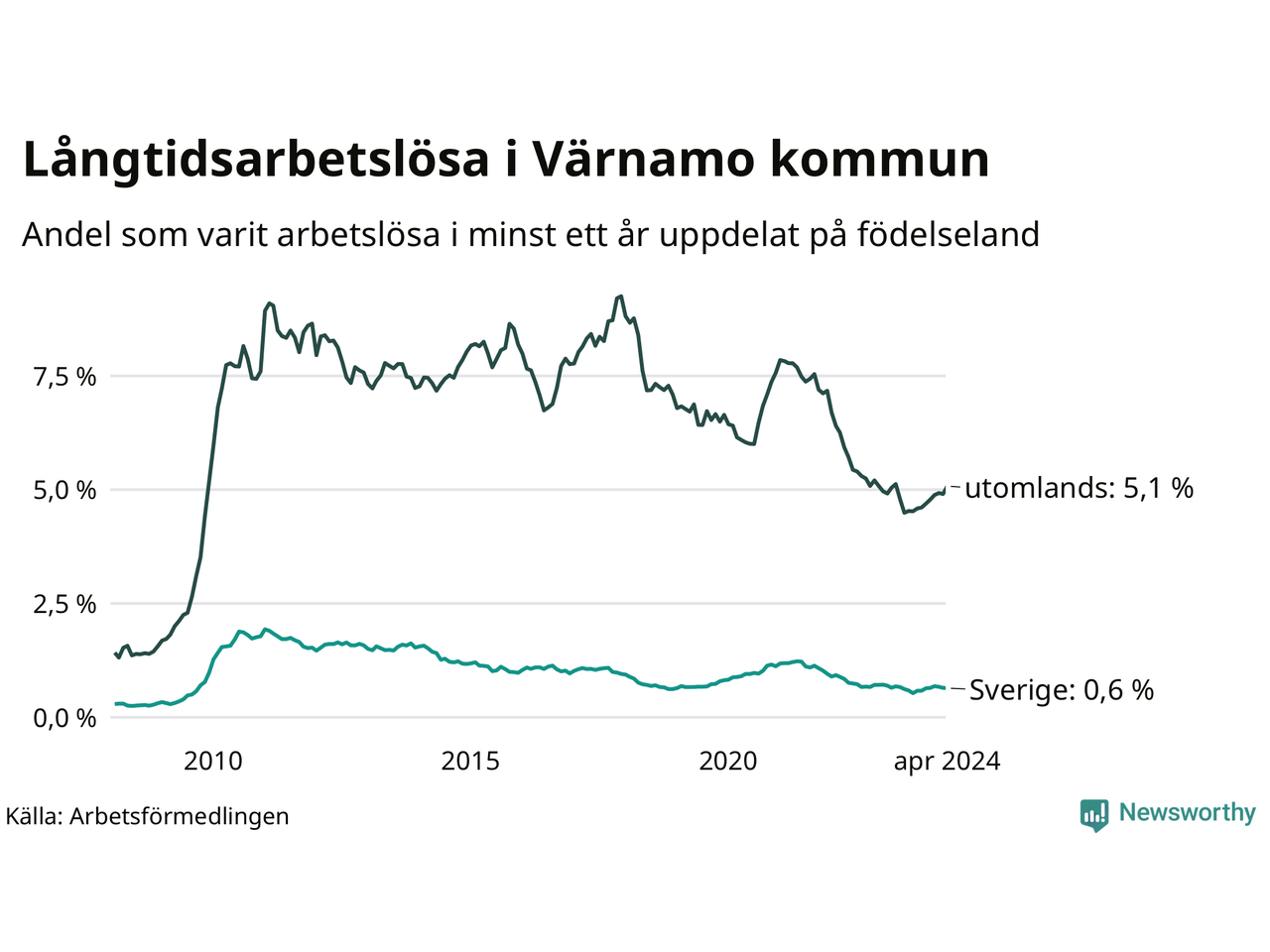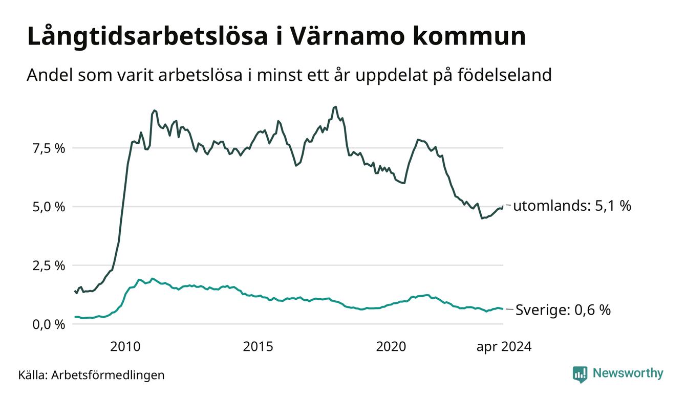 84 av de långtidsarbetslösa i Värnamo är födda i Sverige, medan 238 är födda utomlands. Det innebär att långtidsarbetslösheten bland Sverigefödda är 0,6 procent, medan den är nio gånger så hög – 5,1 procent – bland födda utomlands. Även i riket som helhet är arbetslösheten högre bland utrikesfödda.