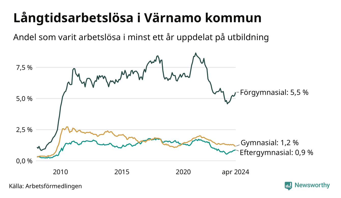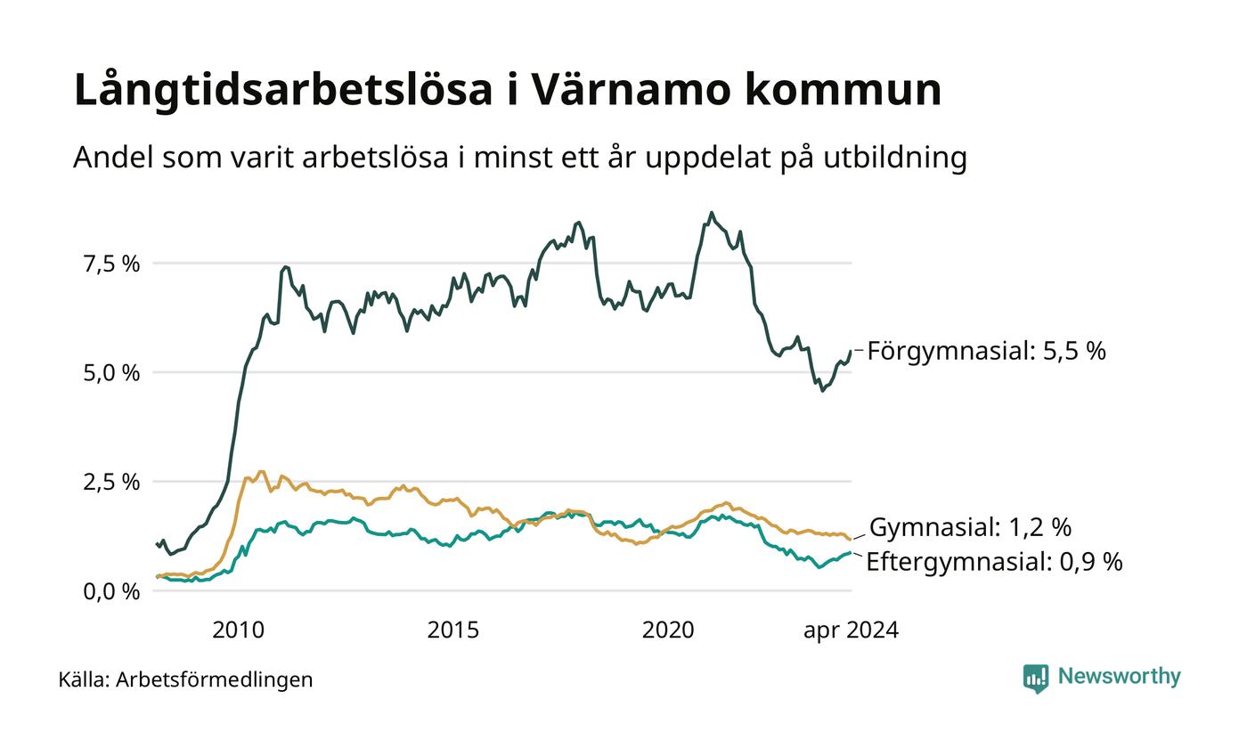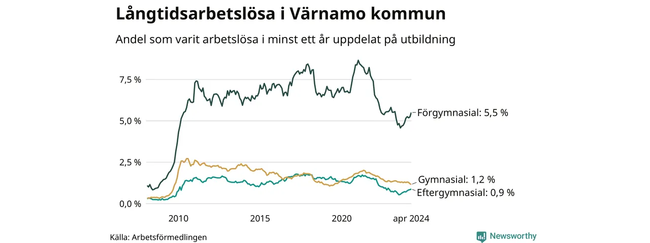 Andelen som varit utan arbete i minst ett år i Värnamo var ungefär lika stor i april jämfört med samma månad för ett år sedan. Det visar Arbetsfömedlingens senaste månadsstatistik.