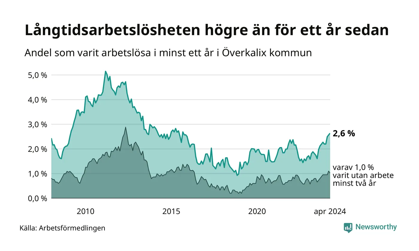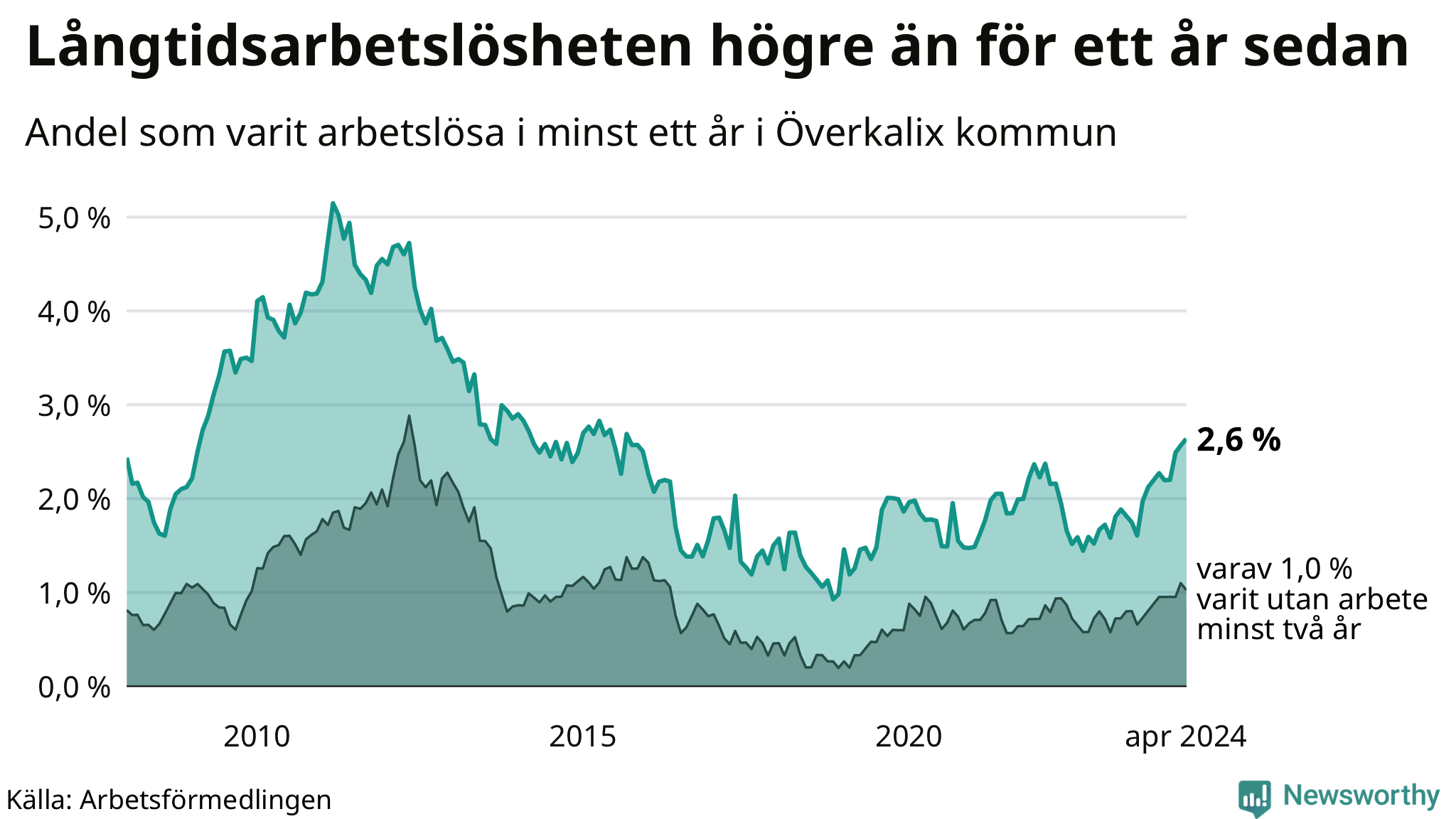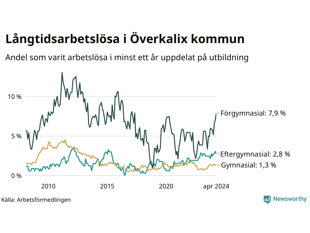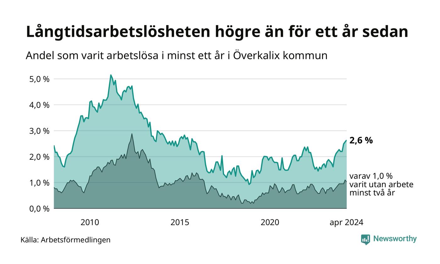 I april hade 36 Överkalixbor varit arbetslösa i minst ett år, vilket är en fler än månaden innan. 36 personer motsvarar 2,6 procent av arbetskraften i kommunen – andelen långtidsarbetslösa är 0,7 procentenheter högre än samma månad för ett år sedan.