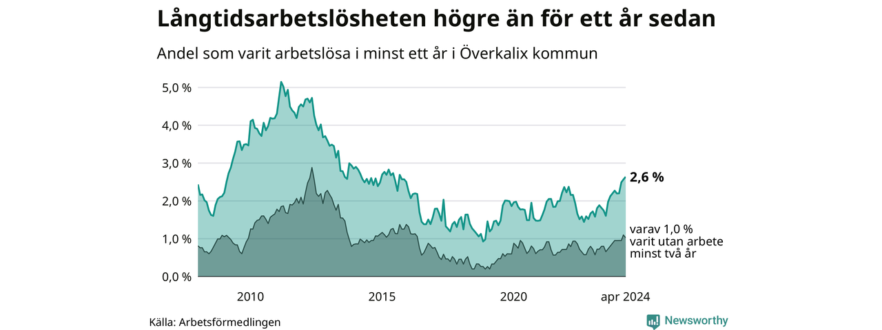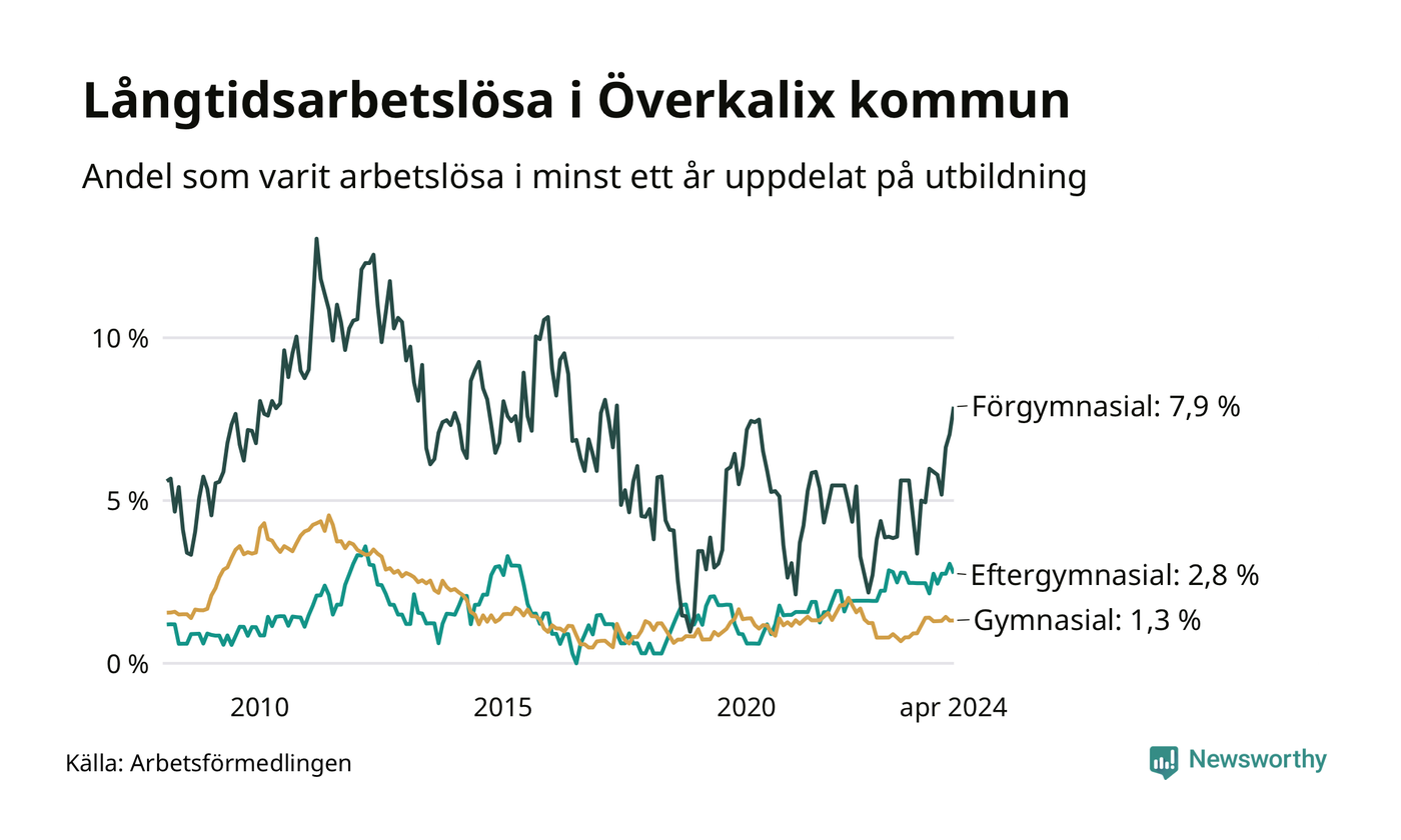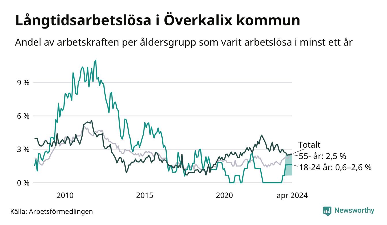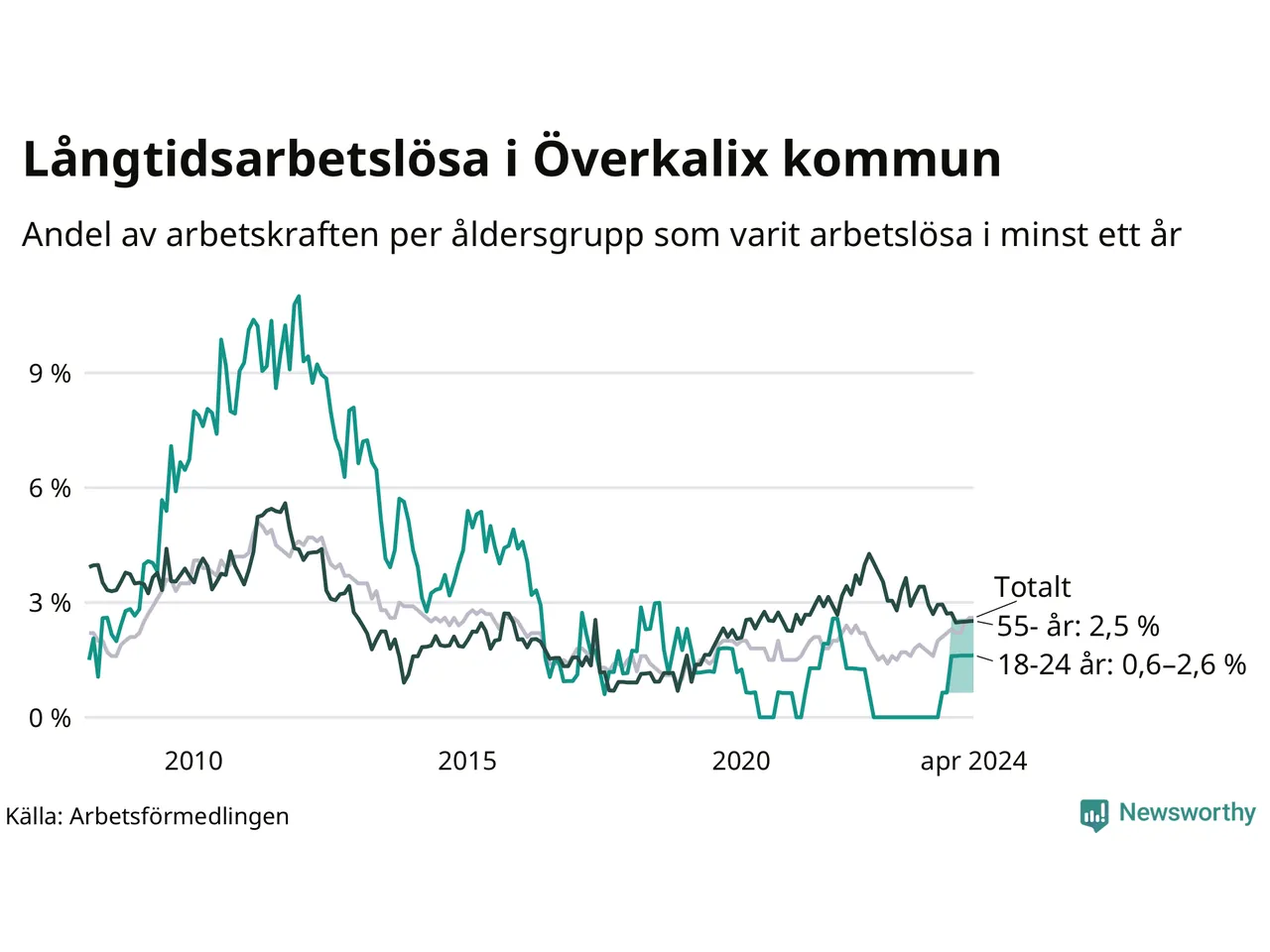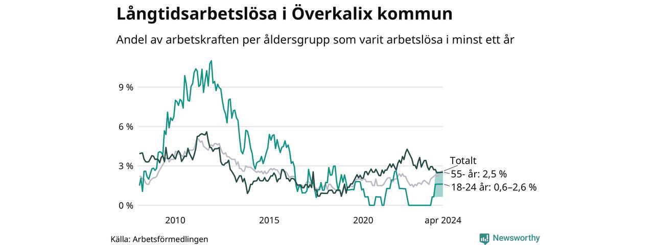 I april hade 36 Överkalixbor varit arbetslösa i minst ett år, vilket är en fler än månaden innan. 36 personer motsvarar 2,6 procent av arbetskraften i kommunen – andelen långtidsarbetslösa är 0,7 procentenheter högre än samma månad för ett år sedan.