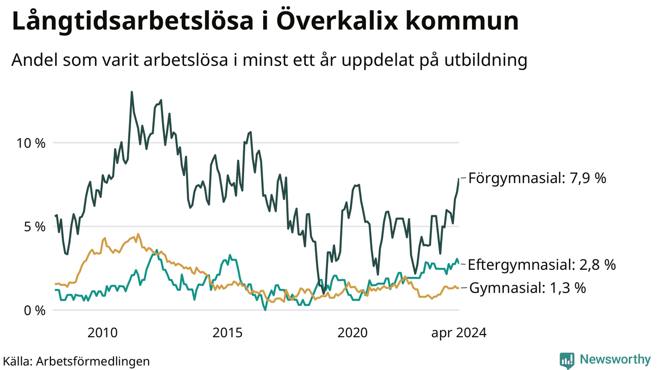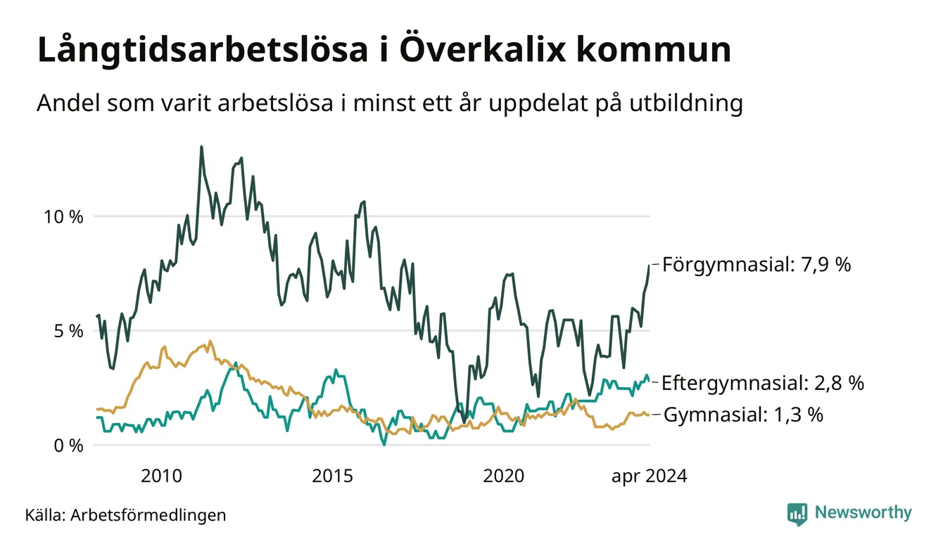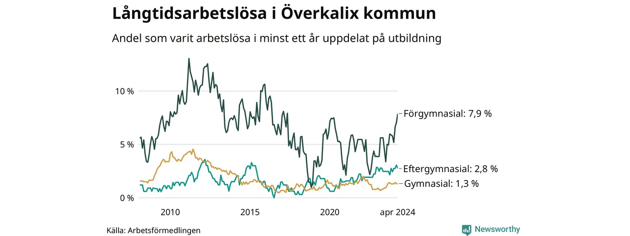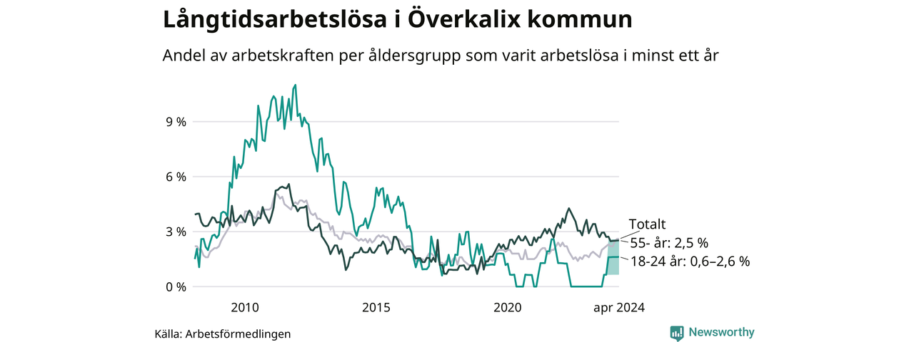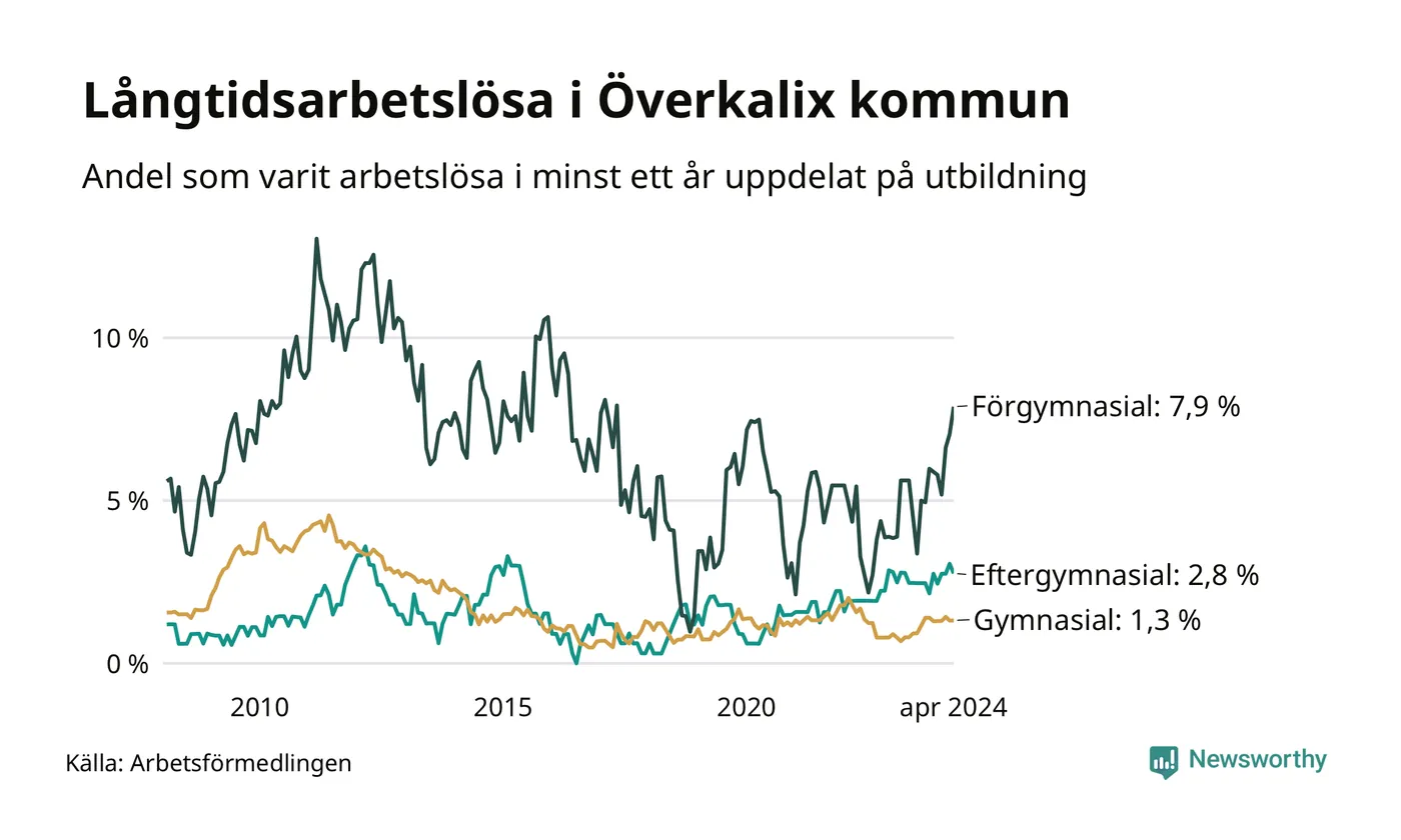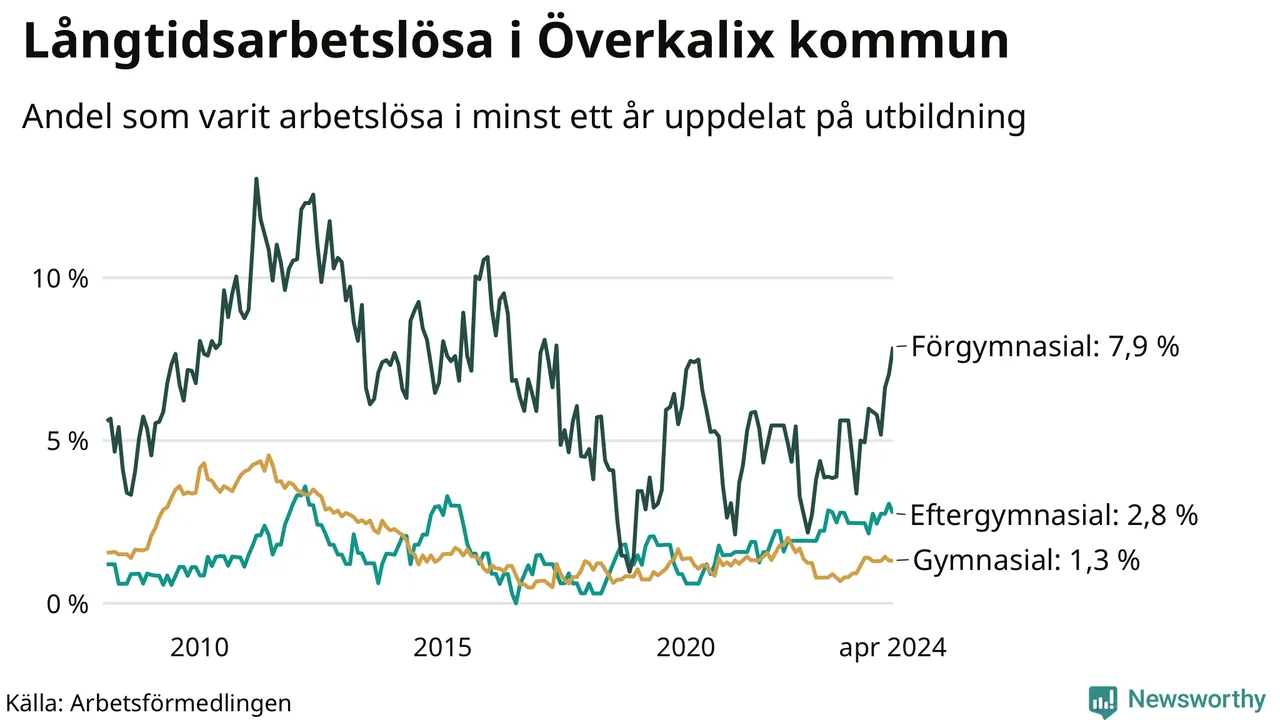 I april hade 36 Överkalixbor varit arbetslösa i minst ett år, vilket är en fler än månaden innan. 36 personer motsvarar 2,6 procent av arbetskraften i kommunen – andelen långtidsarbetslösa är 0,7 procentenheter högre än samma månad för ett år sedan.
