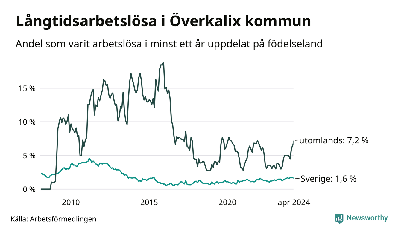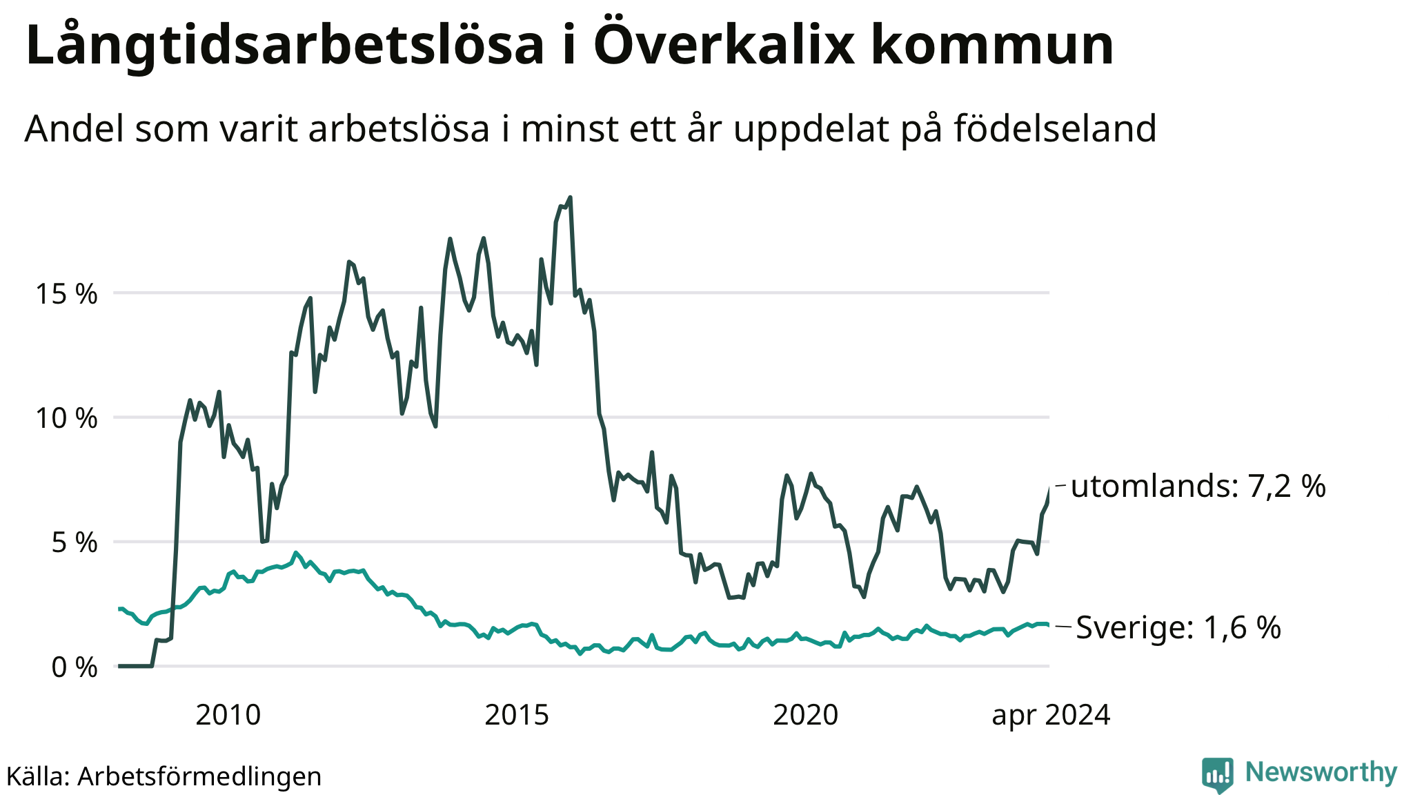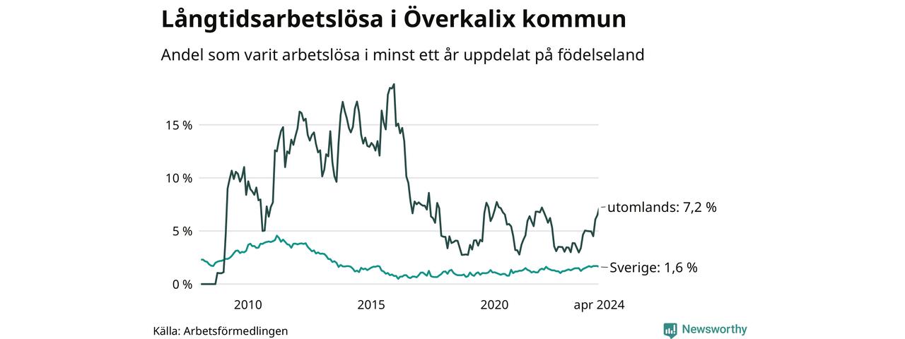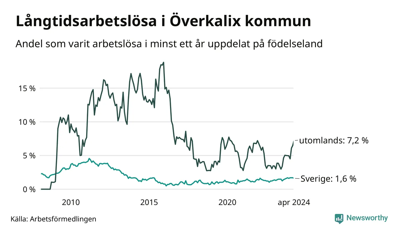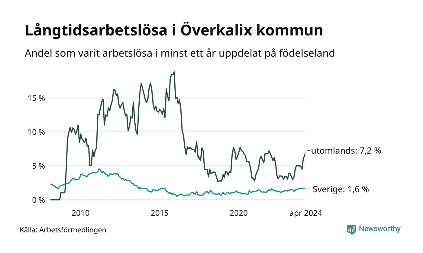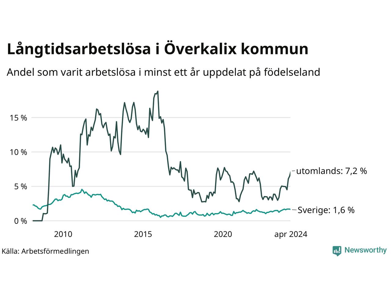 18 av de långtidsarbetslösa i Överkalix är födda i Sverige, medan 18 är födda utomlands. Det innebär att långtidsarbetslösheten bland Sverigefödda är 1,6 procent, medan den är fem gånger så hög – 7,2 procent – bland födda utomlands. Även i riket som helhet är arbetslösheten högre bland utrikesfödda.