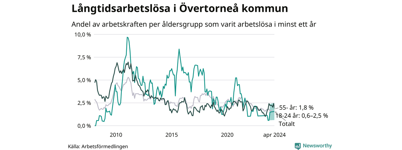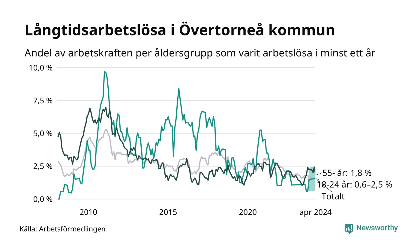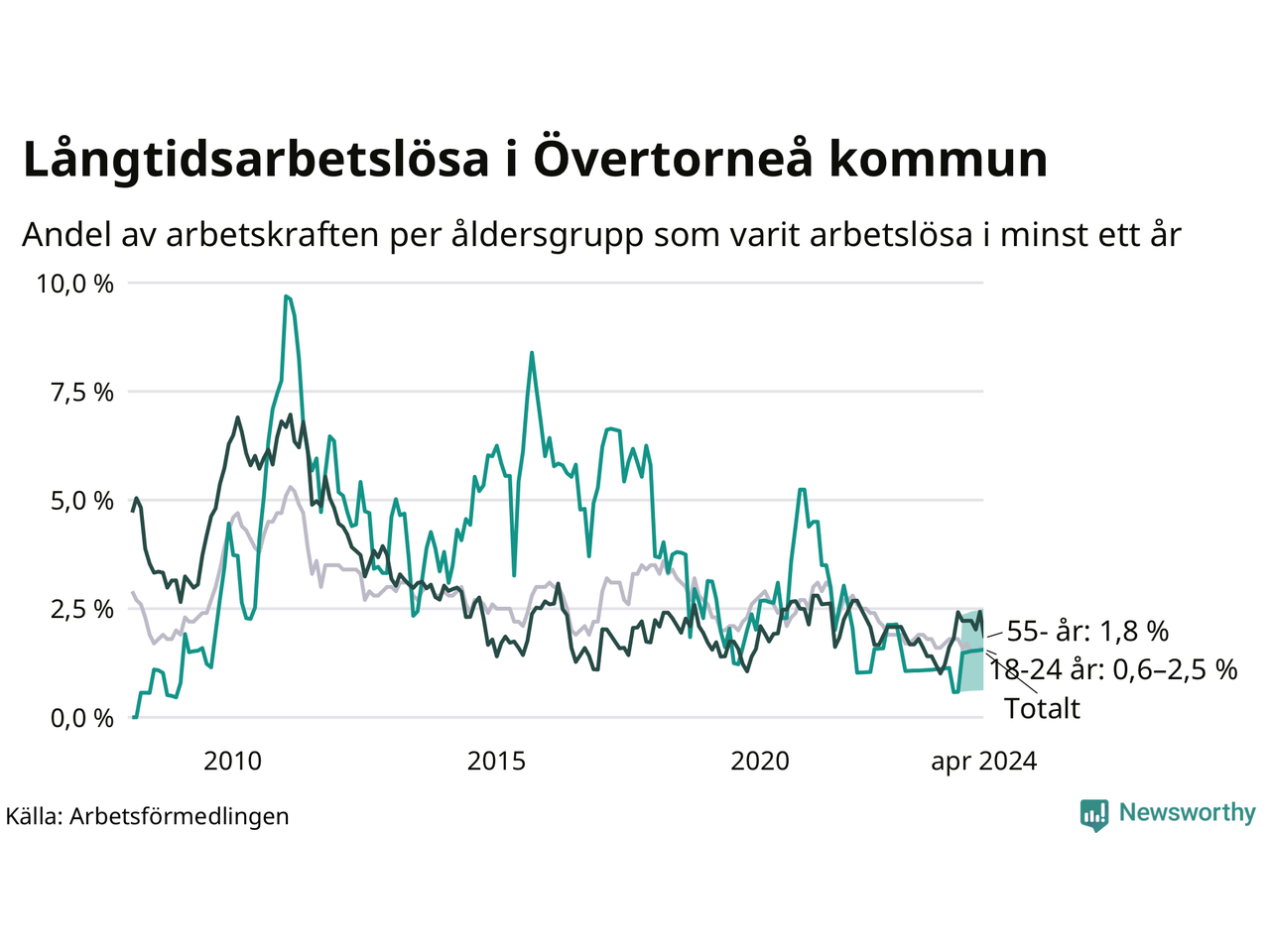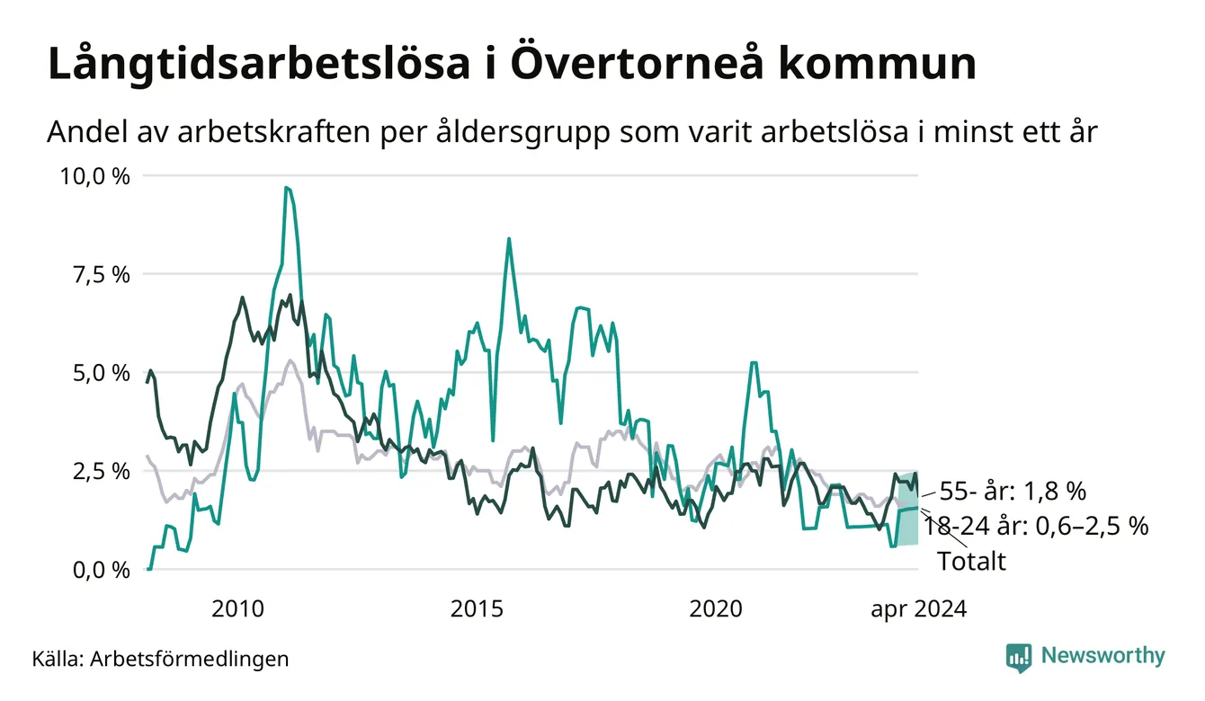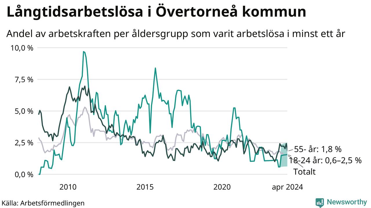 Av de 24 personerna som varit arbetslösa i mer än ett år i Övertorneå kommun är nio personer mellan 55 och 651 år och mellan en och fyra är mellan 18 och 24 år. För den äldre gruppen är andelen arbetslösa 1,8 procent medan den i den yngre gruppen är mellan 0,6 och 2,5 procent. Även i riket som helhet är långtidsarbetslösheten högre i gruppen äldre.