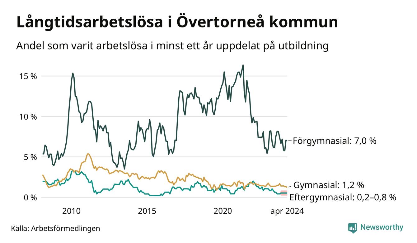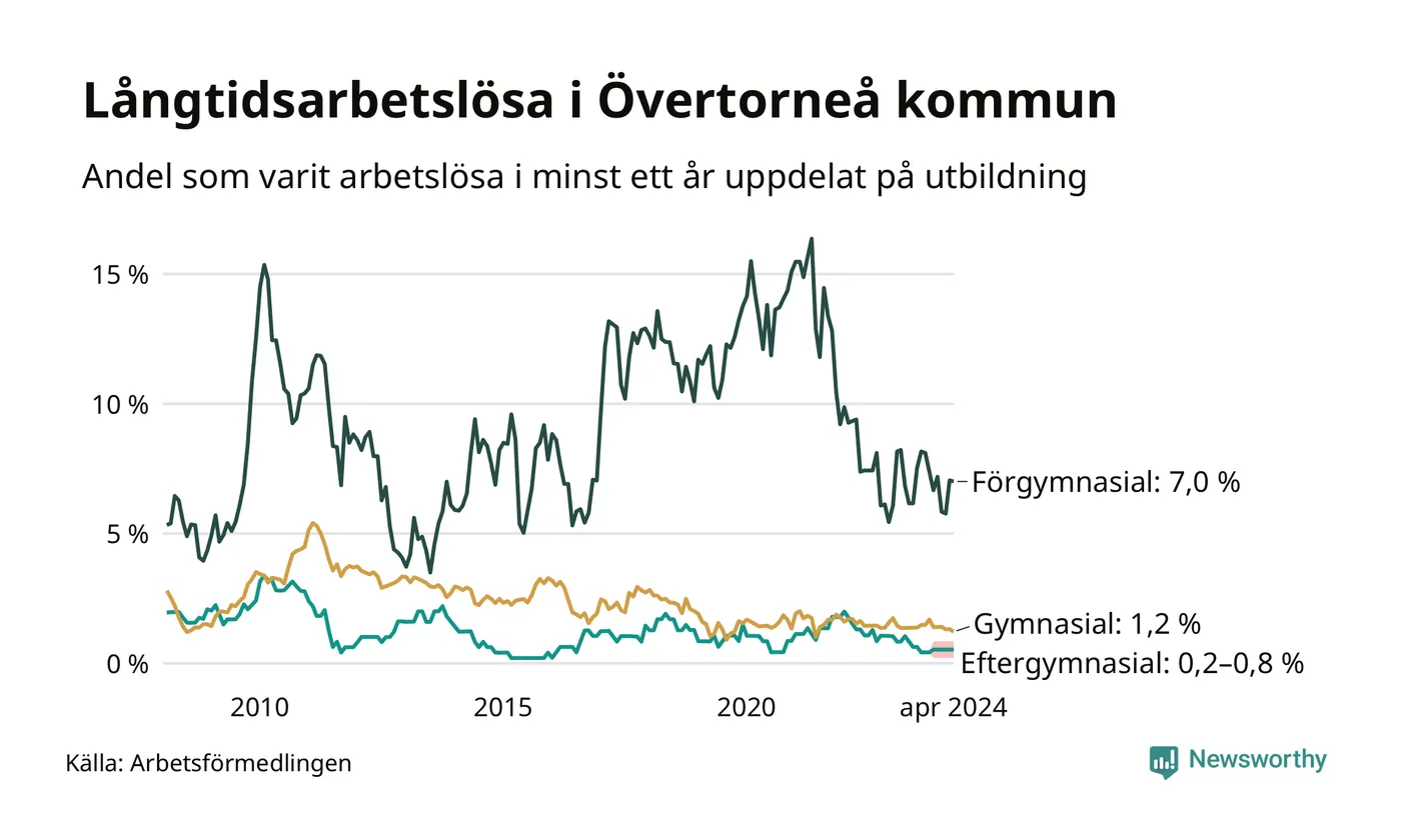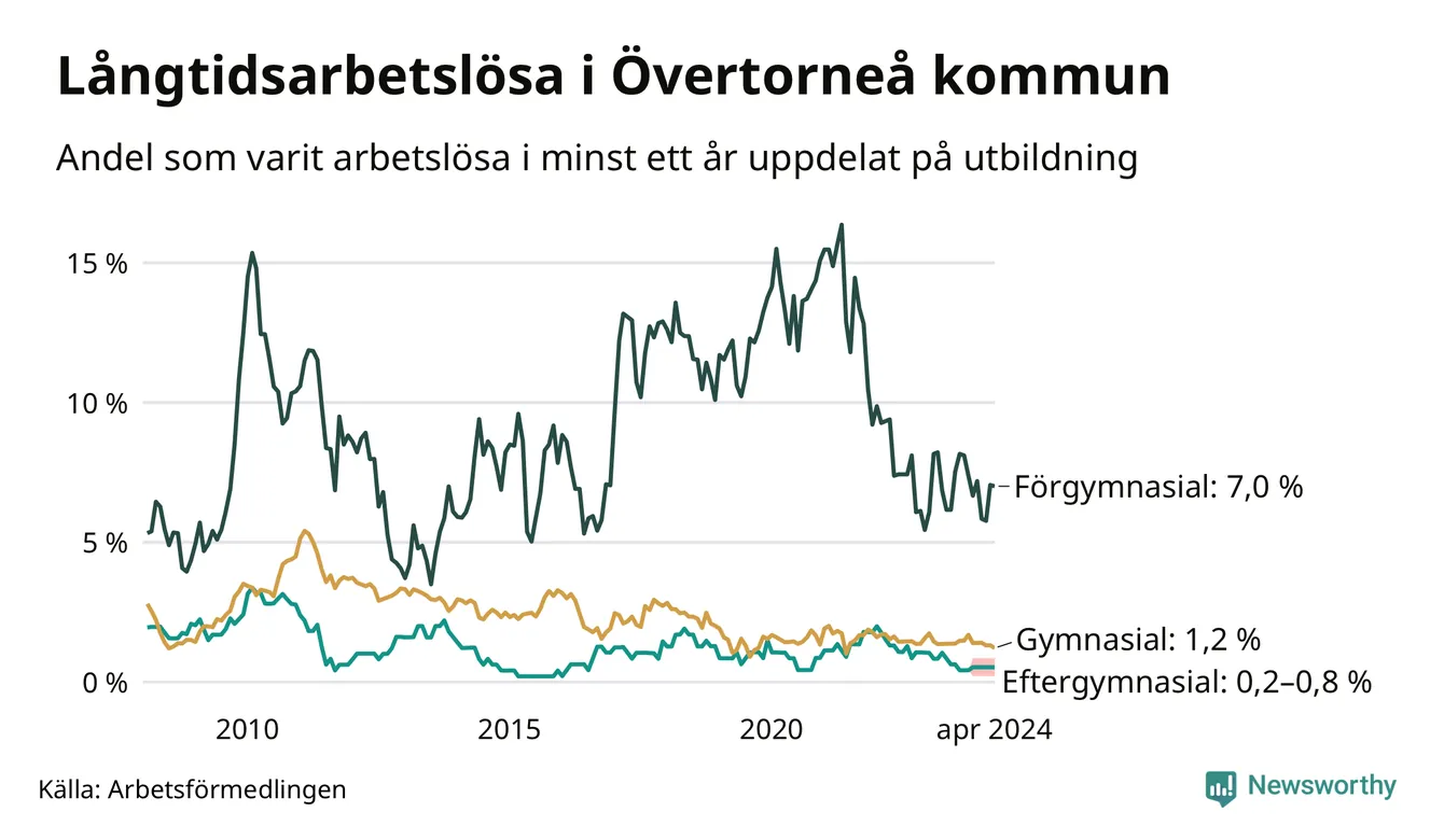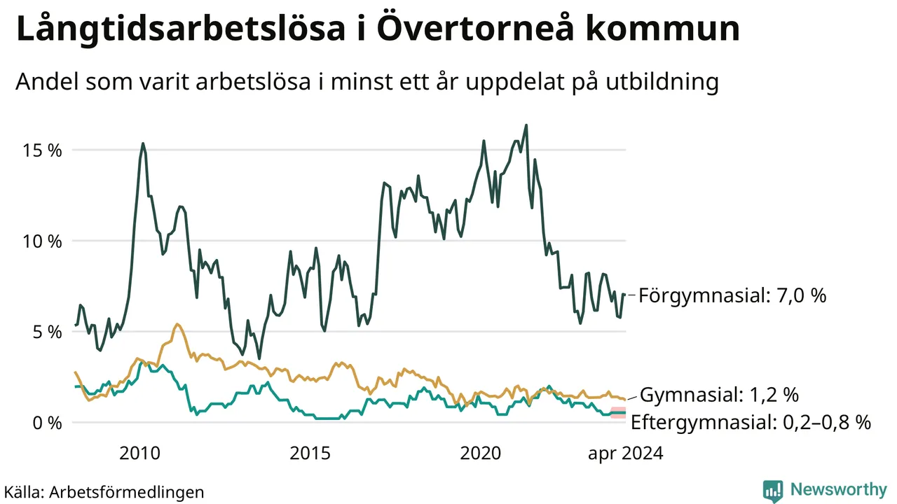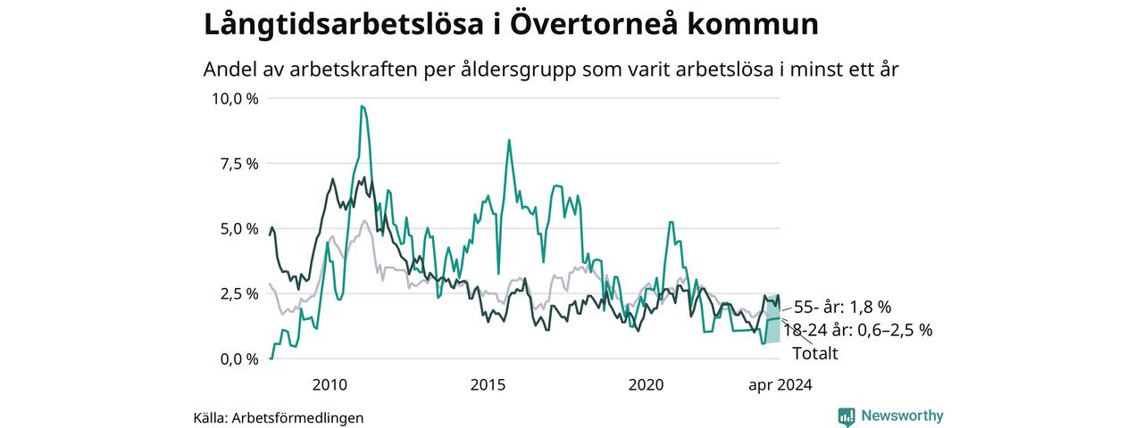 Av de 24 personerna som varit arbetslösa i mer än ett år i Övertorneå kommun är nio personer mellan 55 och 651 år och mellan en och fyra är mellan 18 och 24 år. För den äldre gruppen är andelen arbetslösa 1,8 procent medan den i den yngre gruppen är mellan 0,6 och 2,5 procent. Även i riket som helhet är långtidsarbetslösheten högre i gruppen äldre.