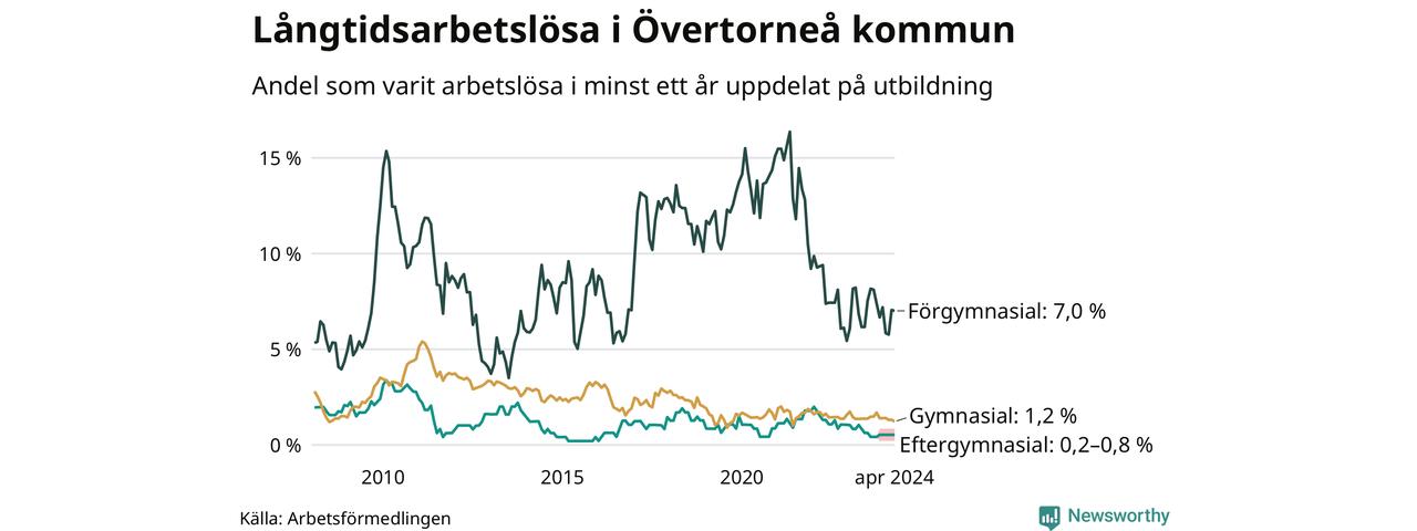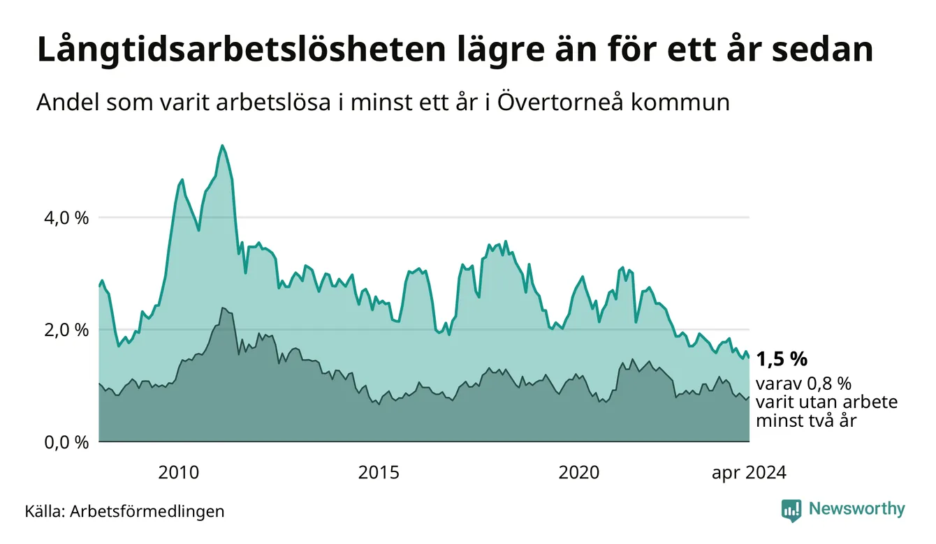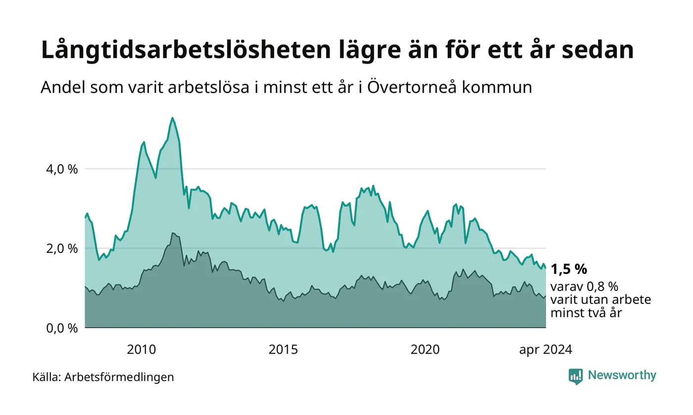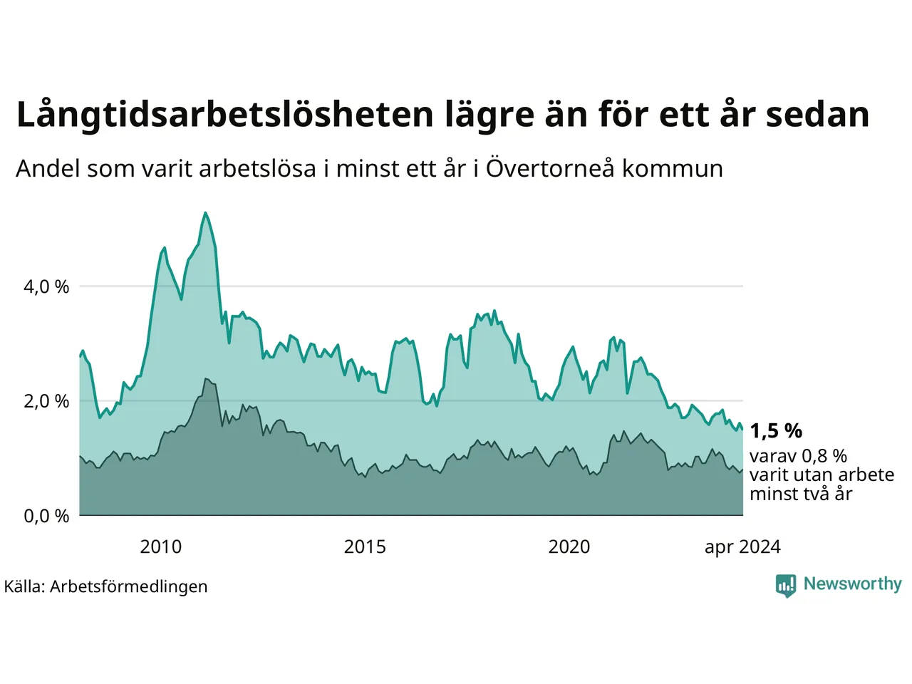 Andelen som varit utan arbete i minst ett år i Övertorneå var lägre i april jämfört med samma månad för ett år sedan. Det visar Arbetsfömedlingens senaste månadsstatistik.