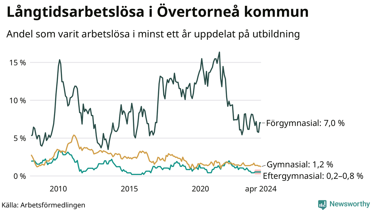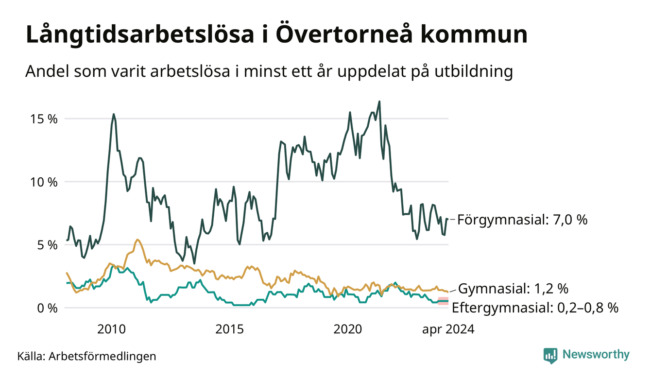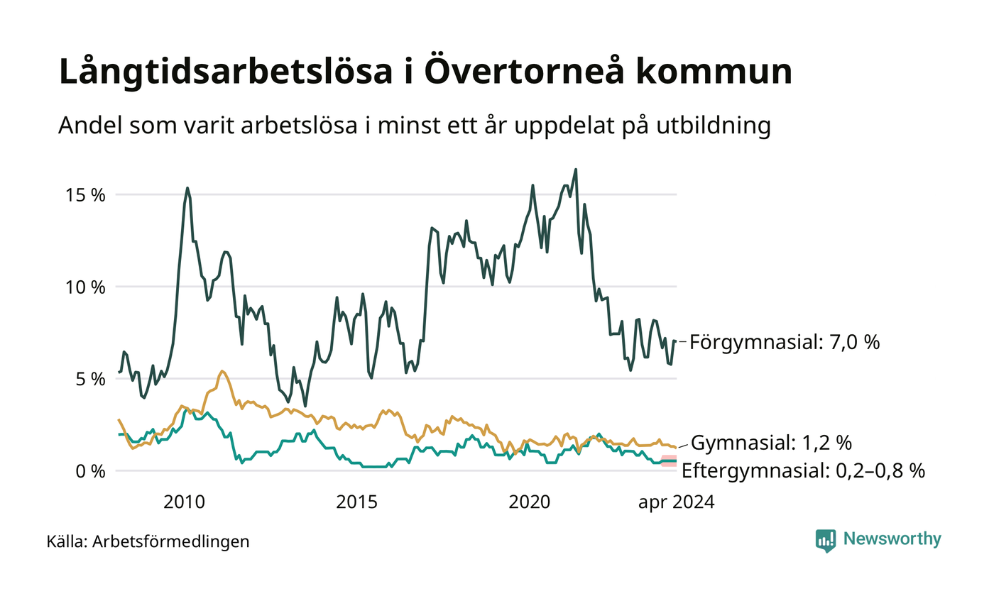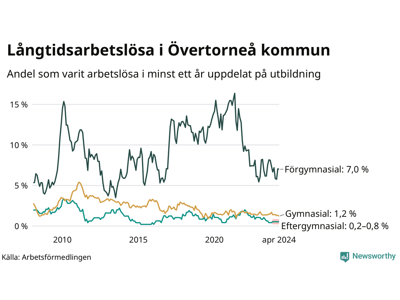 Andelen som varit utan arbete i minst ett år i Övertorneå var lägre i april jämfört med samma månad för ett år sedan. Det visar Arbetsfömedlingens senaste månadsstatistik.