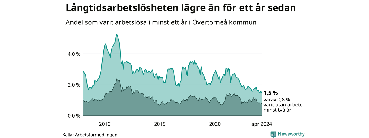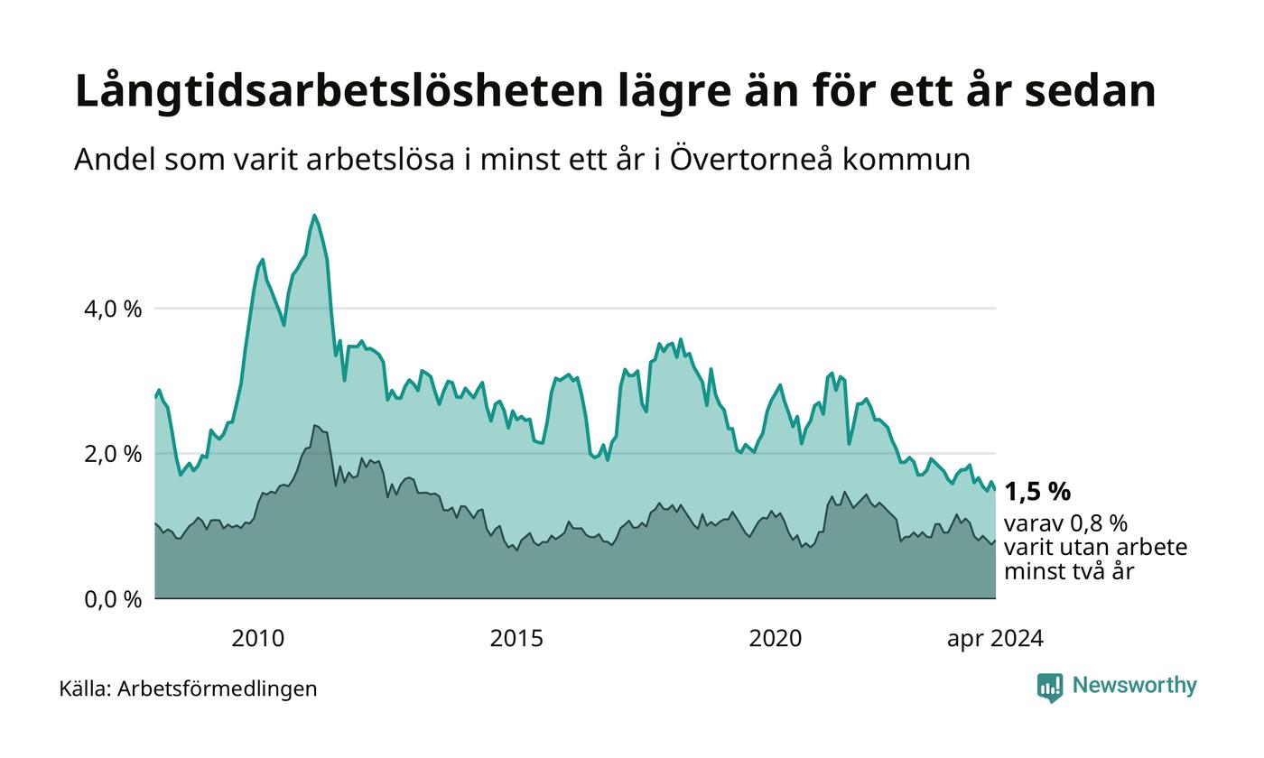 I april hade 24 Övertorneåbor varit arbetslösa i minst ett år, vilket är två färre än månaden innan. 24 personer motsvarar 1,5 procent av arbetskraften i kommunen – andelen långtidsarbetslösa är 0,3 procentenheter lägre än samma månad för ett år sedan. Det är också den den näst lägsta andelen långtidsarbetslösa under de senaste 15 åren.