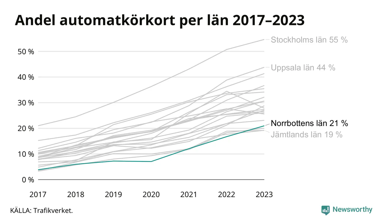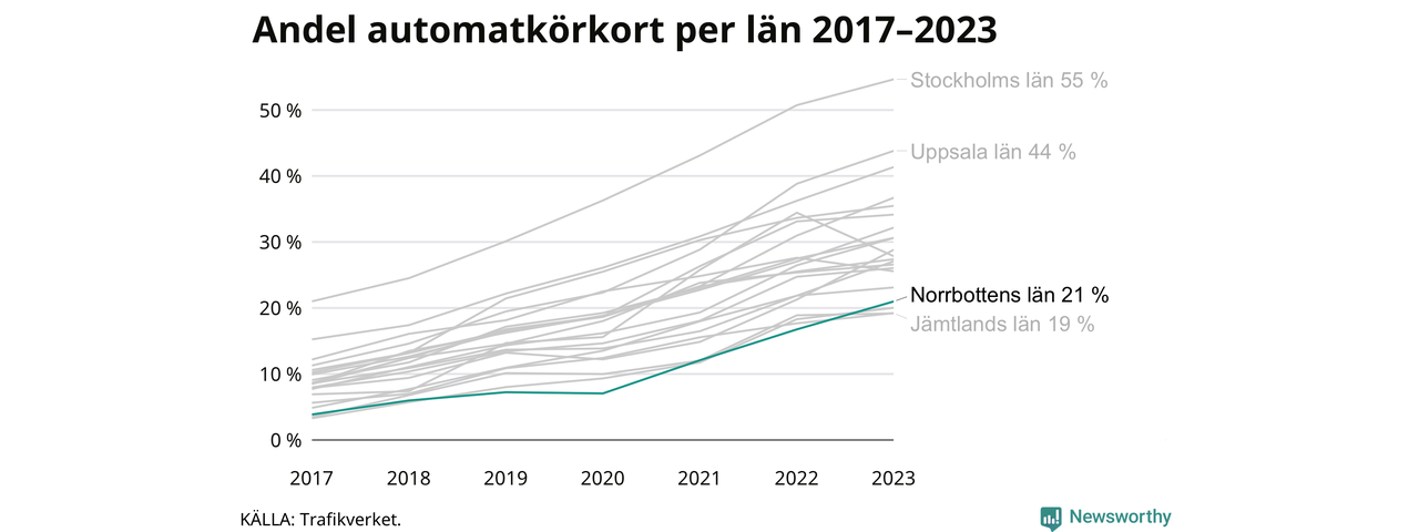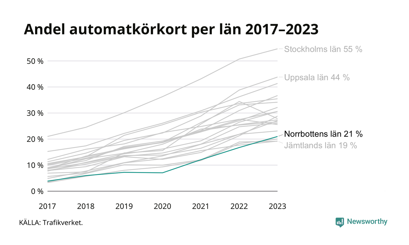 Samma utveckling ses i Norrbottens län, om än något långsammare än i riket som helhet. Här har andelen automatkörkort ökat från 4 procent 2017 till 21 procent 2023. Störst är andelen bland dem som kör upp i Arvidsjaur där 38 av de 135 som körde upp för B-körkort 2023 begränsade sig till automatväxlad bil. Det motsvarar 28 procent. I Pajala var det bara 8 procent – sex av de 72 som körde upp under 2023 – som satsade på automat.