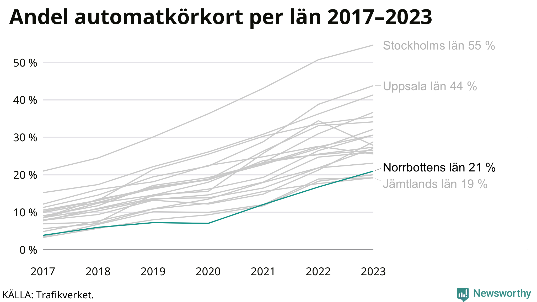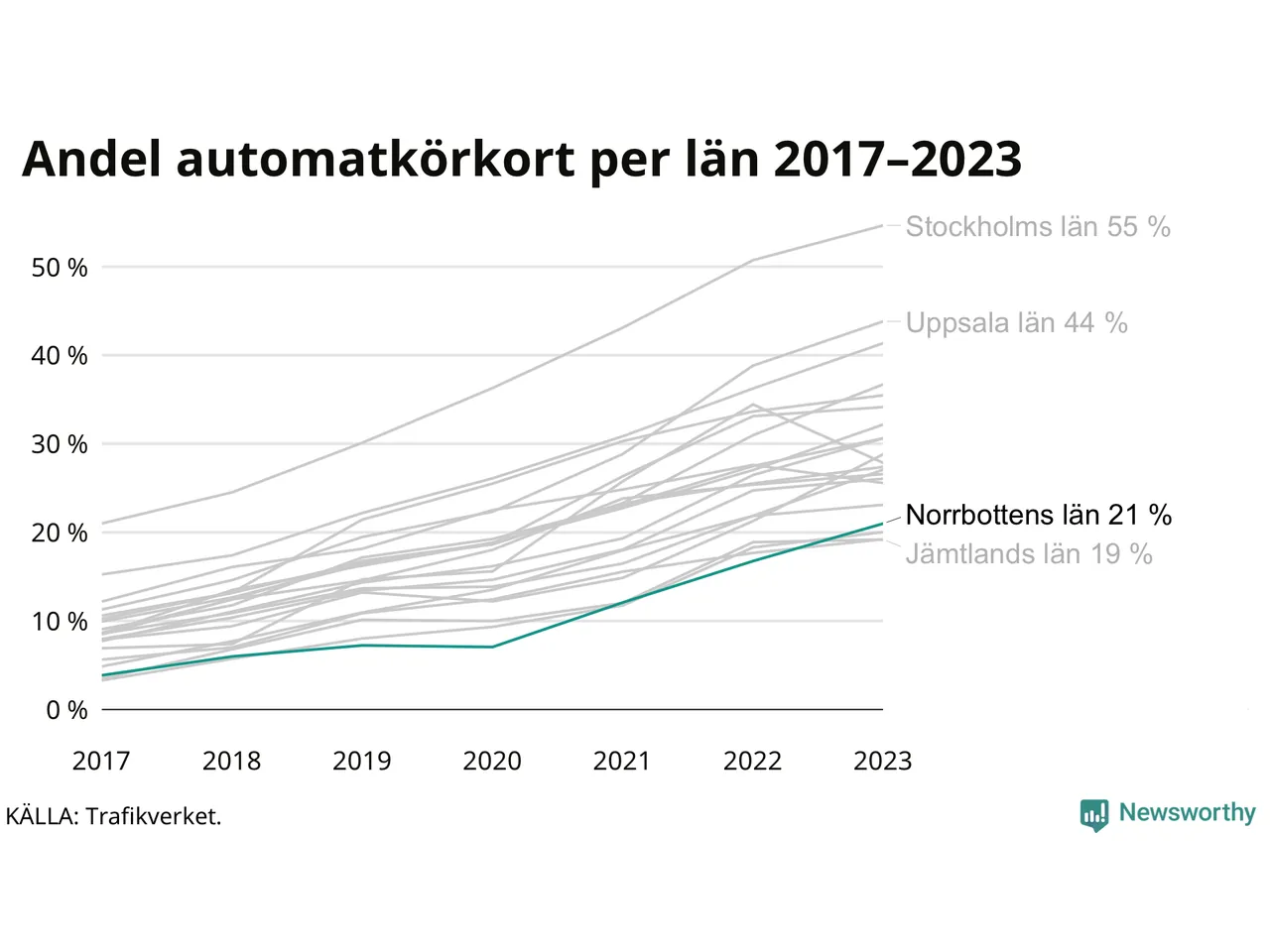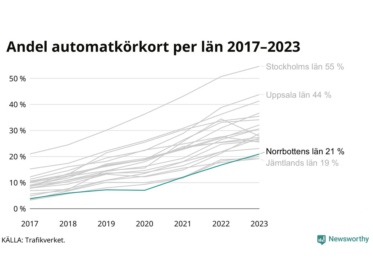 Samma utveckling ses i Norrbottens län, om än något långsammare än i riket som helhet. Här har andelen automatkörkort ökat från 4 procent 2017 till 21 procent 2023. Störst är andelen bland dem som kör upp i Arvidsjaur där 38 av de 135 som körde upp för B-körkort 2023 begränsade sig till automatväxlad bil. Det motsvarar 28 procent. I Pajala var det bara 8 procent – sex av de 72 som körde upp under 2023 – som satsade på automat.