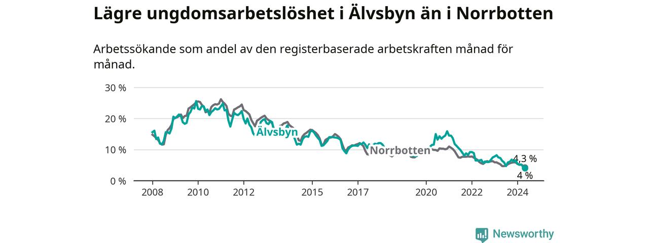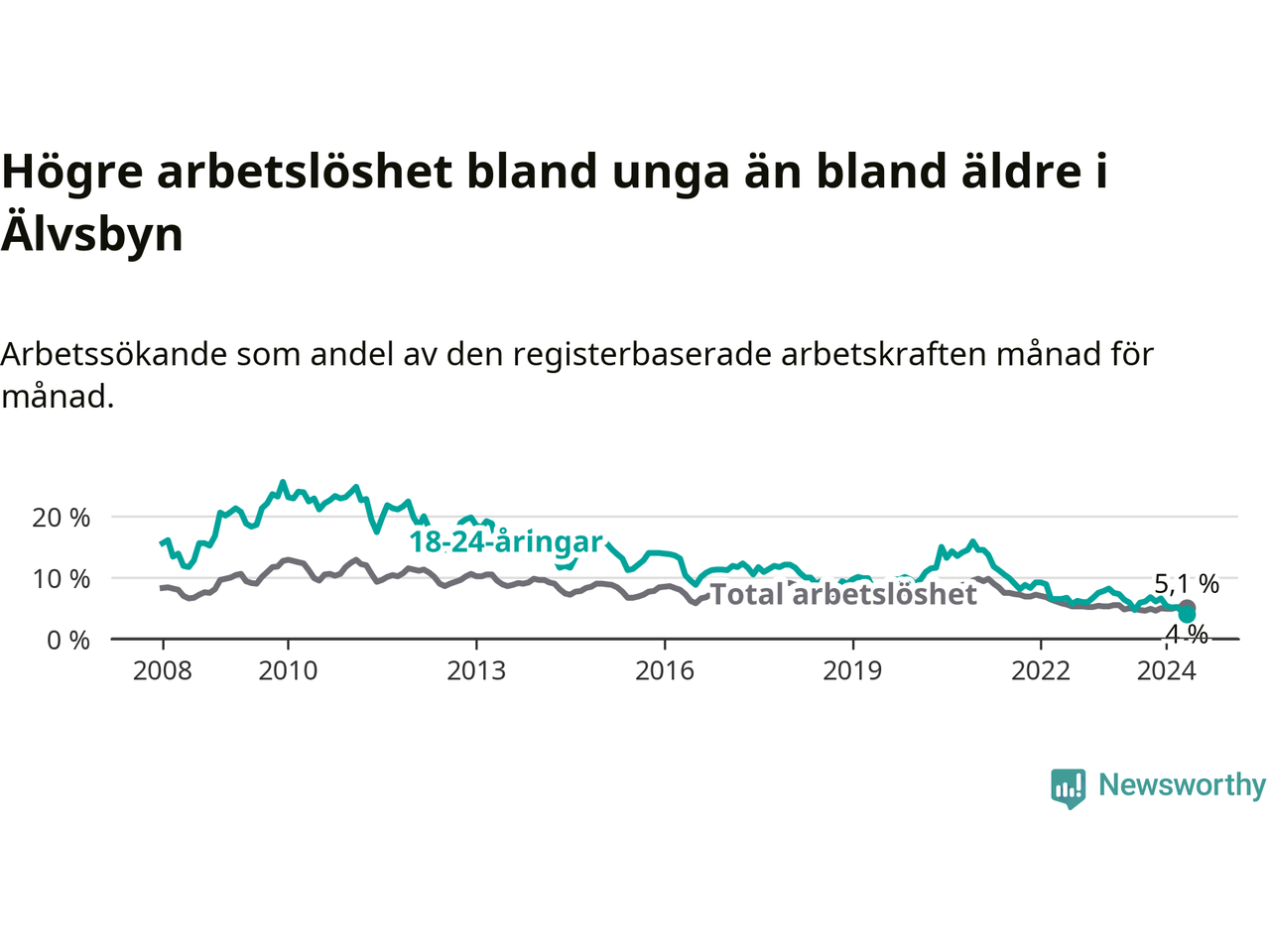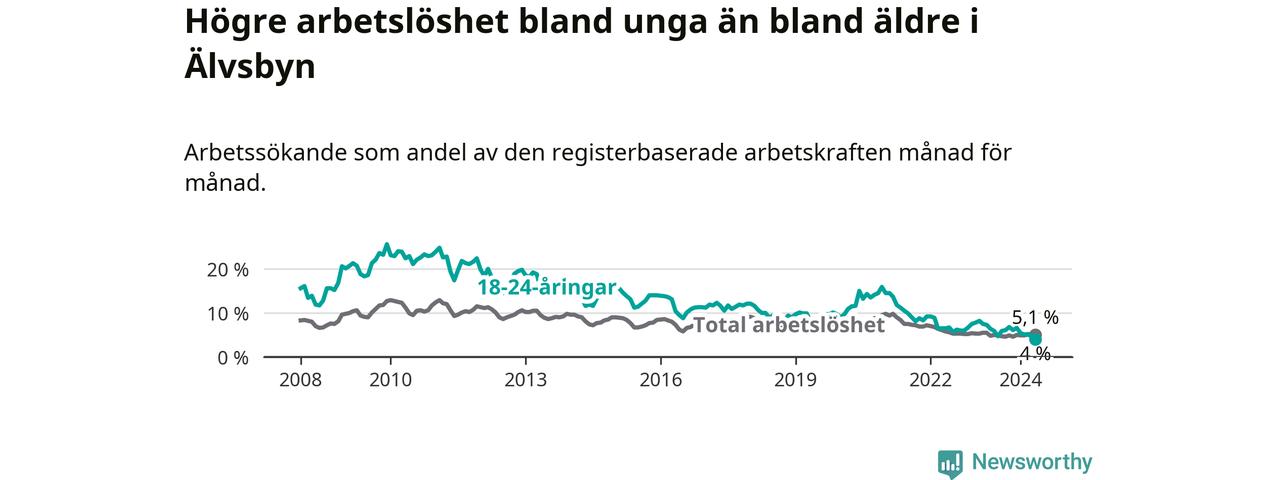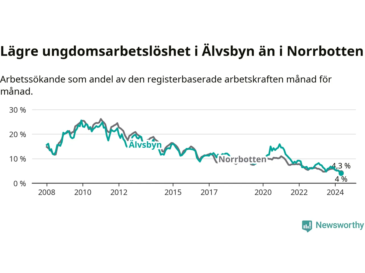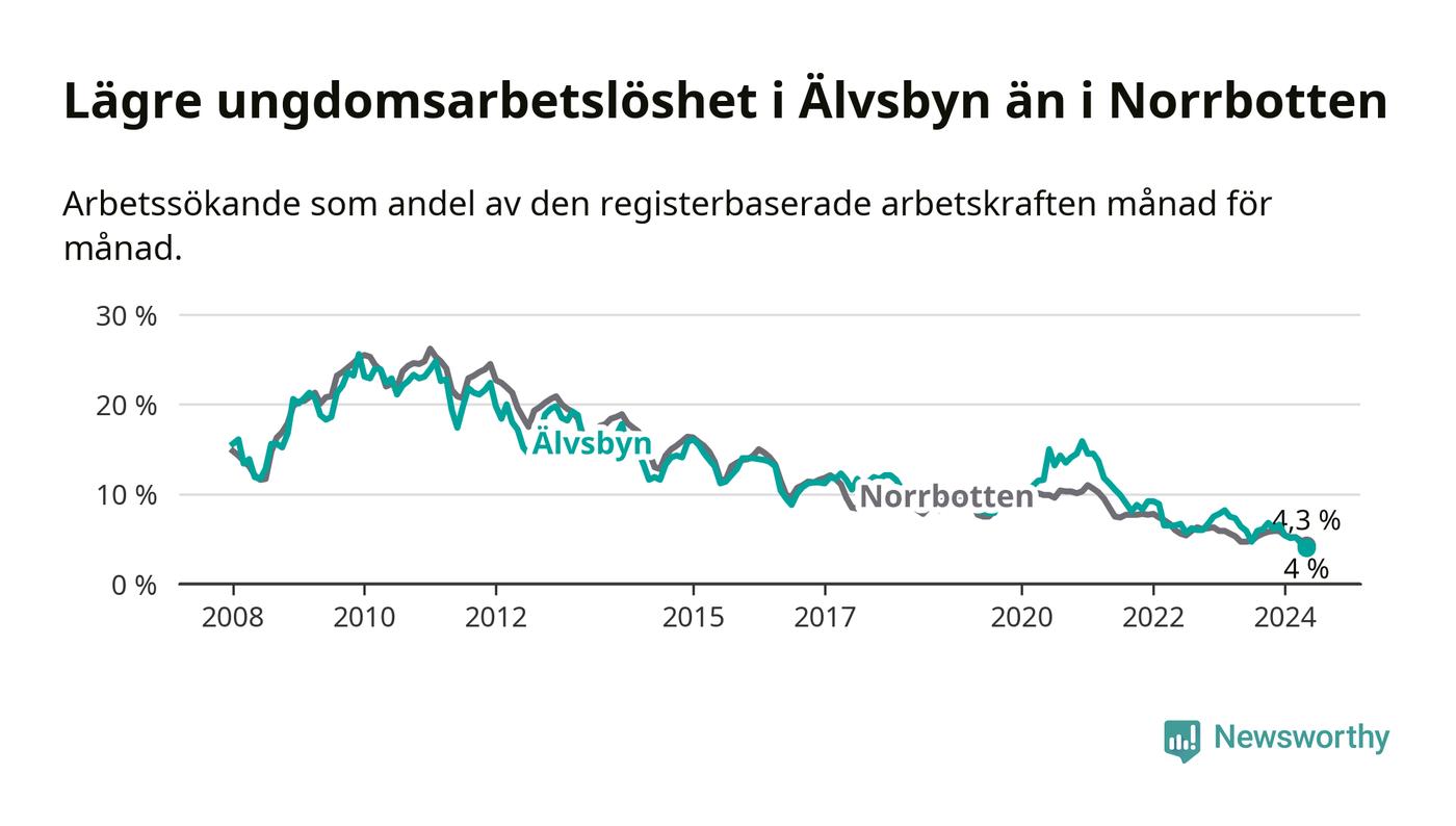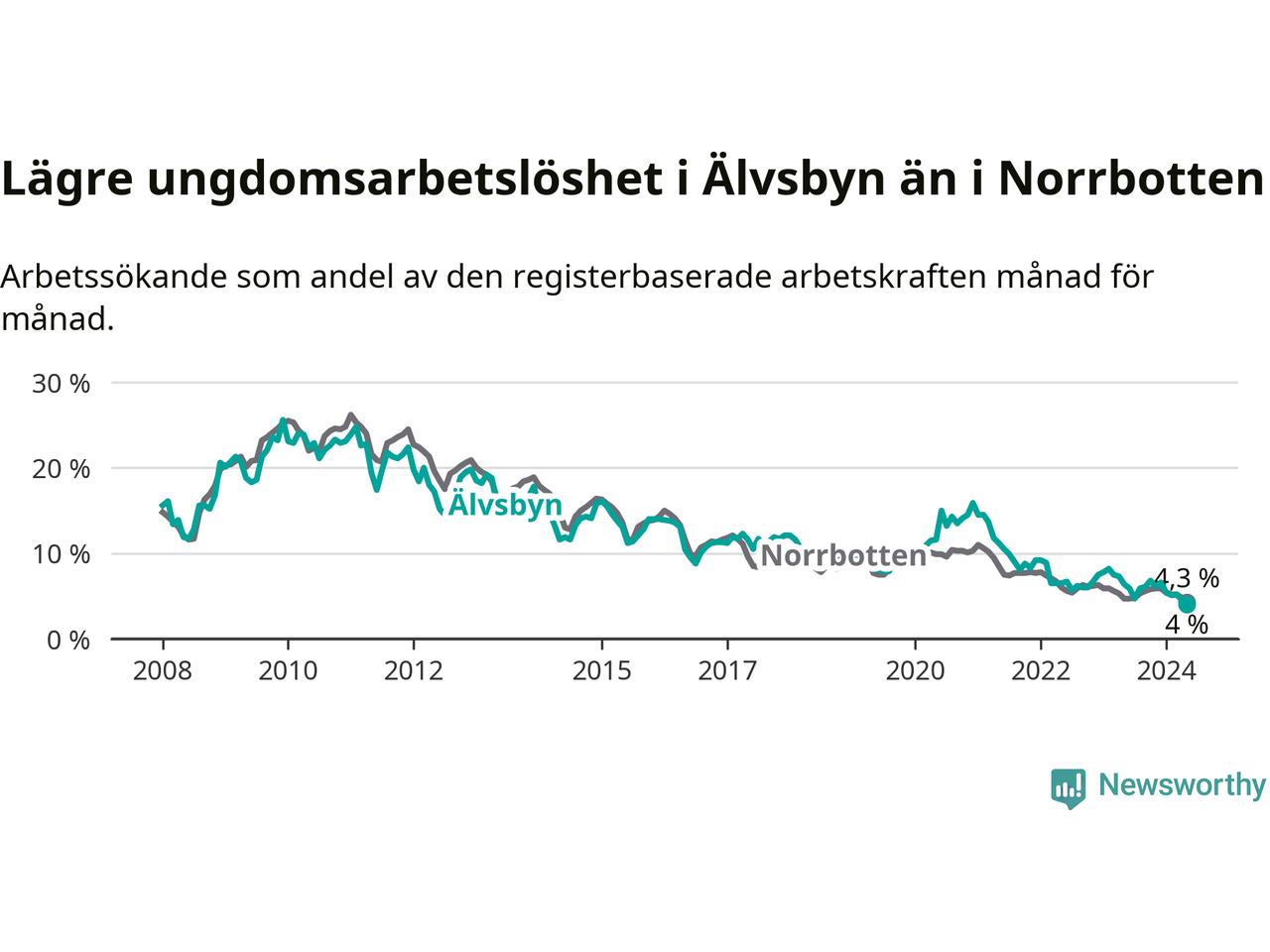Medan Älvsbyn har högre total arbetslöshet än Norrbotten, ligger ungdomsarbetslösheten 0,3 procentenheter lägre i Älvsbyn.