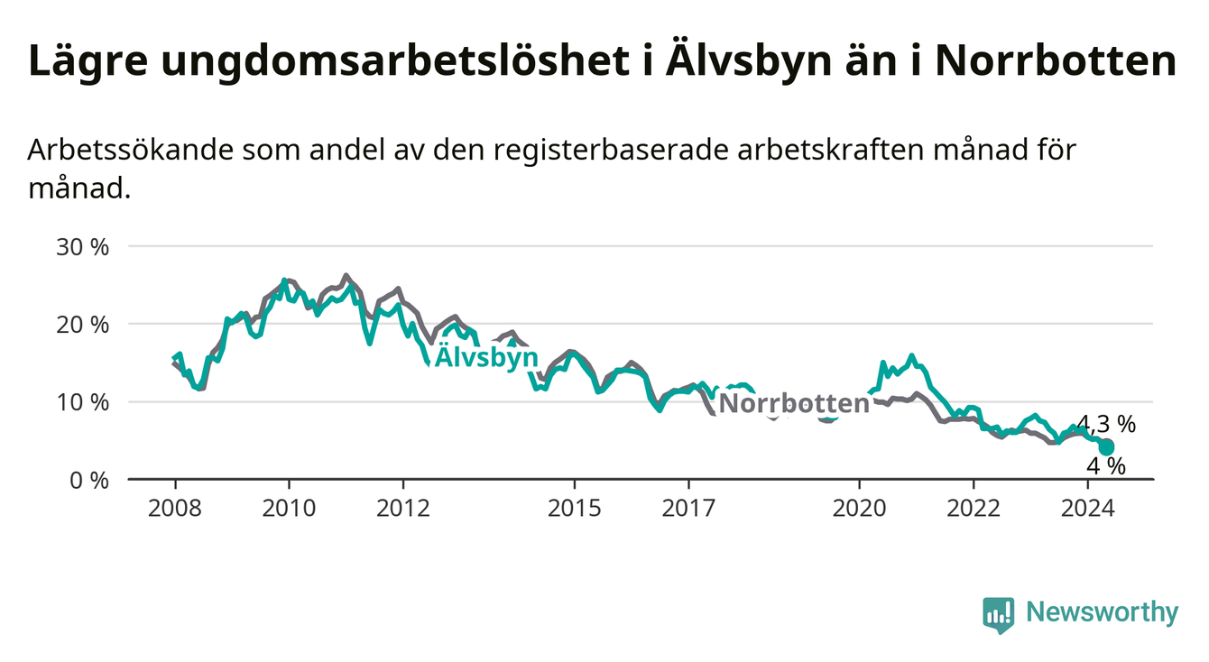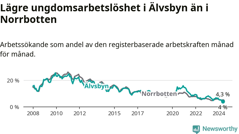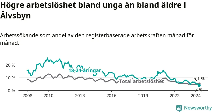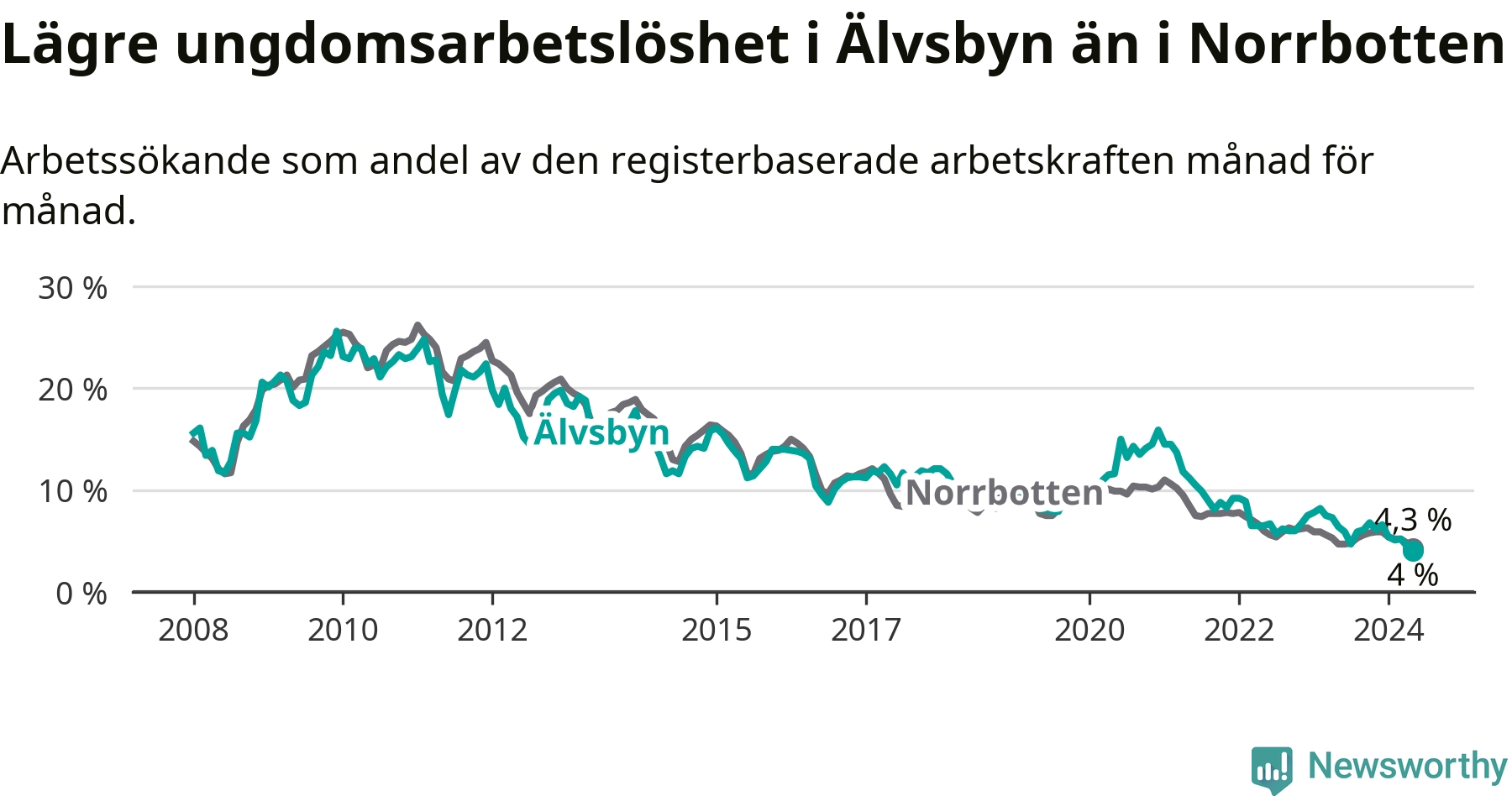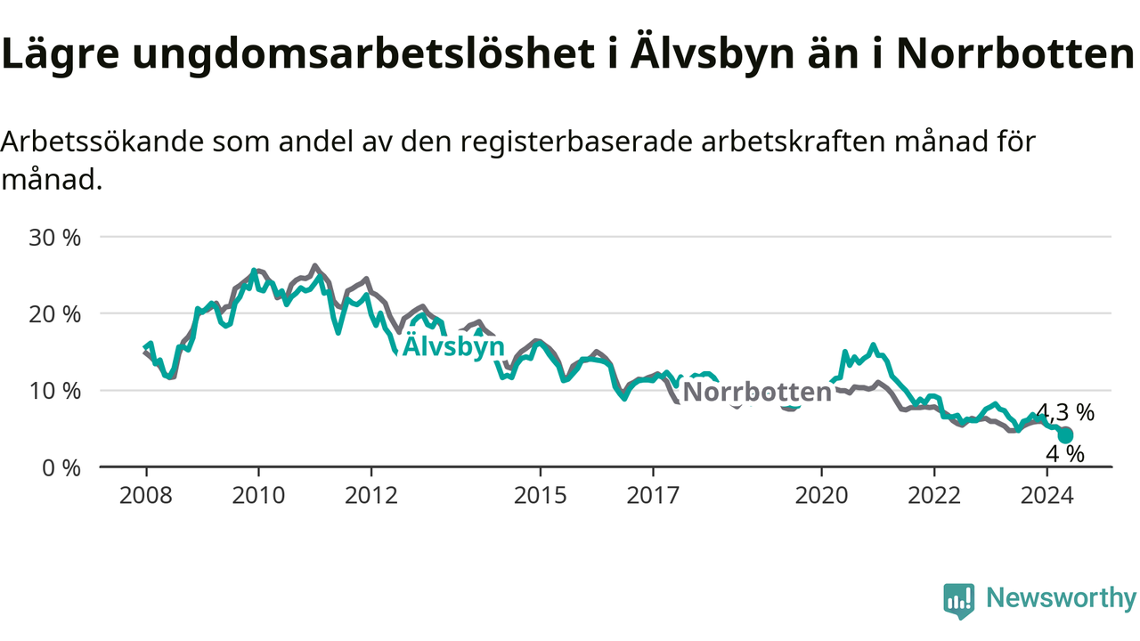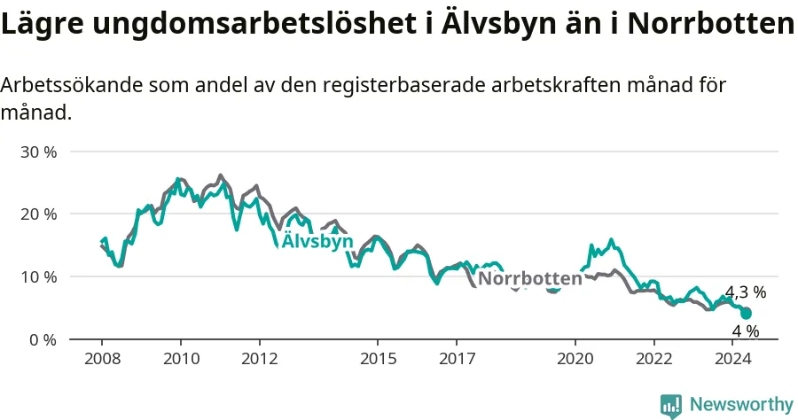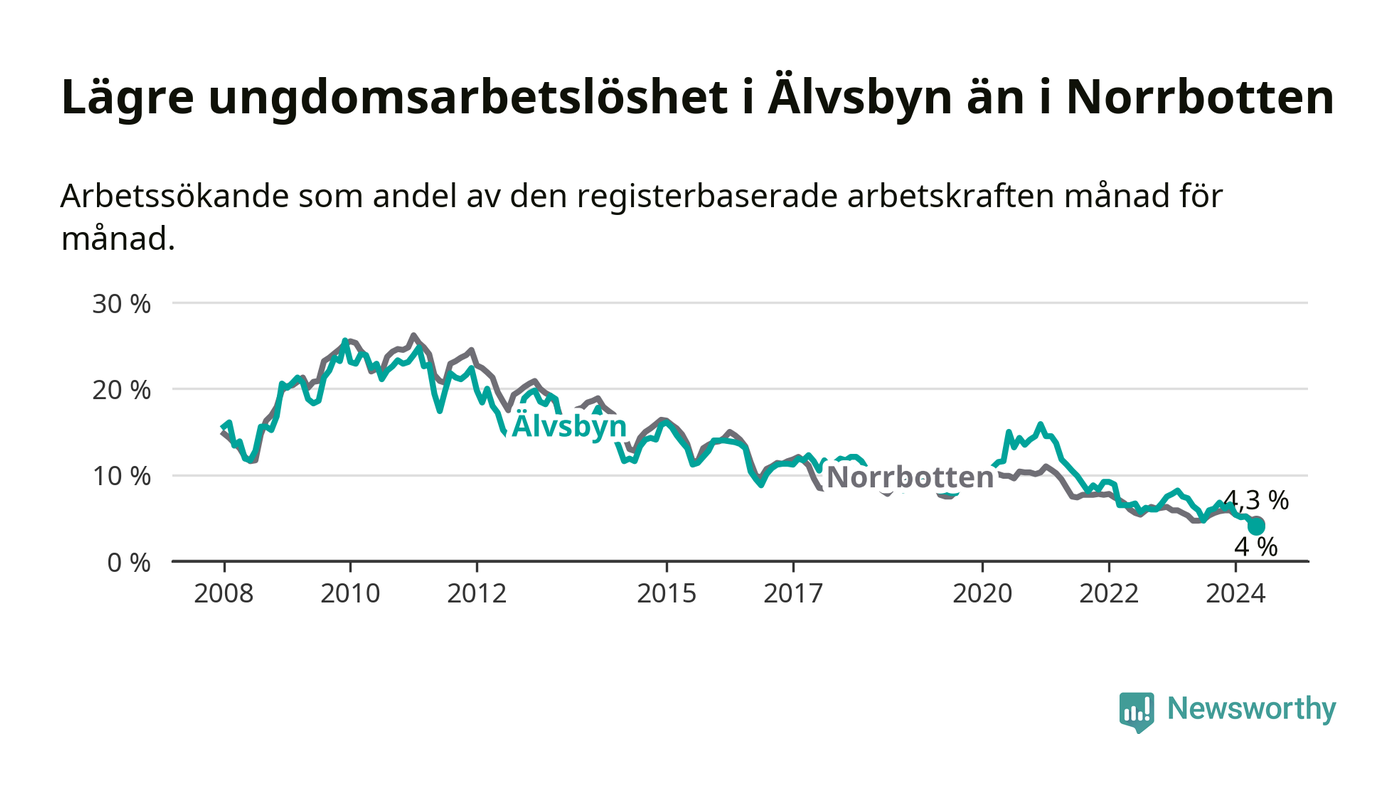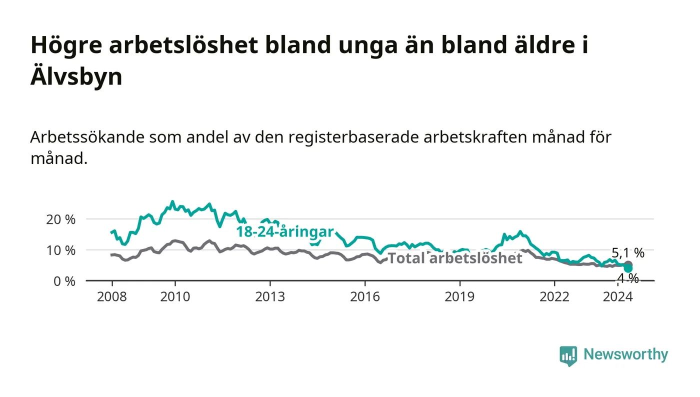 Medan Älvsbyn har högre total arbetslöshet än Norrbotten, ligger ungdomsarbetslösheten 0,3 procentenheter lägre i Älvsbyn.