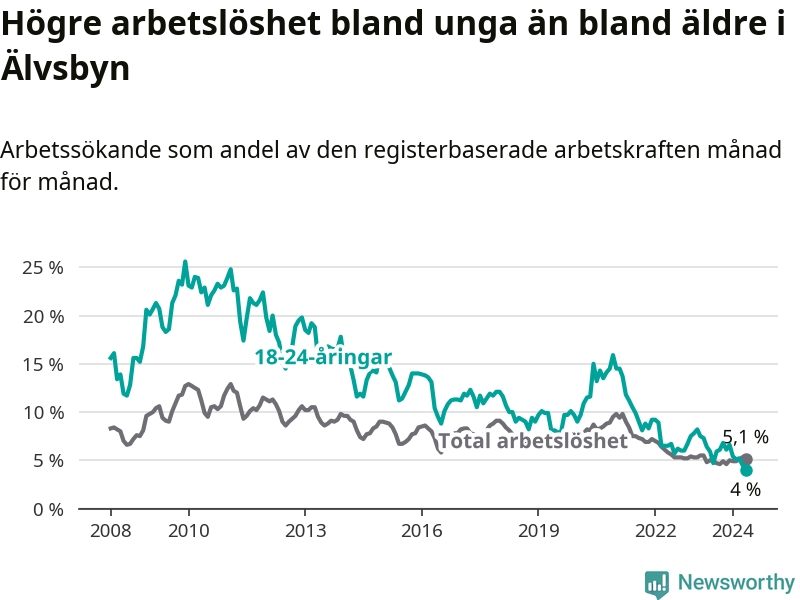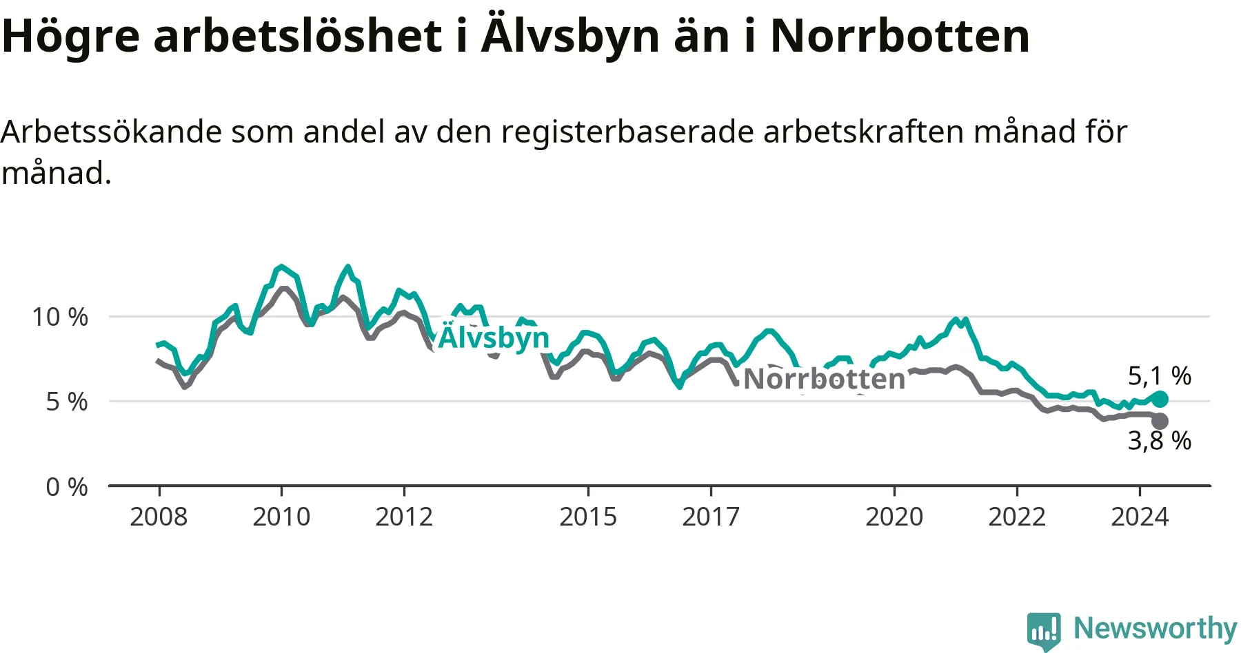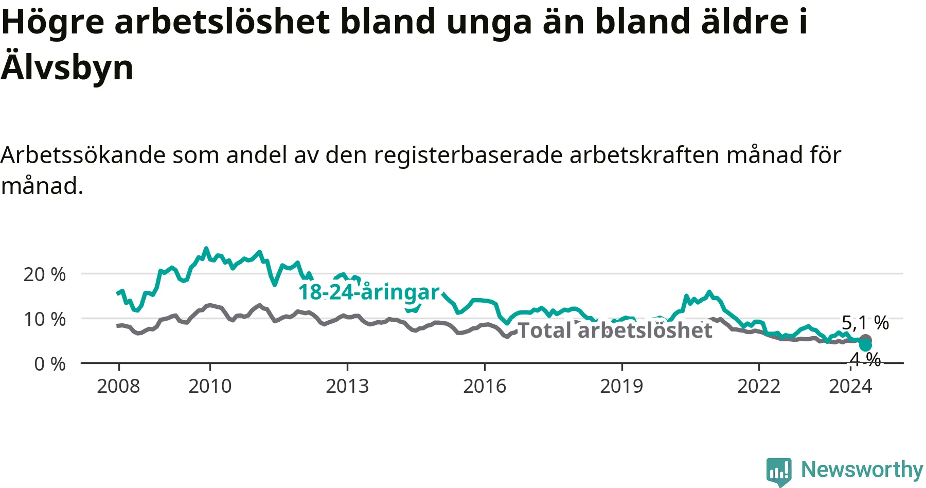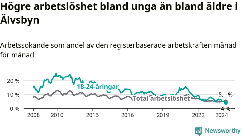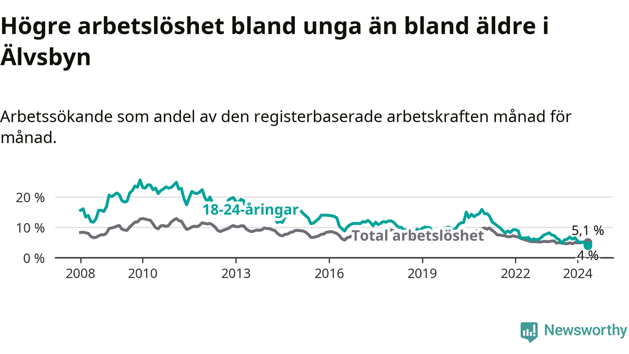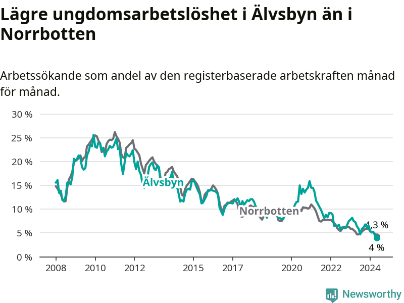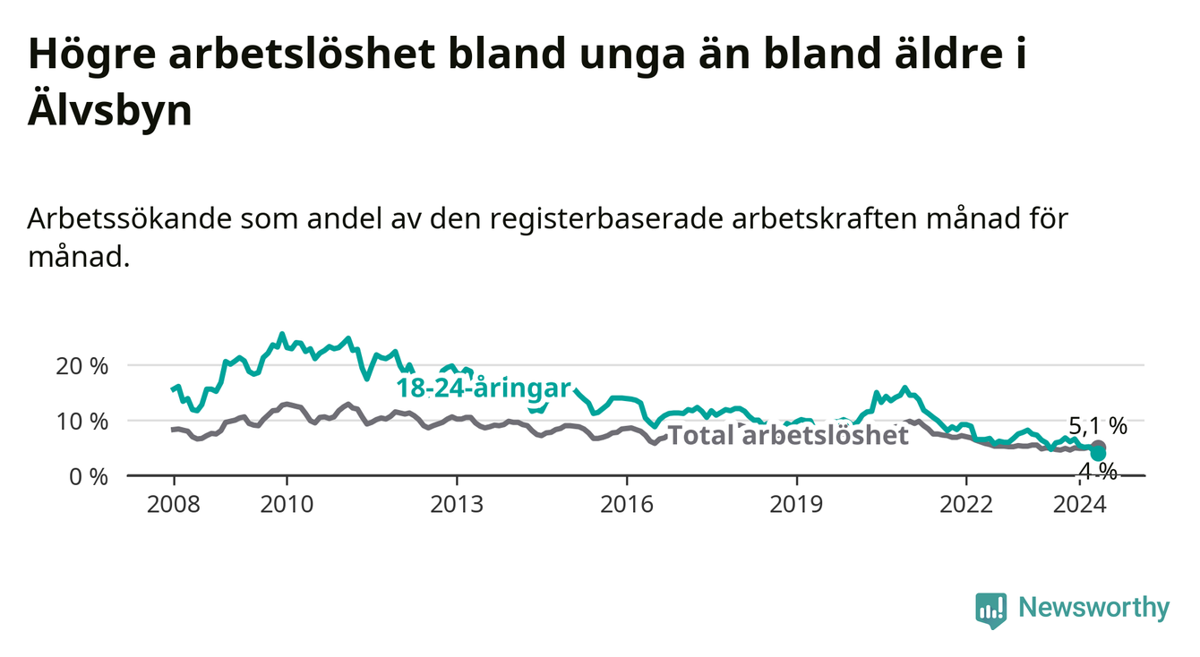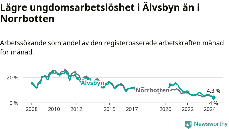 Medan Älvsbyn har högre total arbetslöshet än Norrbotten, ligger ungdomsarbetslösheten 0,3 procentenheter lägre i Älvsbyn.