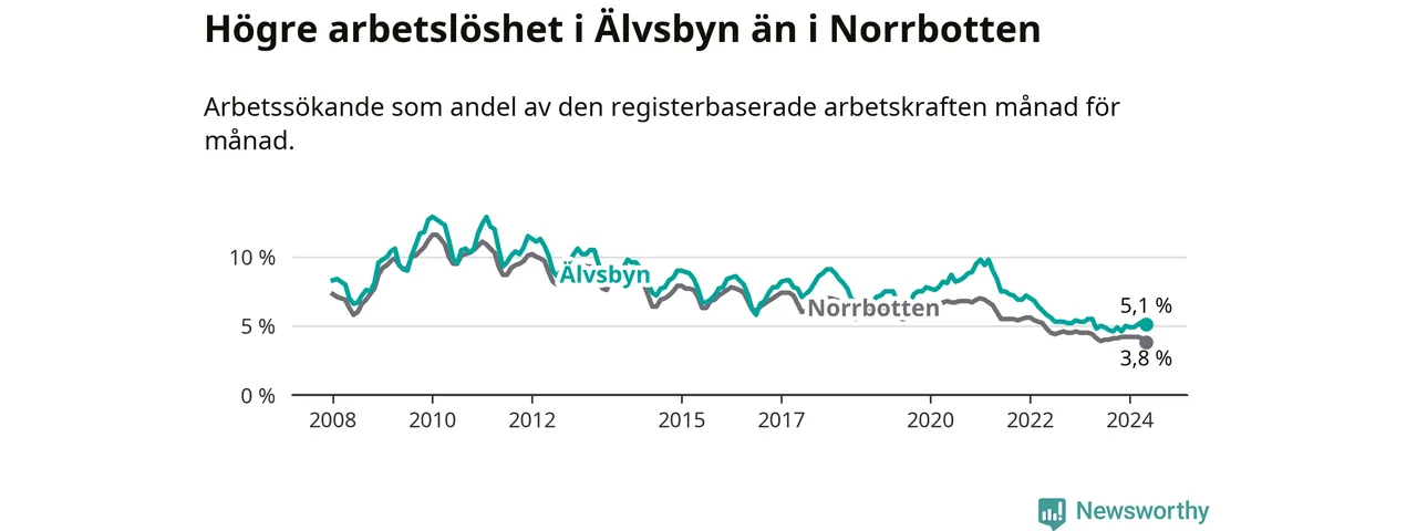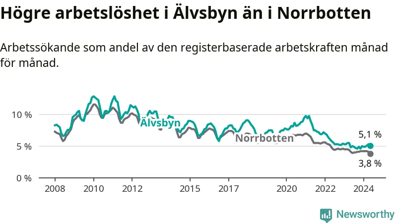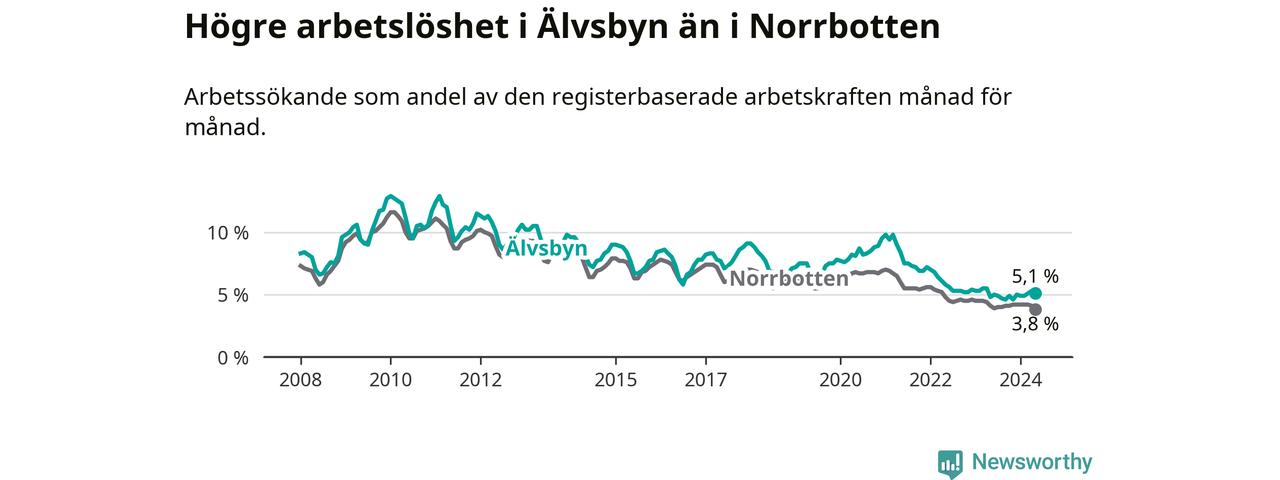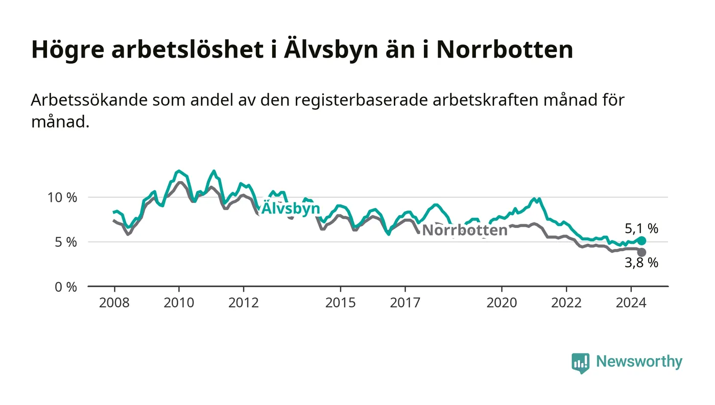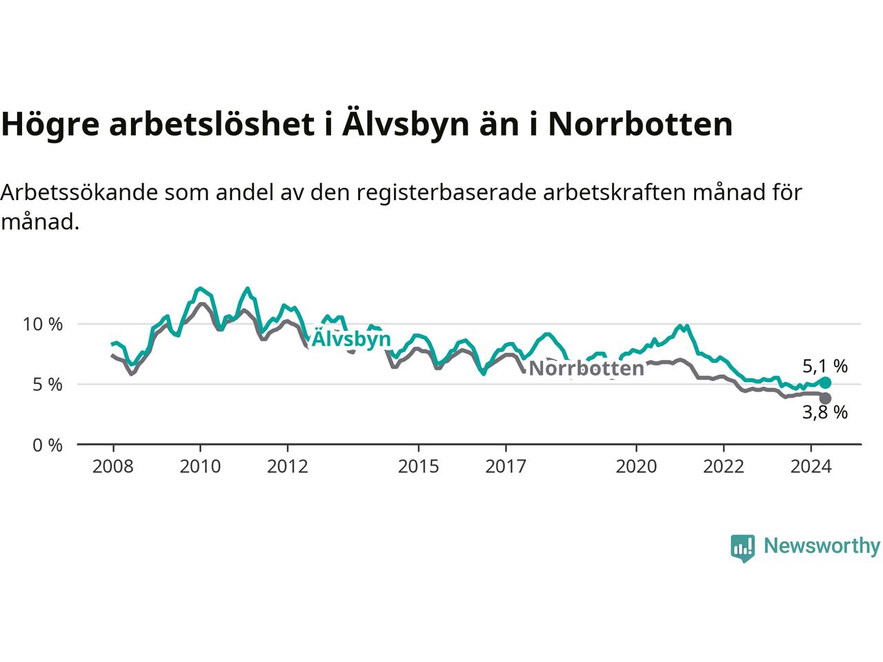 Under maj månad rapporterade Älvsbyns kommun en total arbetslöshet på 5,1 procent. Det är en ökning jämfört med samma tidpunkt i fjol (+0,3 procentenheter). I Norrbottens län däremot sjunker arbetslösheten .