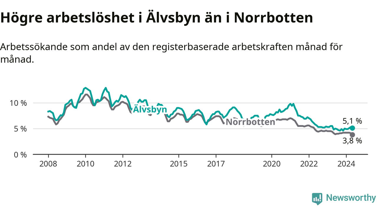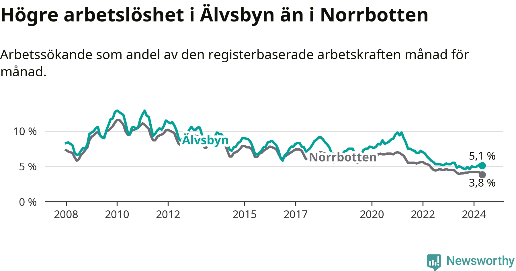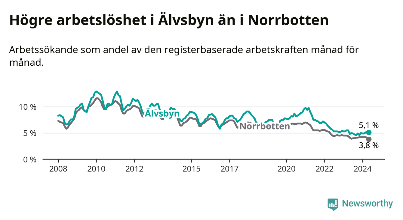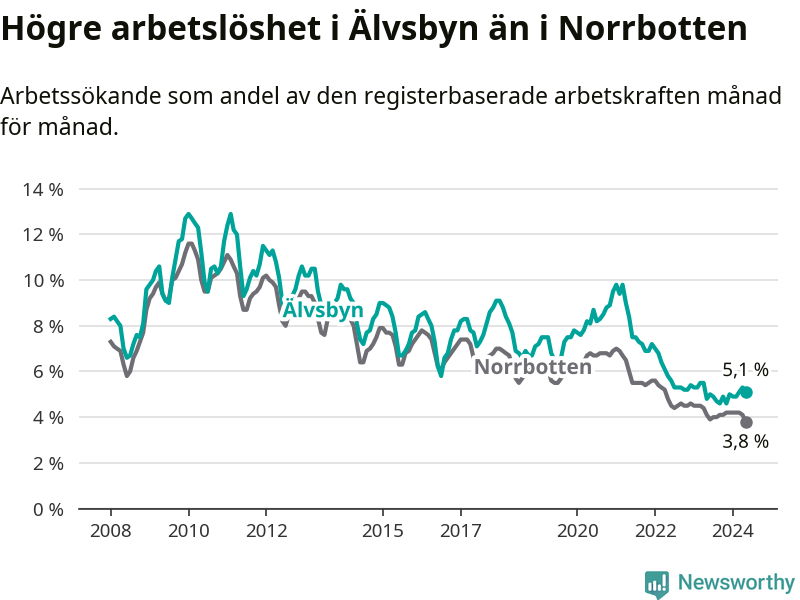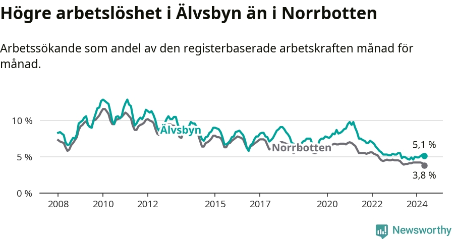 Under maj månad rapporterade Älvsbyns kommun en total arbetslöshet på 5,1 procent. Det är en ökning jämfört med samma tidpunkt i fjol (+0,3 procentenheter). I Norrbottens län däremot sjunker arbetslösheten .
