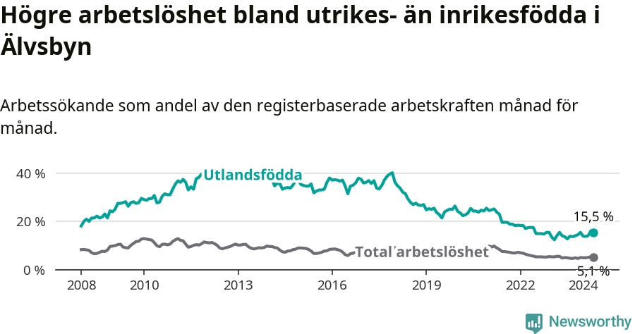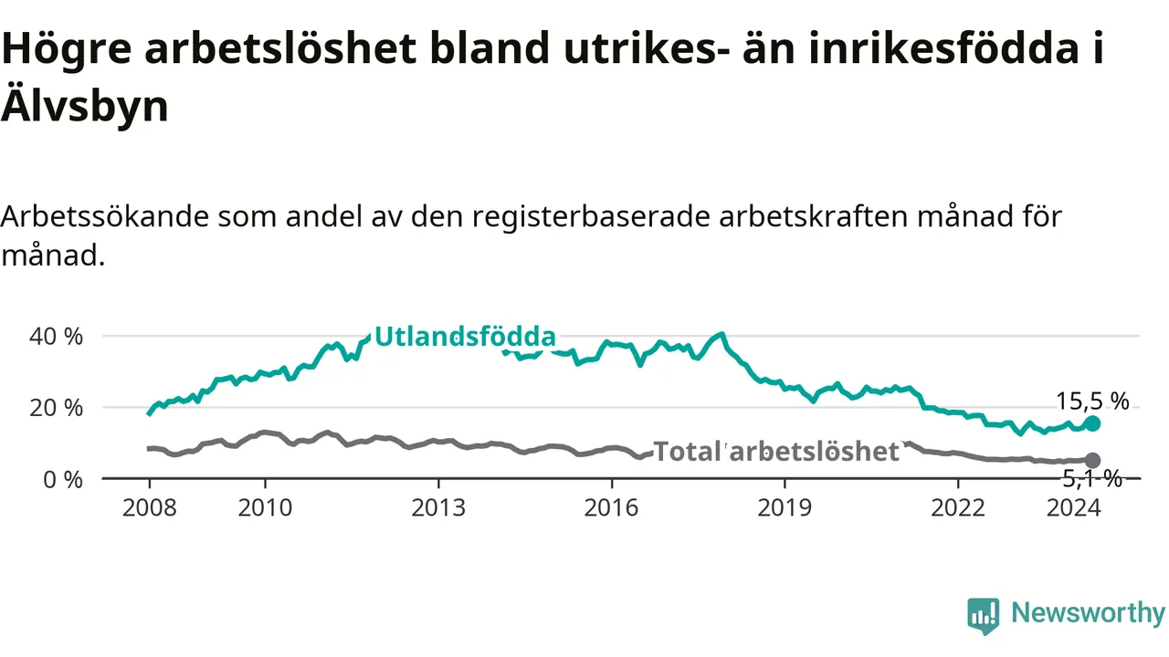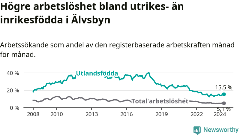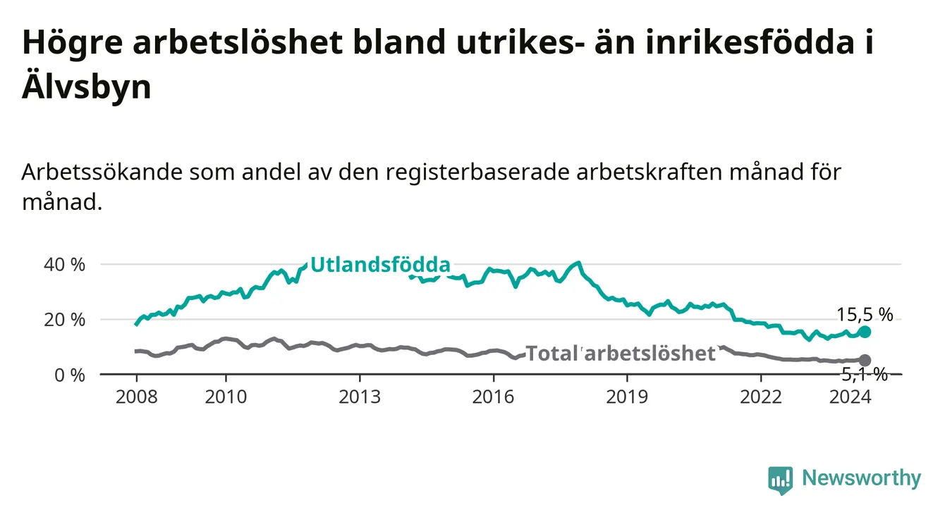 Efter uppgången i arbetslöshet bland utlandsfödda har Älvsbyn nu den högsta arbetslösheten i Norrbotten. Kiruna har lägst arbetslöshet i länet bland personer födda i ett annat land (4,9 procent).