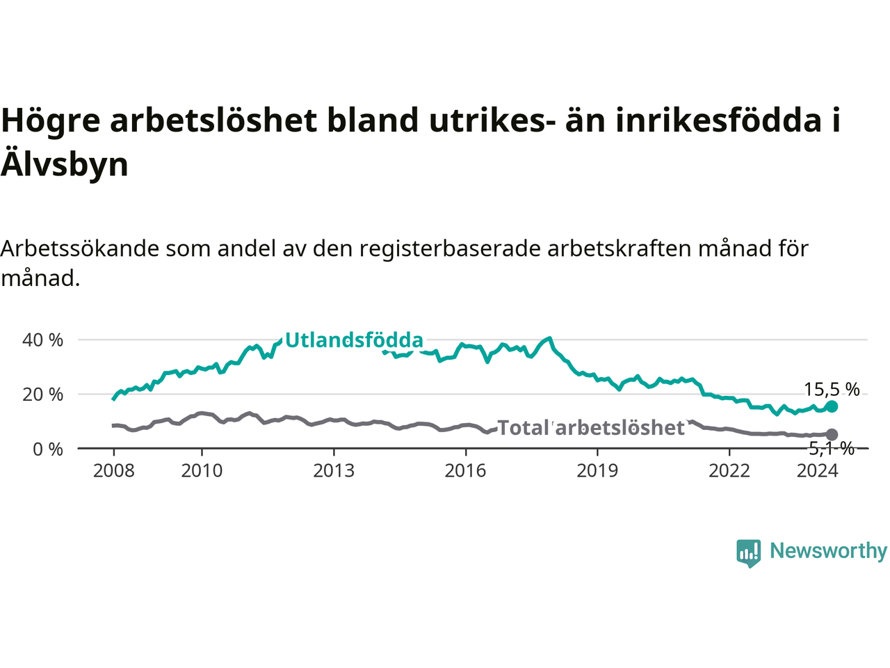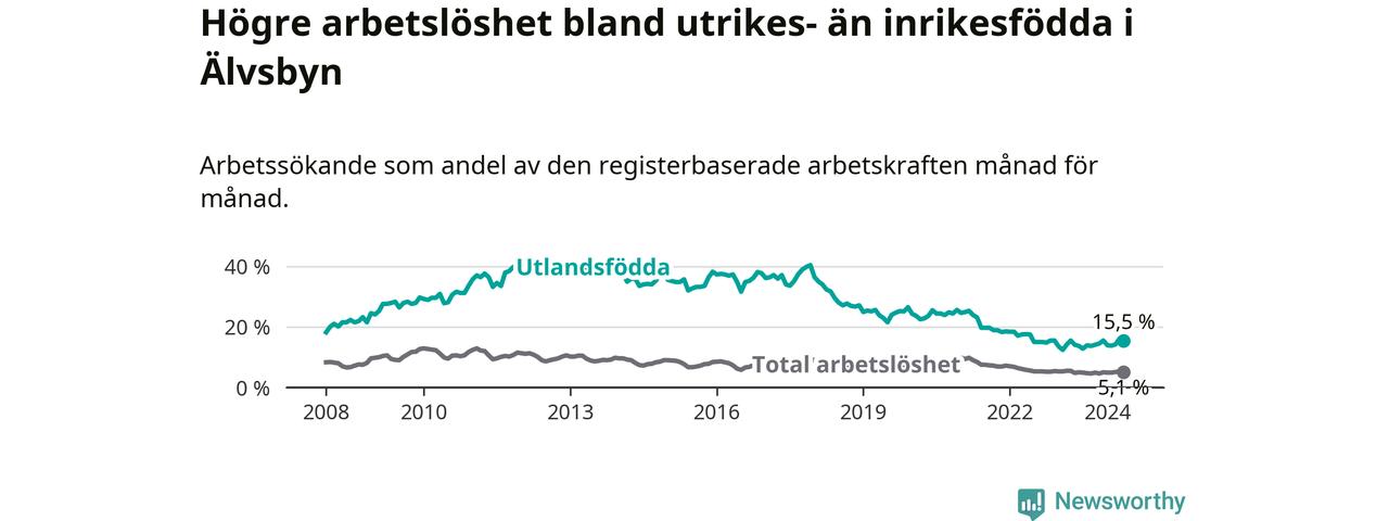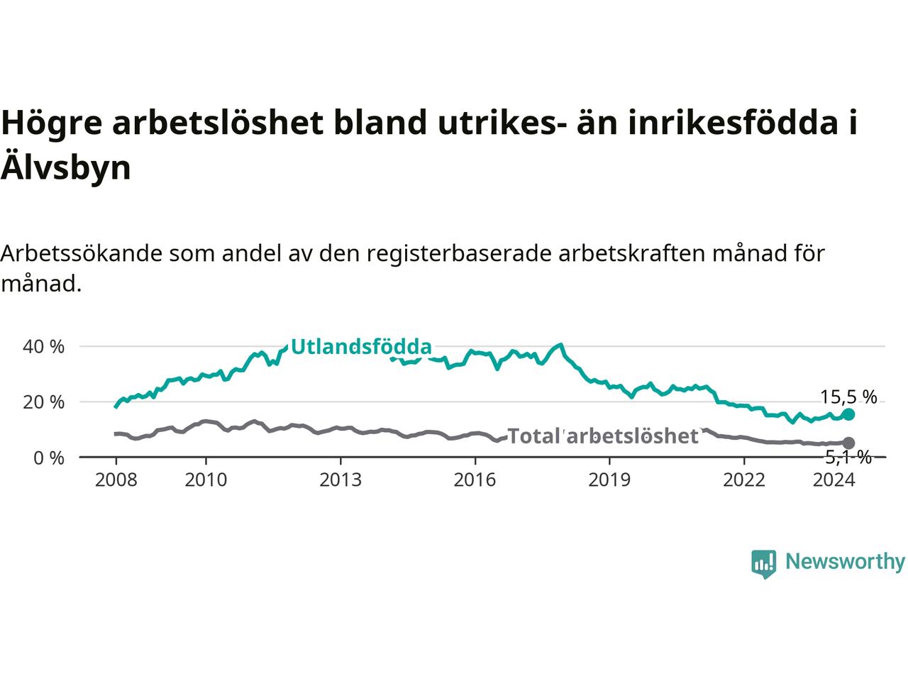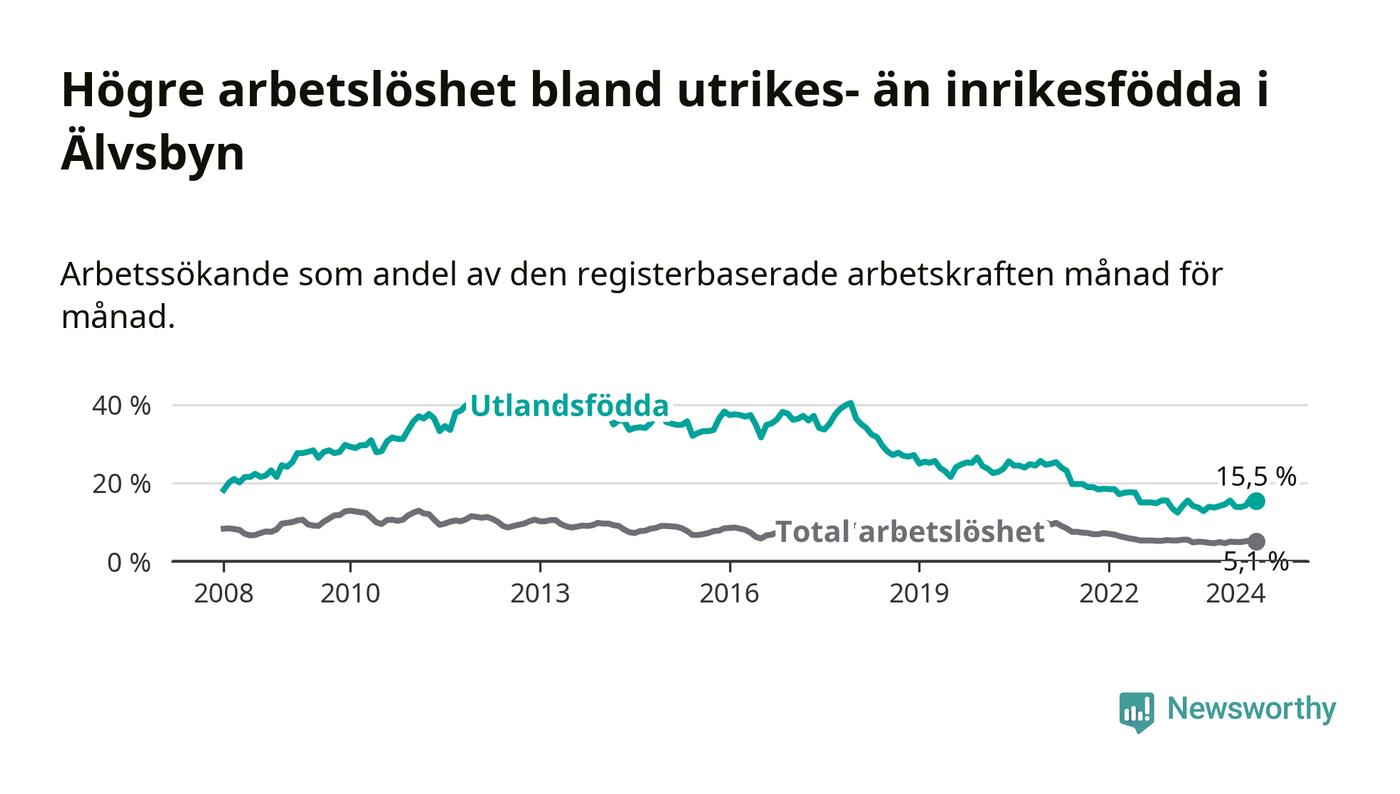 Arbetslösheten bland utlandsfödda var 15,5 procent i Älvsbyn under maj månad, motsvarande 74 av 477 personer. Det är 1,4 procentenheter fler än vid samma tidpunkt i fjol (+11 om man räknar personer).