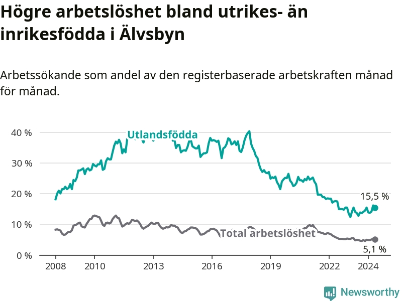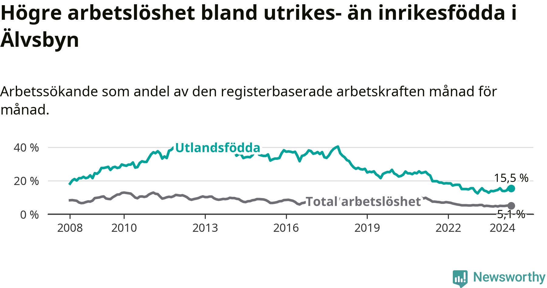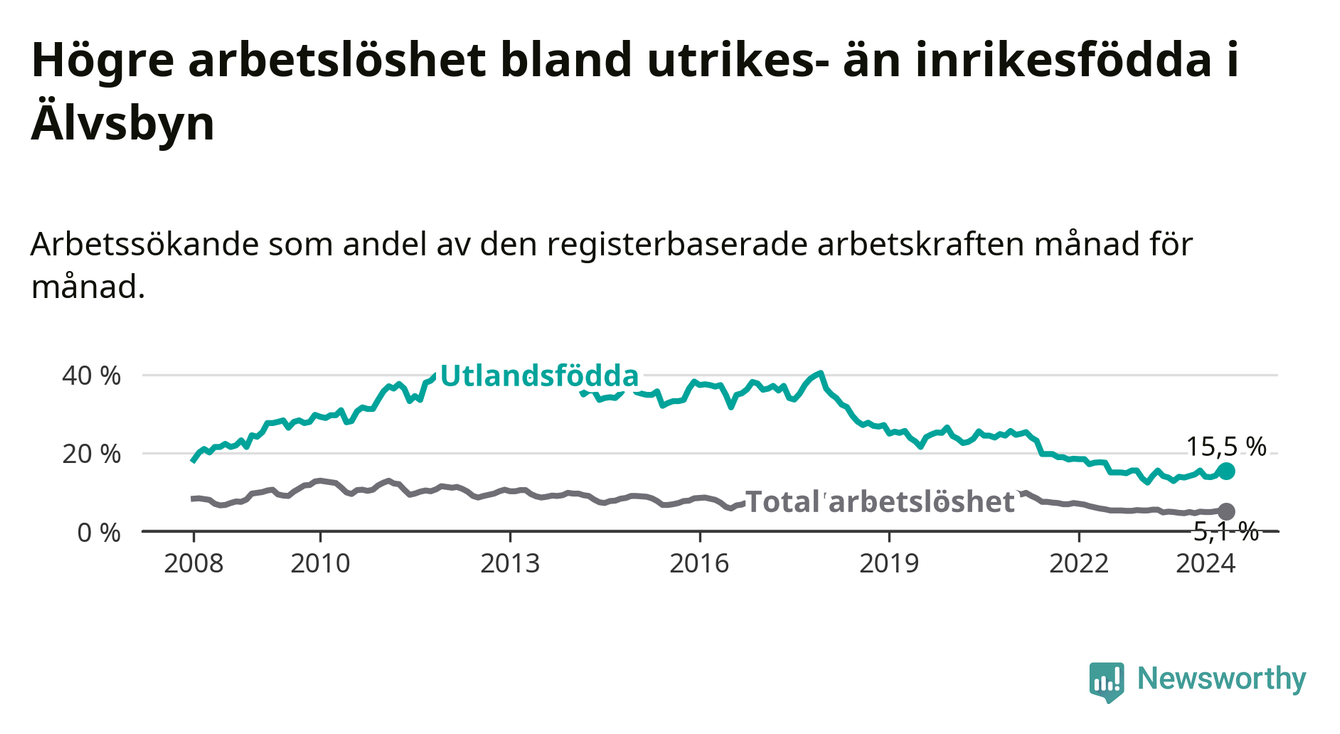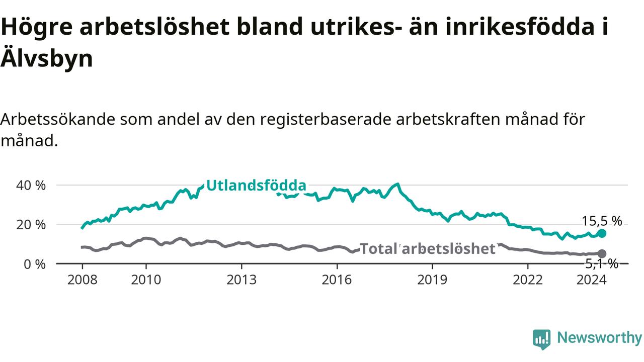 Arbetslösheten bland utlandsfödda var 15,5 procent i Älvsbyn under maj månad, motsvarande 74 av 477 personer. Det är 1,4 procentenheter fler än vid samma tidpunkt i fjol (+11 om man räknar personer).
