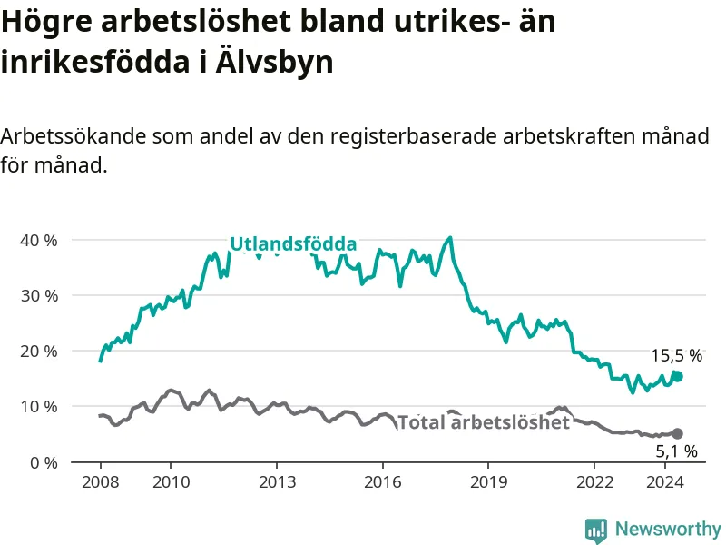 Skillnaden i arbetslöshet mellan utrikesfödda och hela befolkningen är 10,4 procentenheter i Älvsbyn. Det är en större skillnad än för ett år sedan (+1,1 procentenheter).