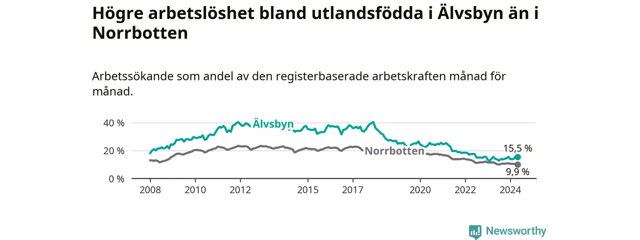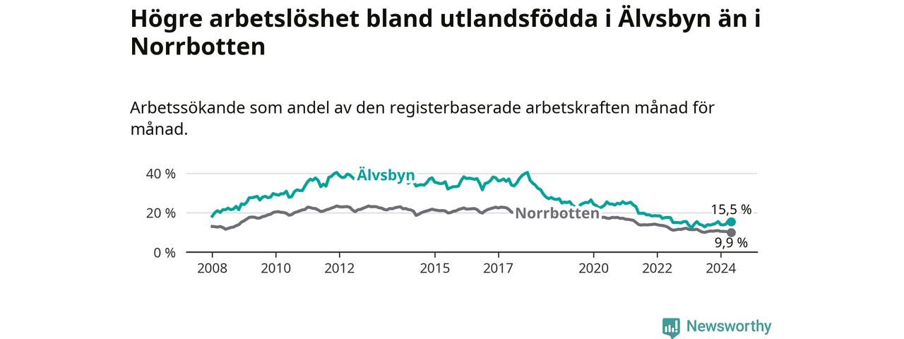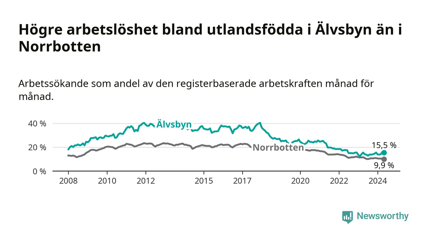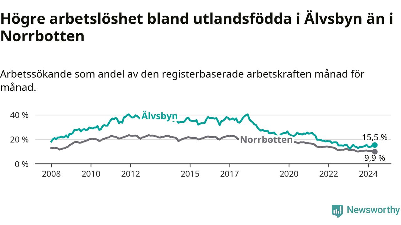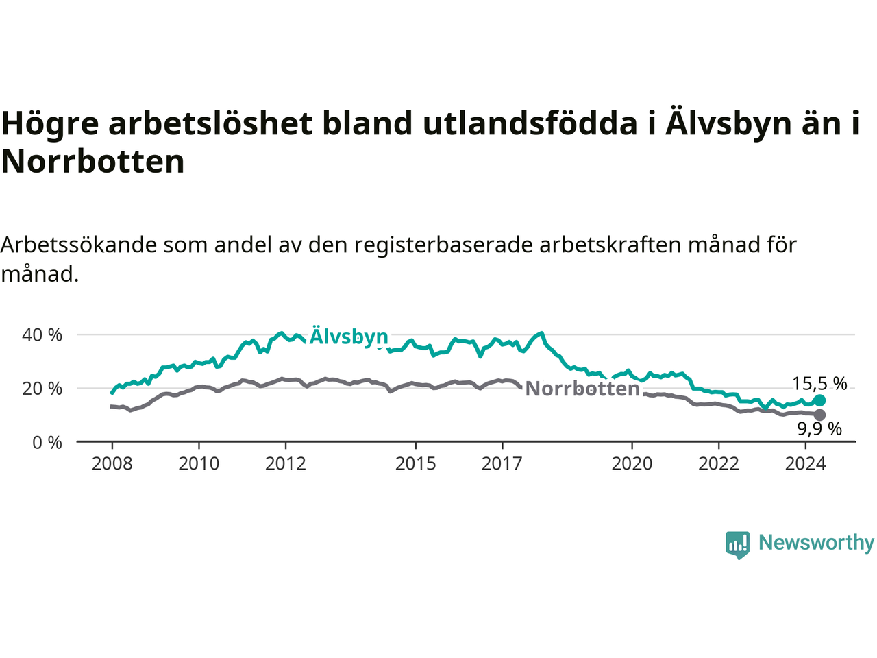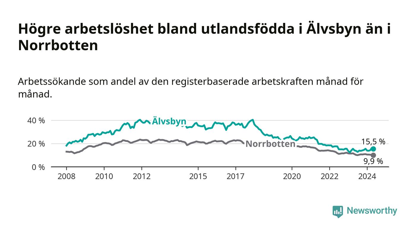 Medan arbetslösheten bland utlandsfödda alltså ökar i Älvsbyn så minskar den i Norrbotten. Jämfört med maj förra året har andelen arbetslösa utlandsfödda i länet minskat med 1,0 procentenheter (till 9,9 procent).
