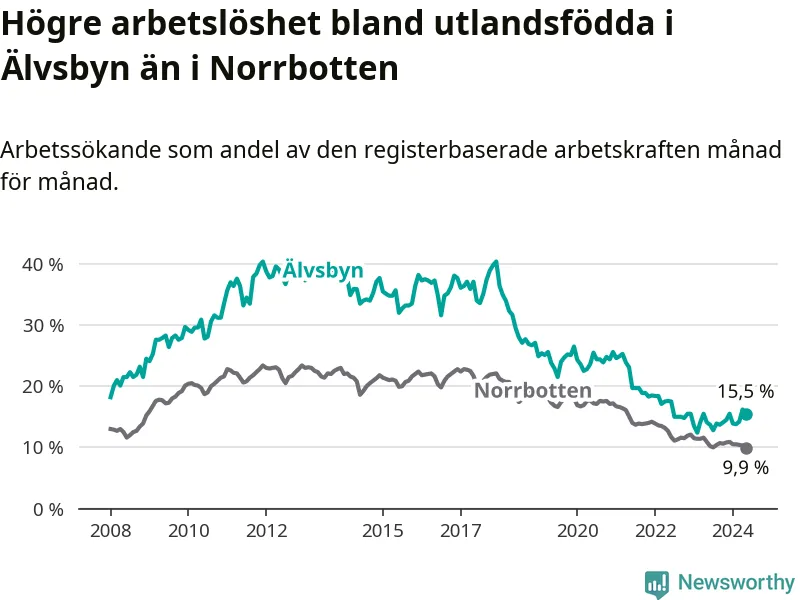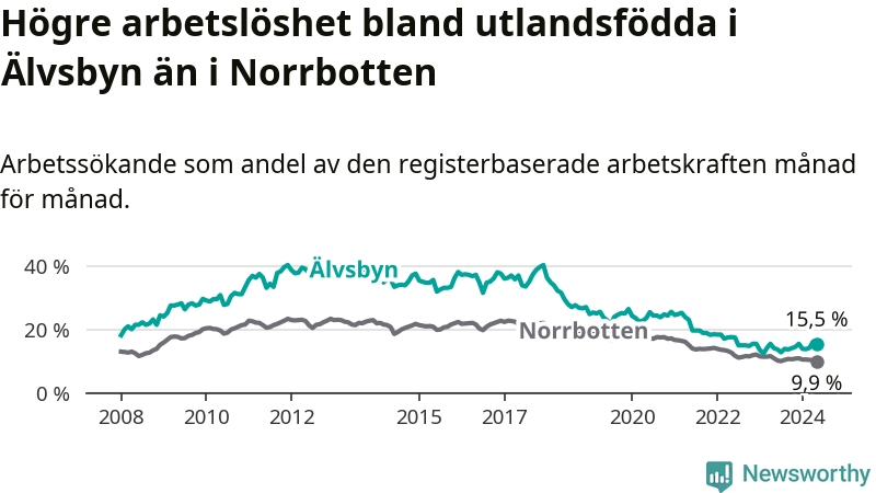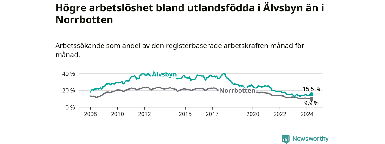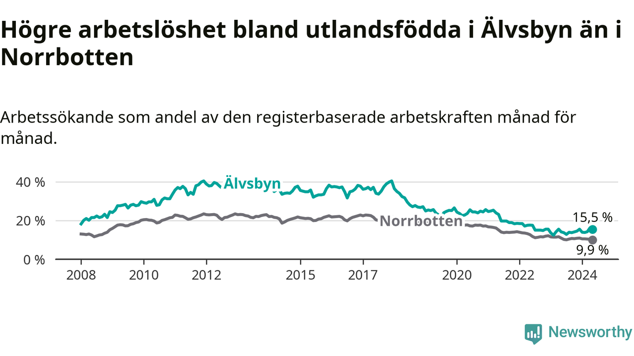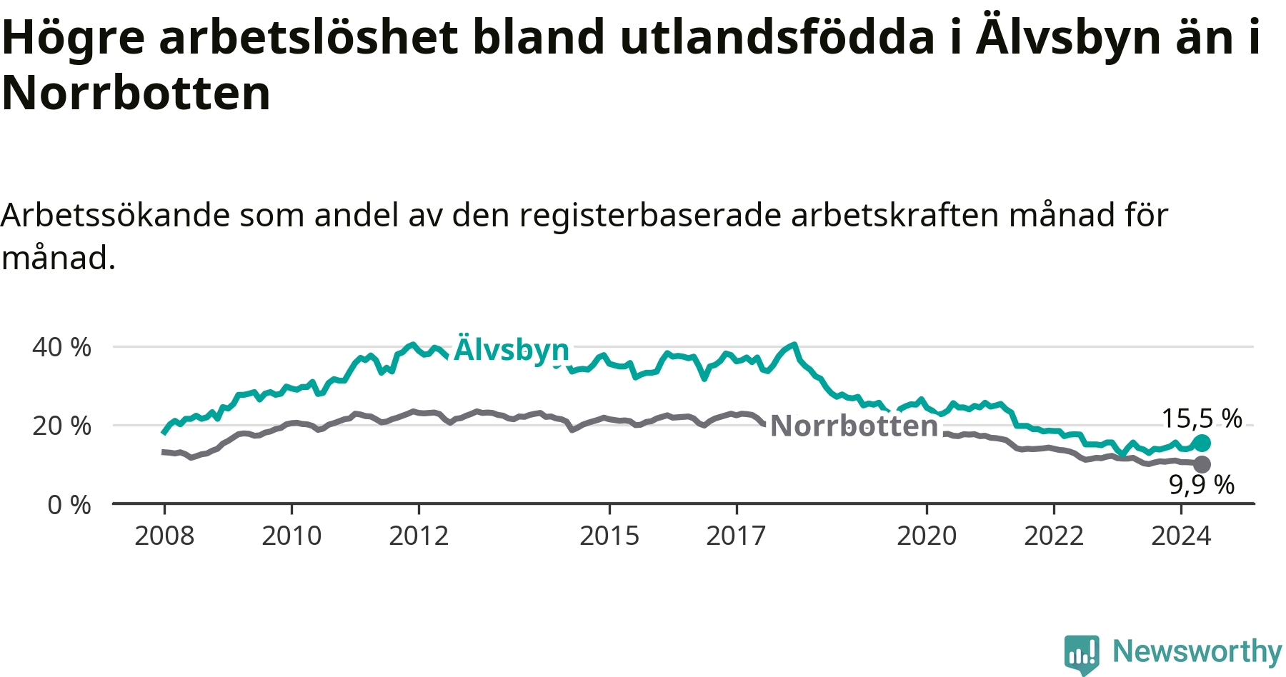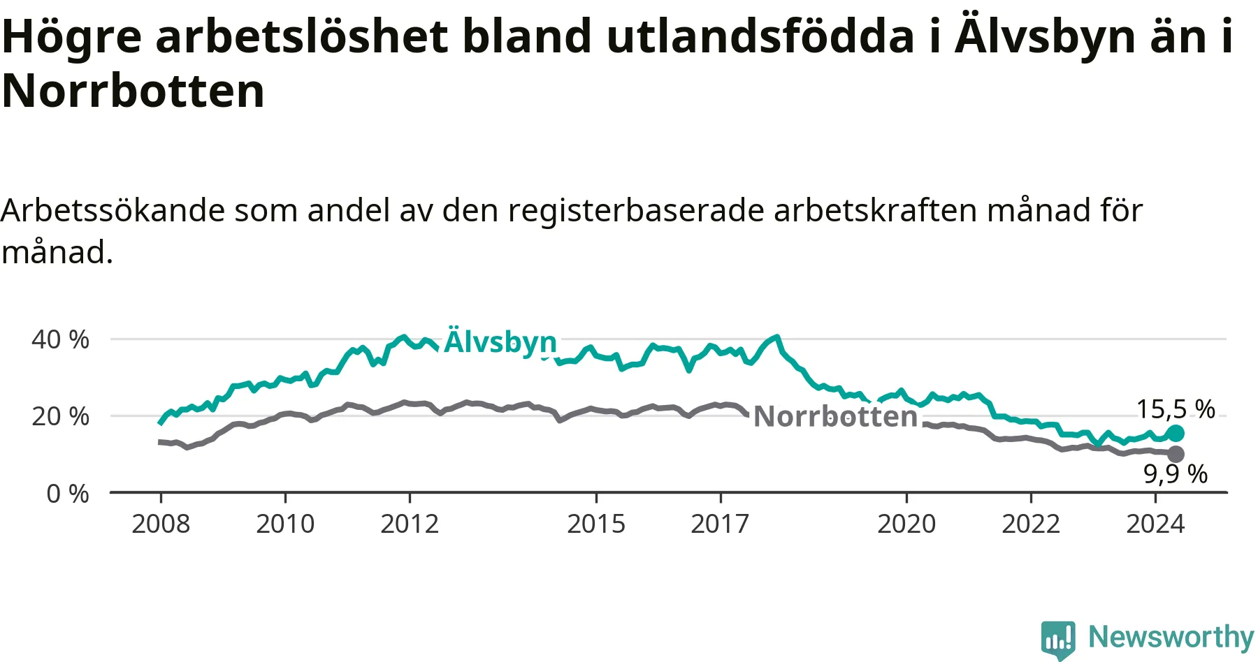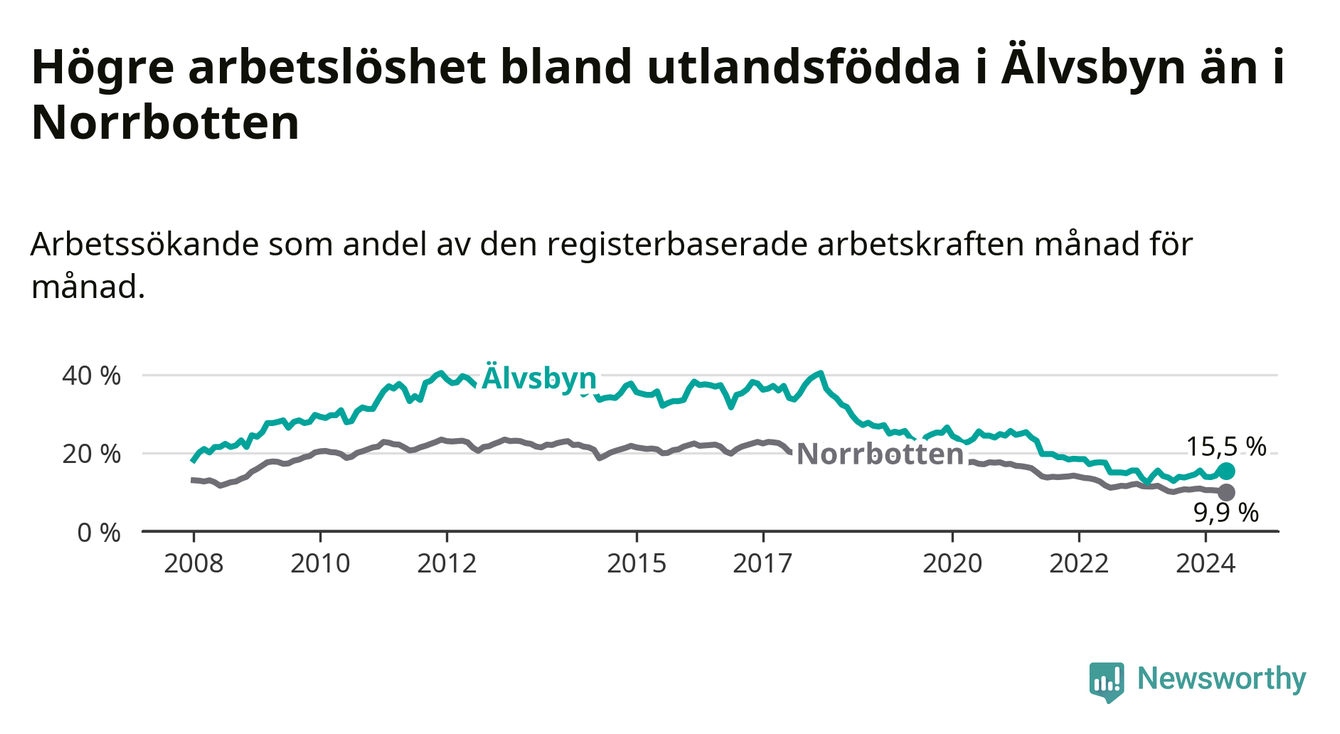 Medan arbetslösheten bland utlandsfödda alltså ökar i Älvsbyn så minskar den i Norrbotten. Jämfört med maj förra året har andelen arbetslösa utlandsfödda i länet minskat med 1,0 procentenheter (till 9,9 procent).