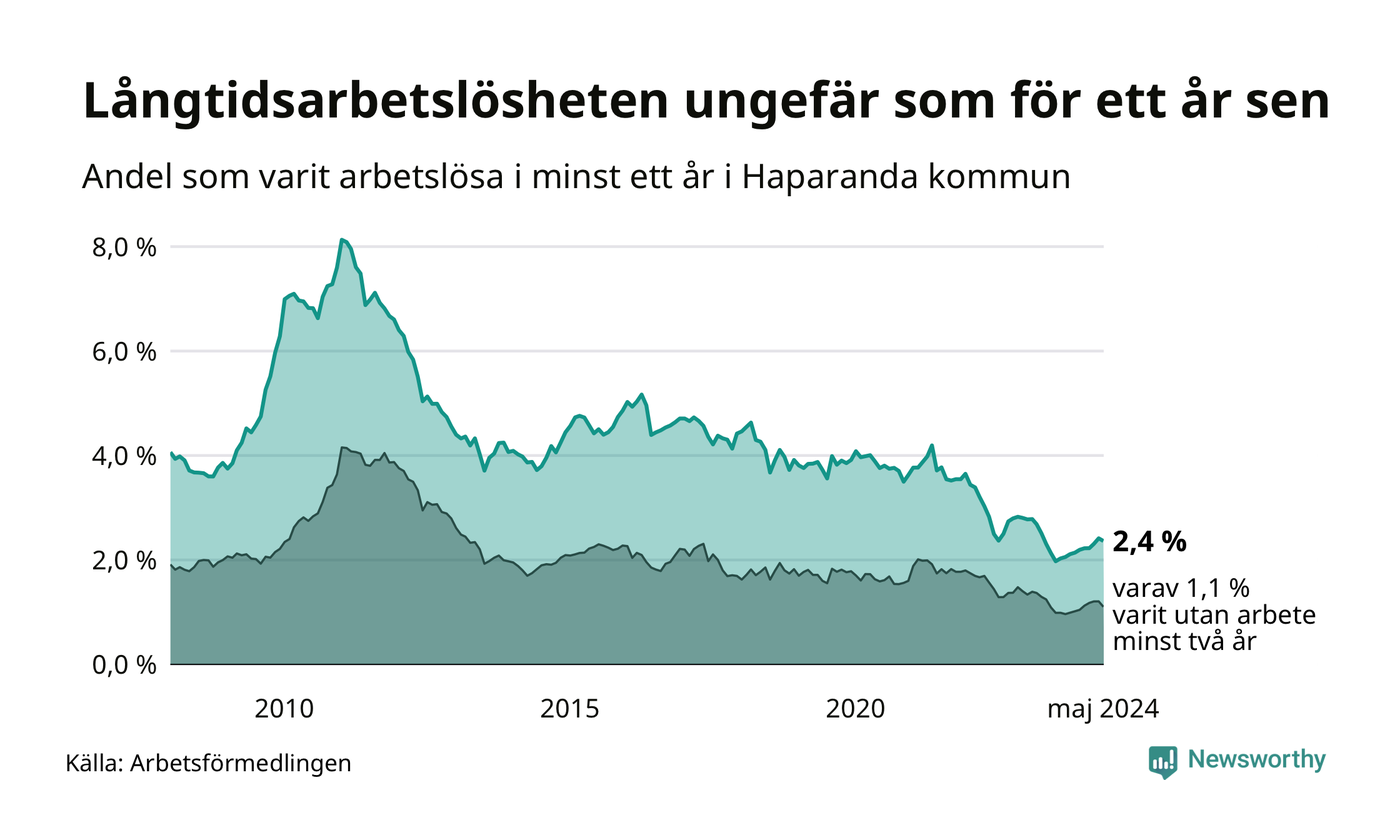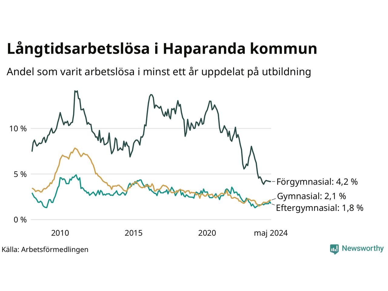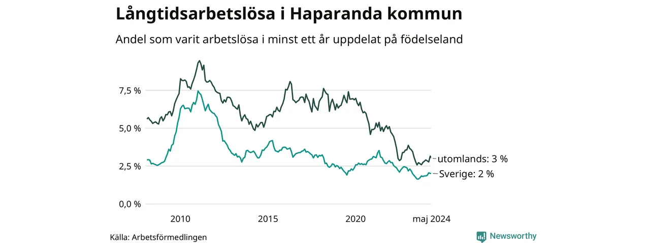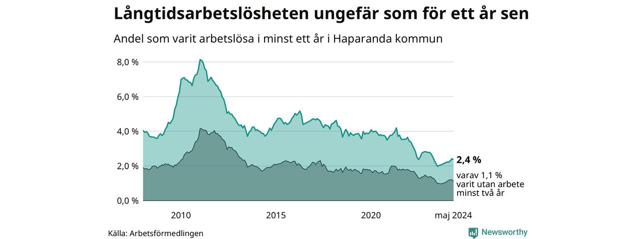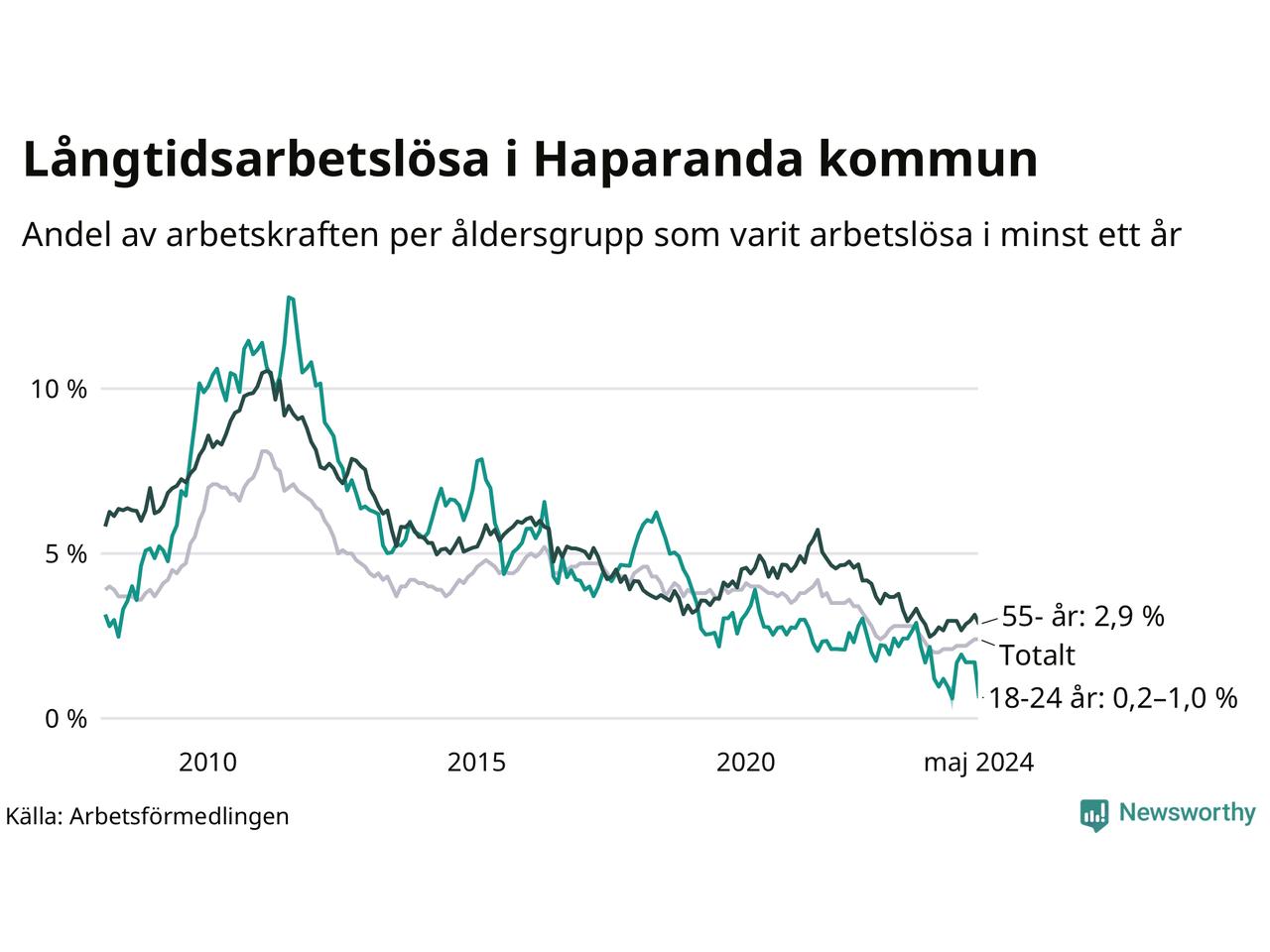 I maj hade 90 Haparandabor varit arbetslösa i minst ett år, vilket är två färre än månaden innan. Det är den första månaden sedan juli 2023 som antalet arbetslösa minskar. 90 personer motsvarar 2,4 procent av arbetskraften i kommunen – andelen långtidsarbetslösa är ungefär på samma nivå som för ett år sedan.