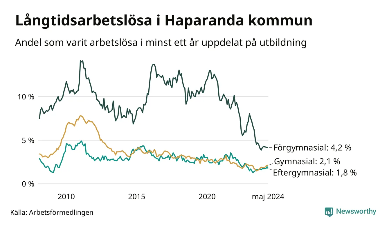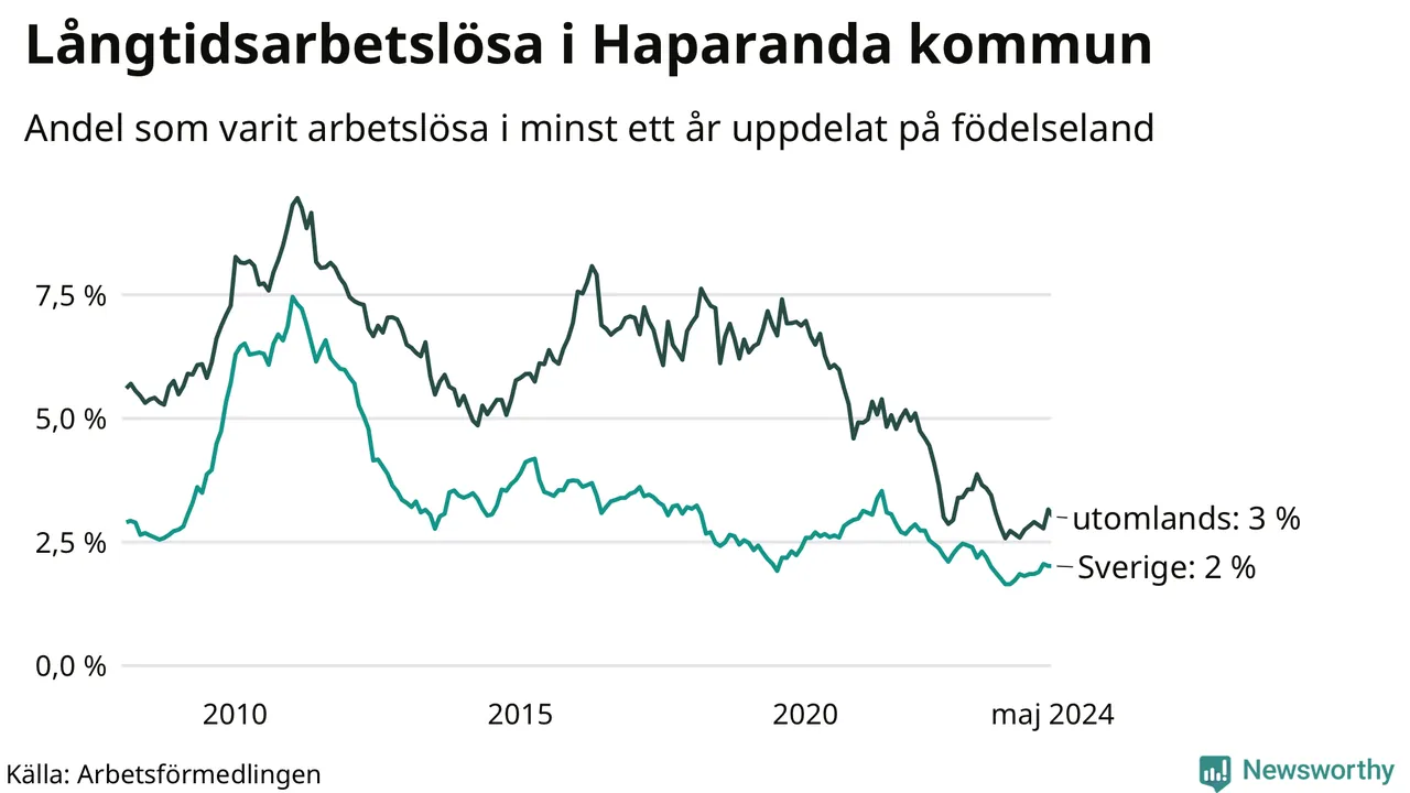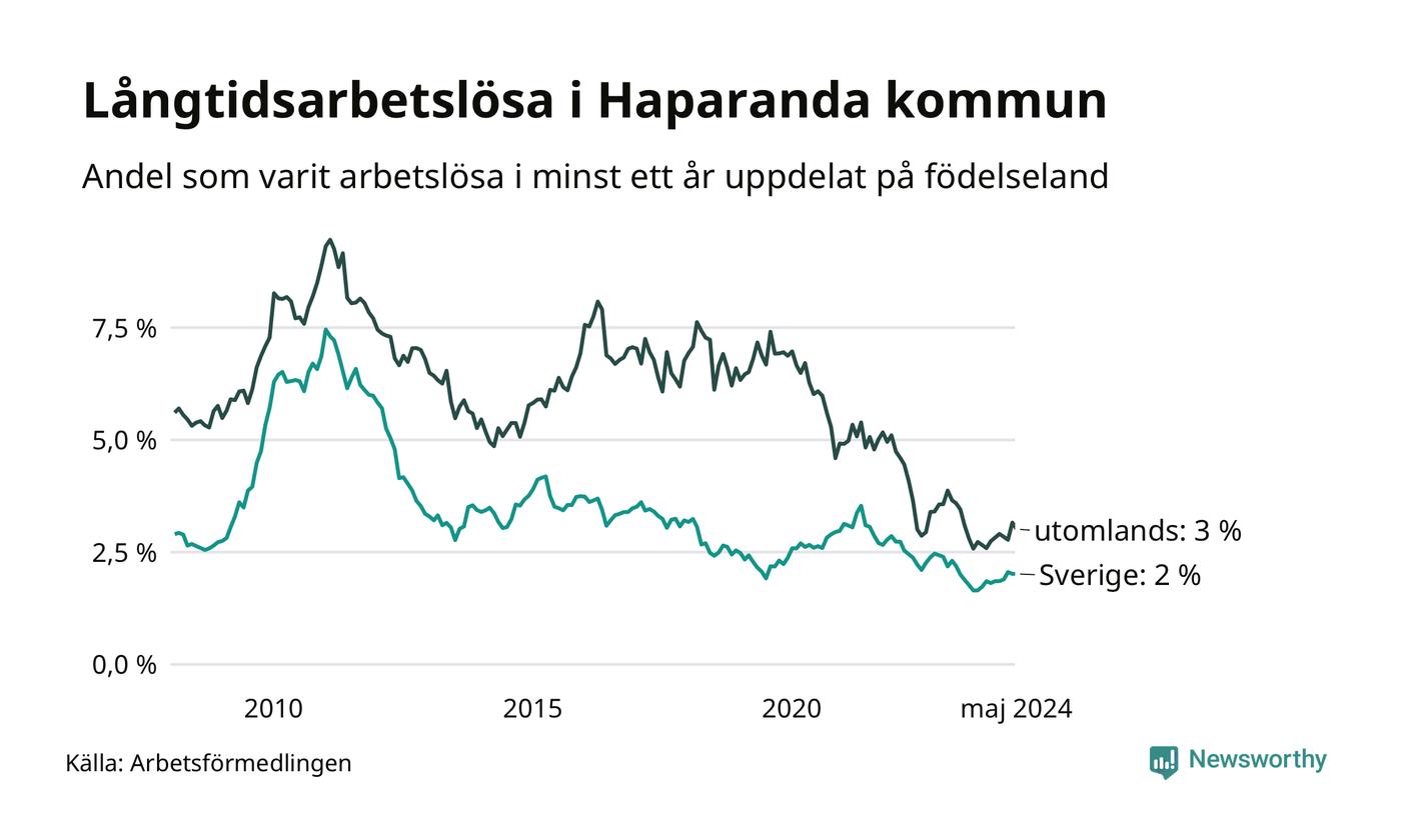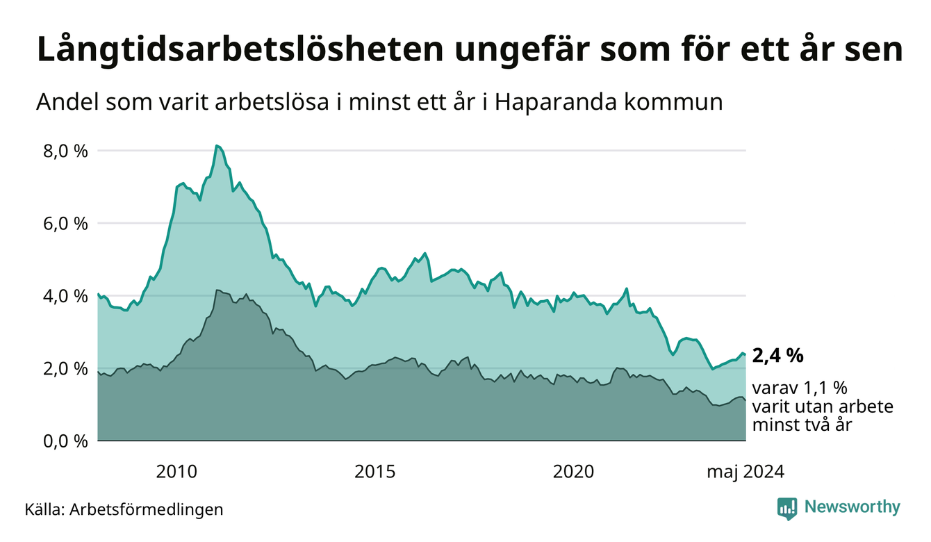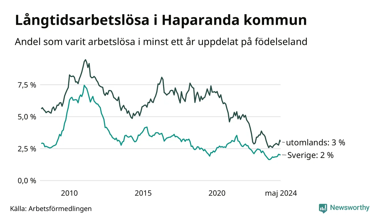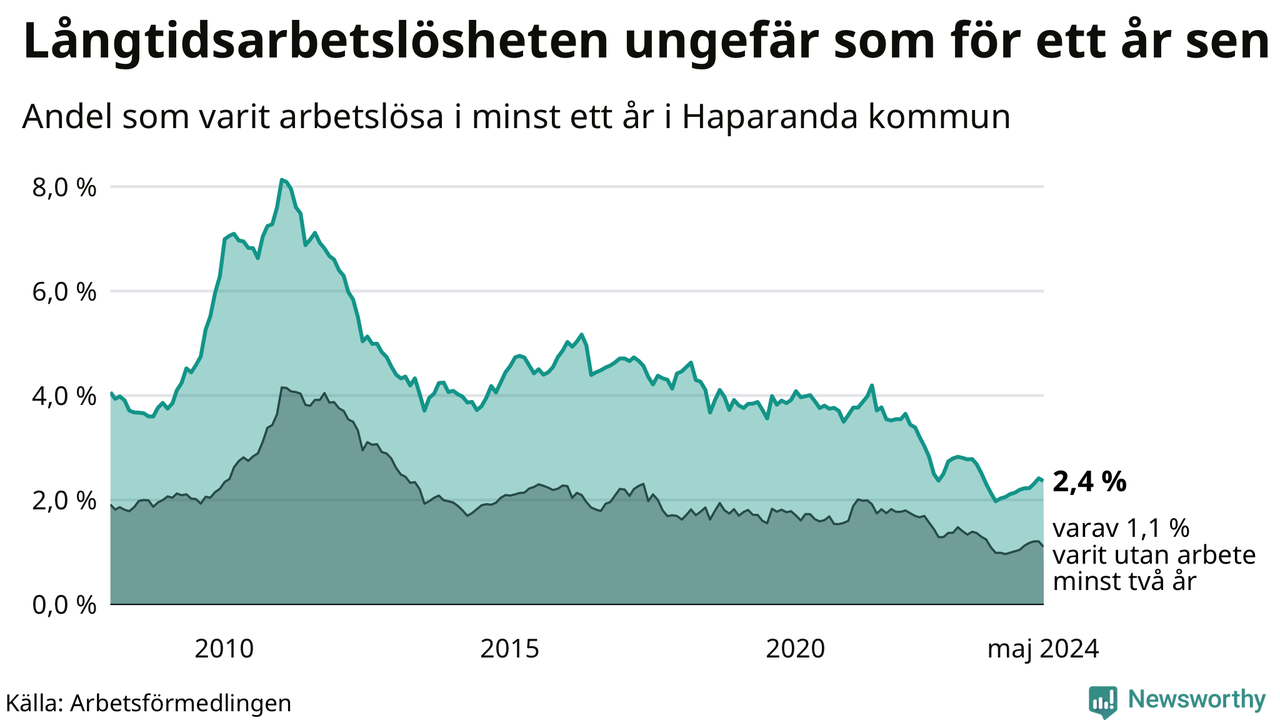 I maj hade 90 Haparandabor varit arbetslösa i minst ett år, vilket är två färre än månaden innan. Det är den första månaden sedan juli 2023 som antalet arbetslösa minskar. 90 personer motsvarar 2,4 procent av arbetskraften i kommunen – andelen långtidsarbetslösa är ungefär på samma nivå som för ett år sedan.