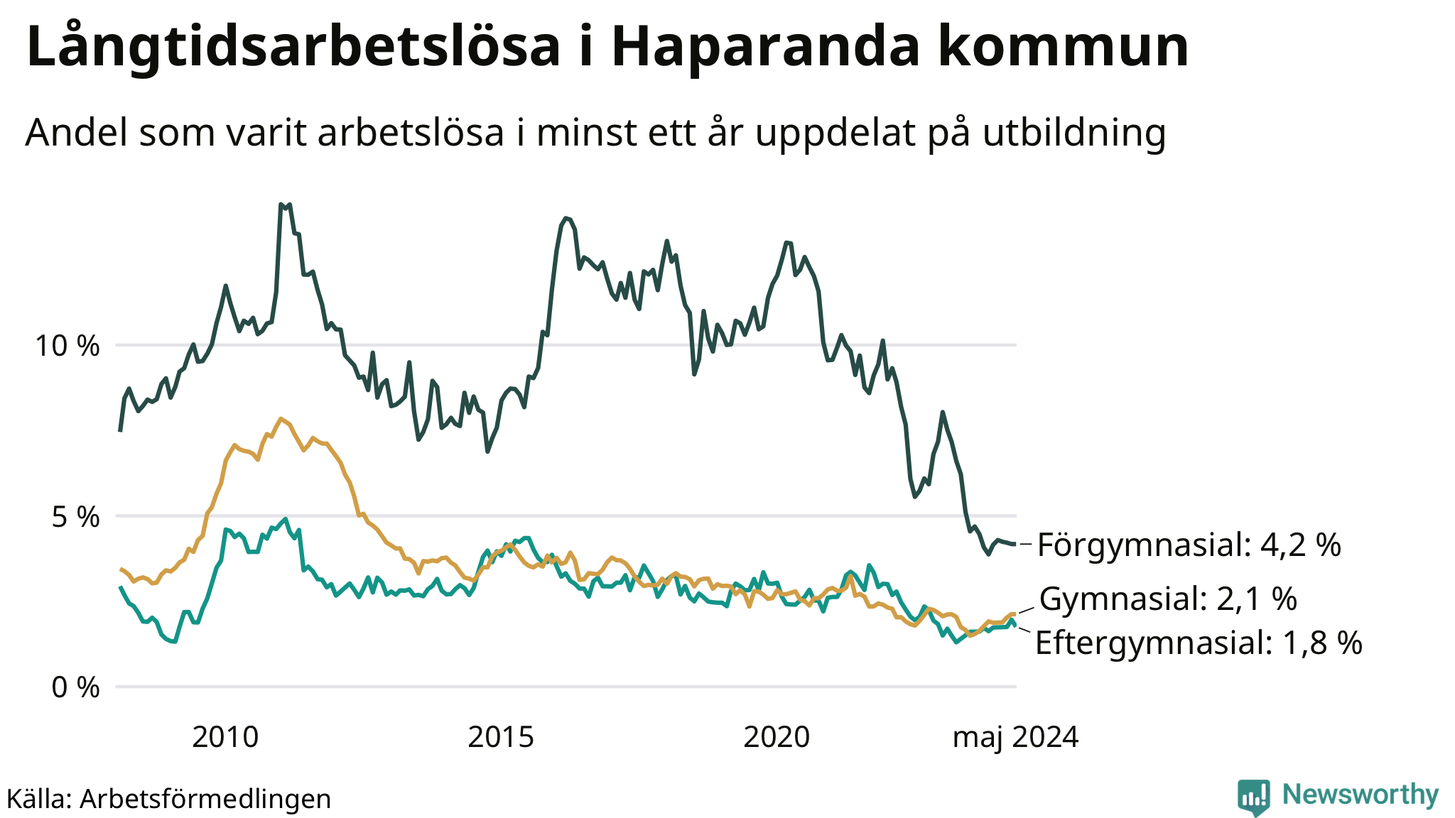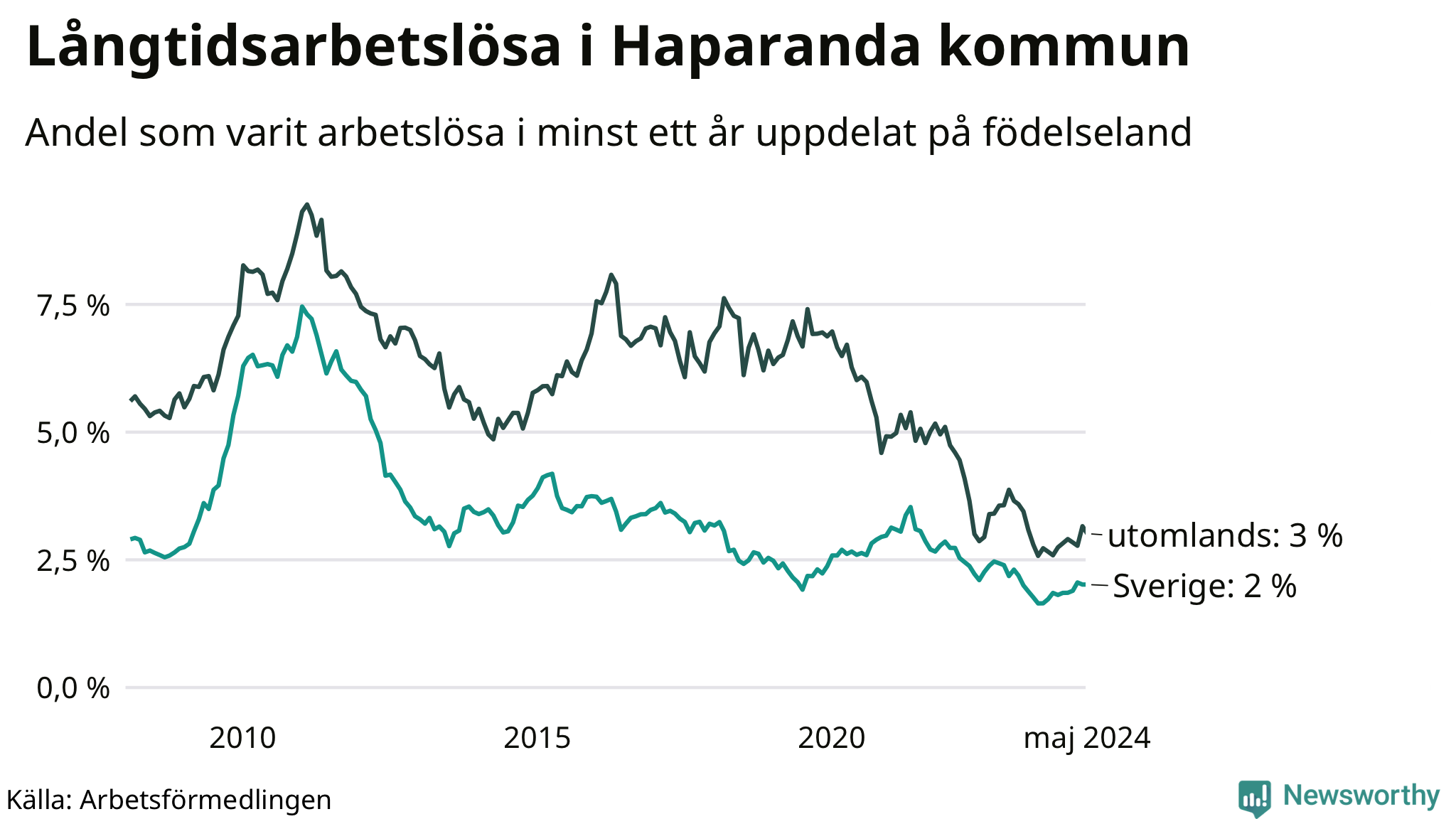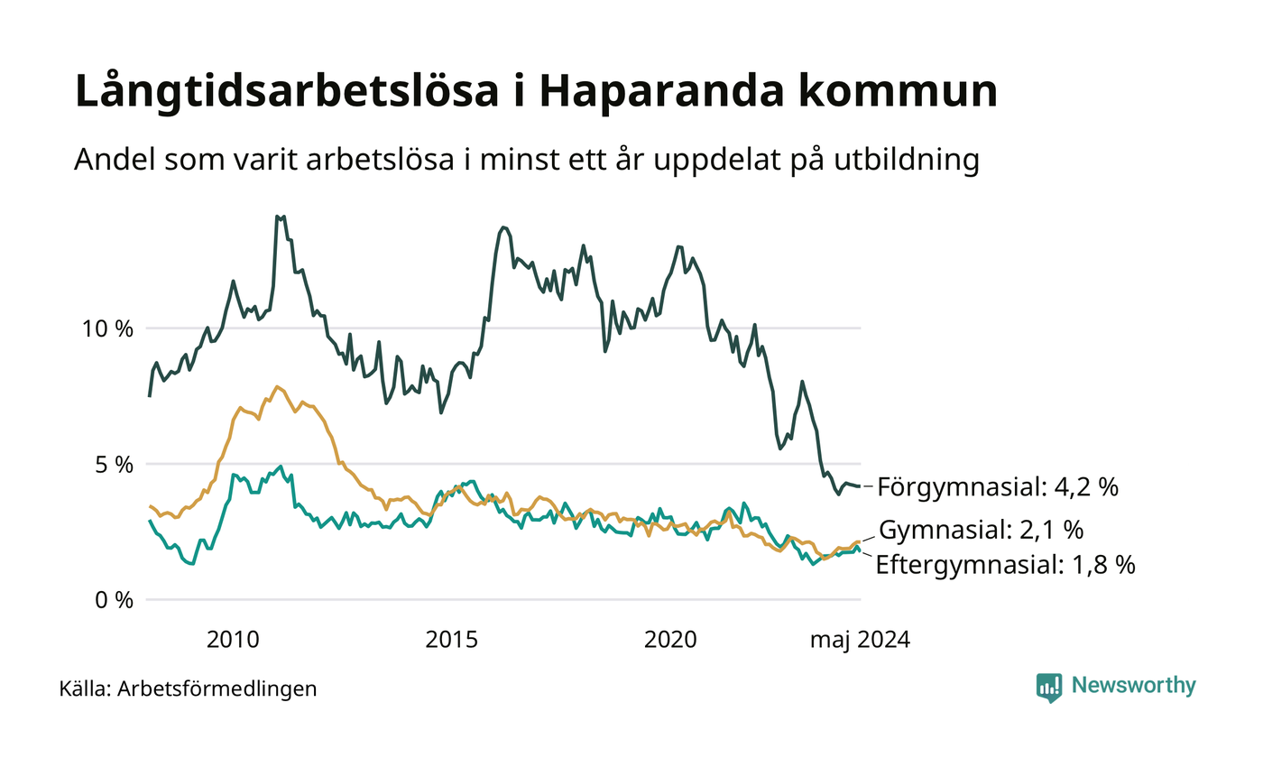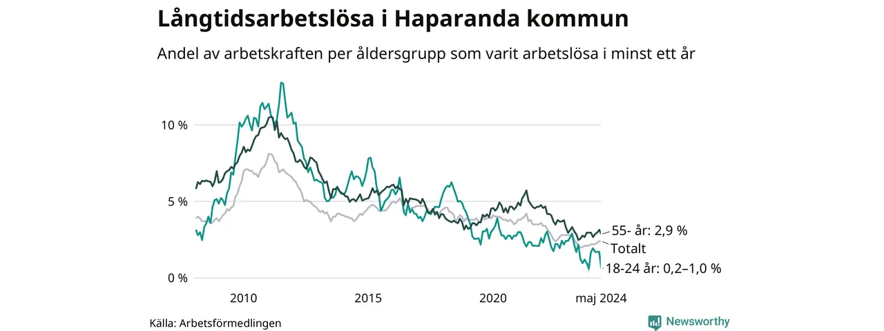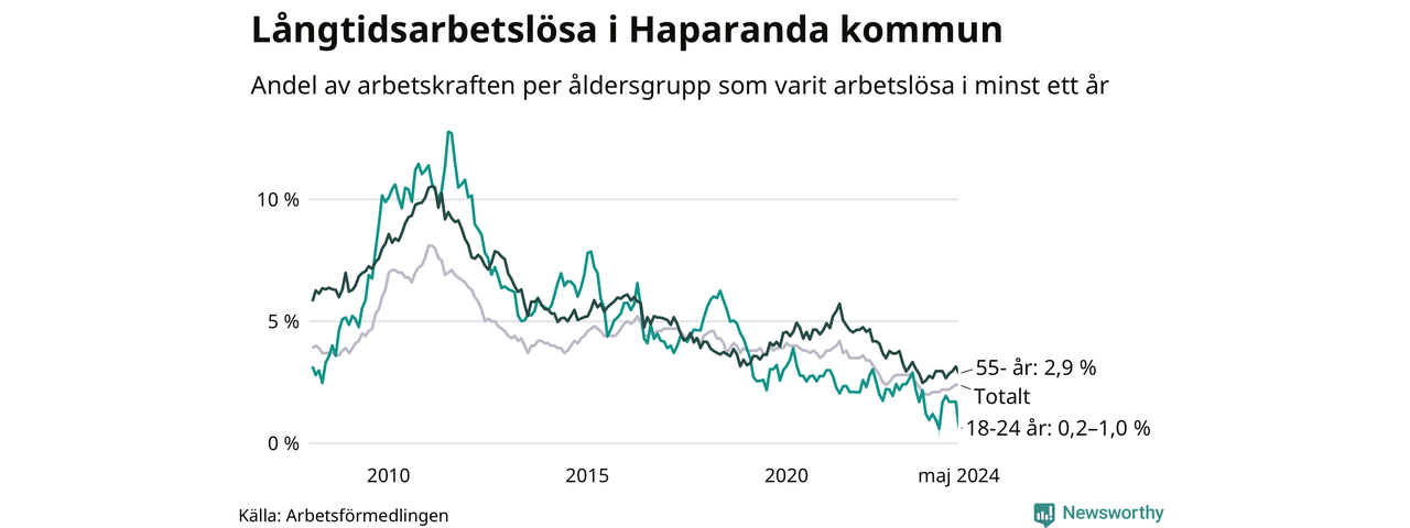 I maj hade 90 Haparandabor varit arbetslösa i minst ett år, vilket är två färre än månaden innan. Det är den första månaden sedan juli 2023 som antalet arbetslösa minskar. 90 personer motsvarar 2,4 procent av arbetskraften i kommunen – andelen långtidsarbetslösa är ungefär på samma nivå som för ett år sedan.