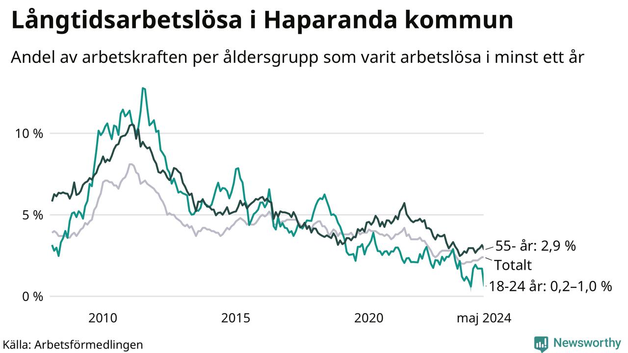 Av de 90 personerna som varit arbetslösa i mer än ett år i Haparanda kommun är 30 personer mellan 55 och 651 år och mellan en och fyra är mellan 18 och 24 år. För den äldre gruppen är andelen arbetslösa 2,9 procent medan den i den yngre gruppen är mellan 0,2 och 1,0 procent. Även i riket som helhet är långtidsarbetslösheten högre i gruppen äldre.