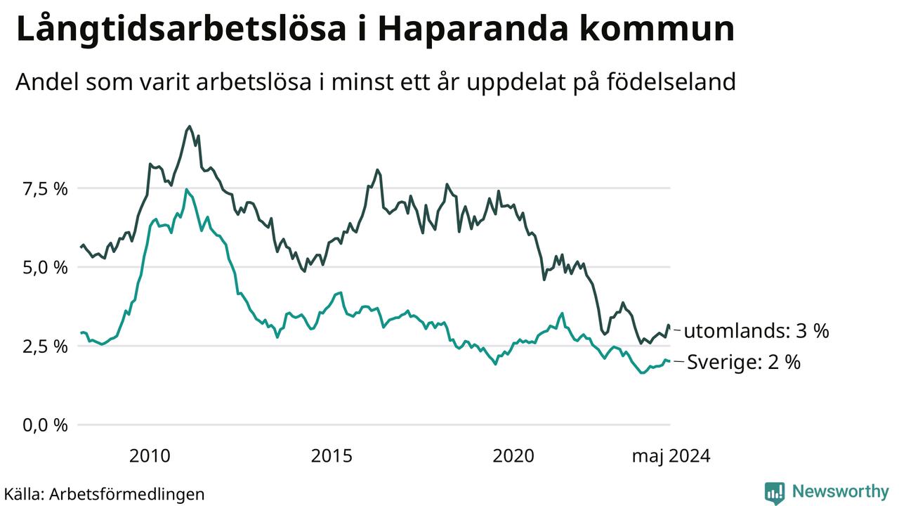 Andelen långtidsarbetslösa i Haparanda är den näst högsta i Norrbottens län, bara i Överkalix är andelen högre 2,5 procent.I Arjeplog och Kiruna finns länets lägsta långtidsarbetslöshet, 0,6 procent. I Norrbotten som helhet hade 1 765 personer (1,4 procent) varit arbetslösa i minst ett år i maj. Det är 36 personer färre än månaden innan.