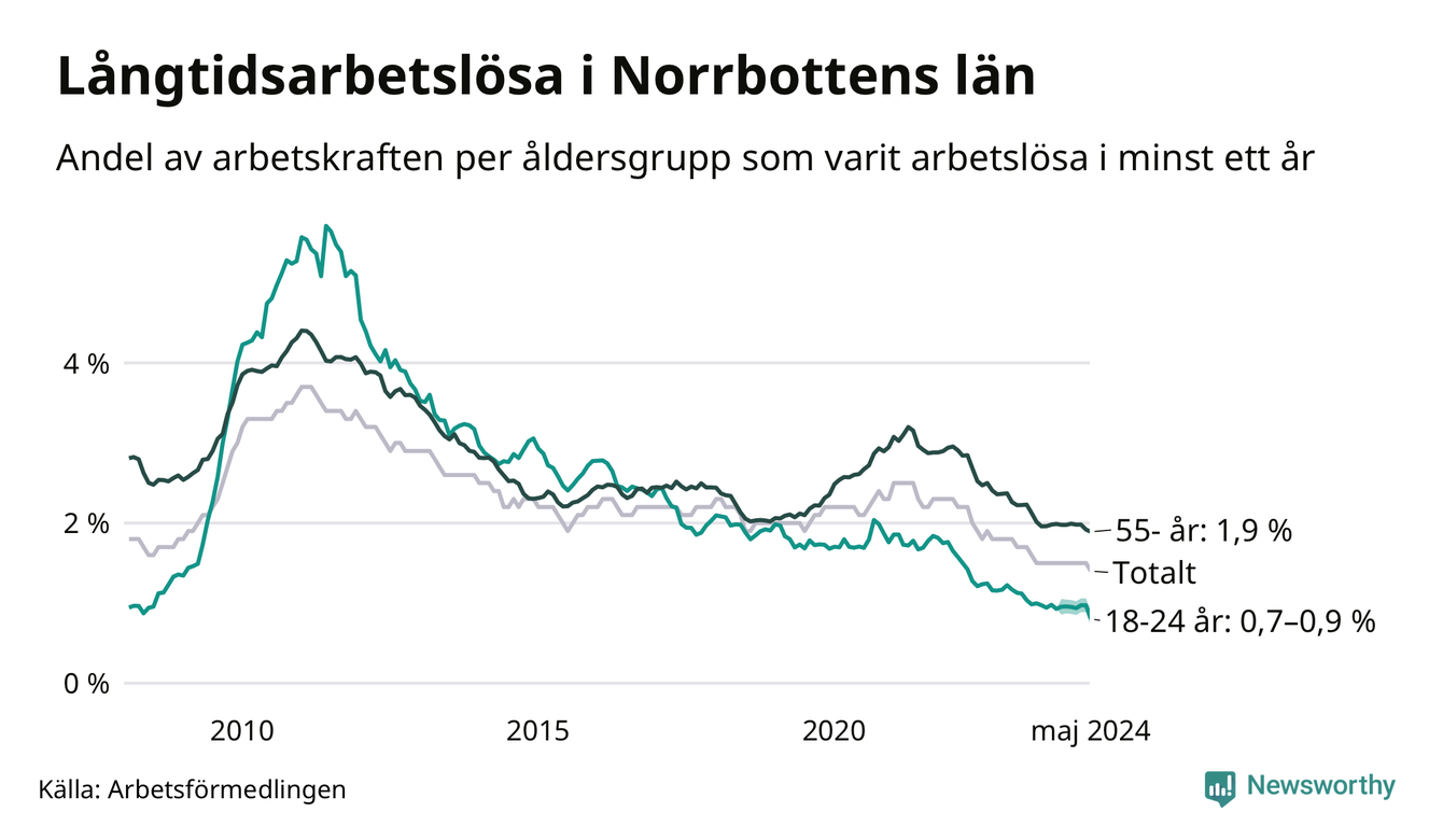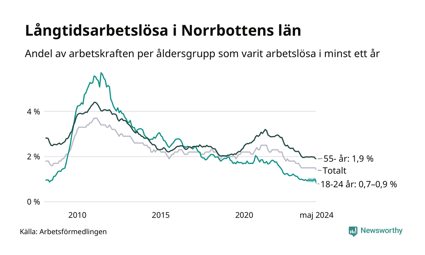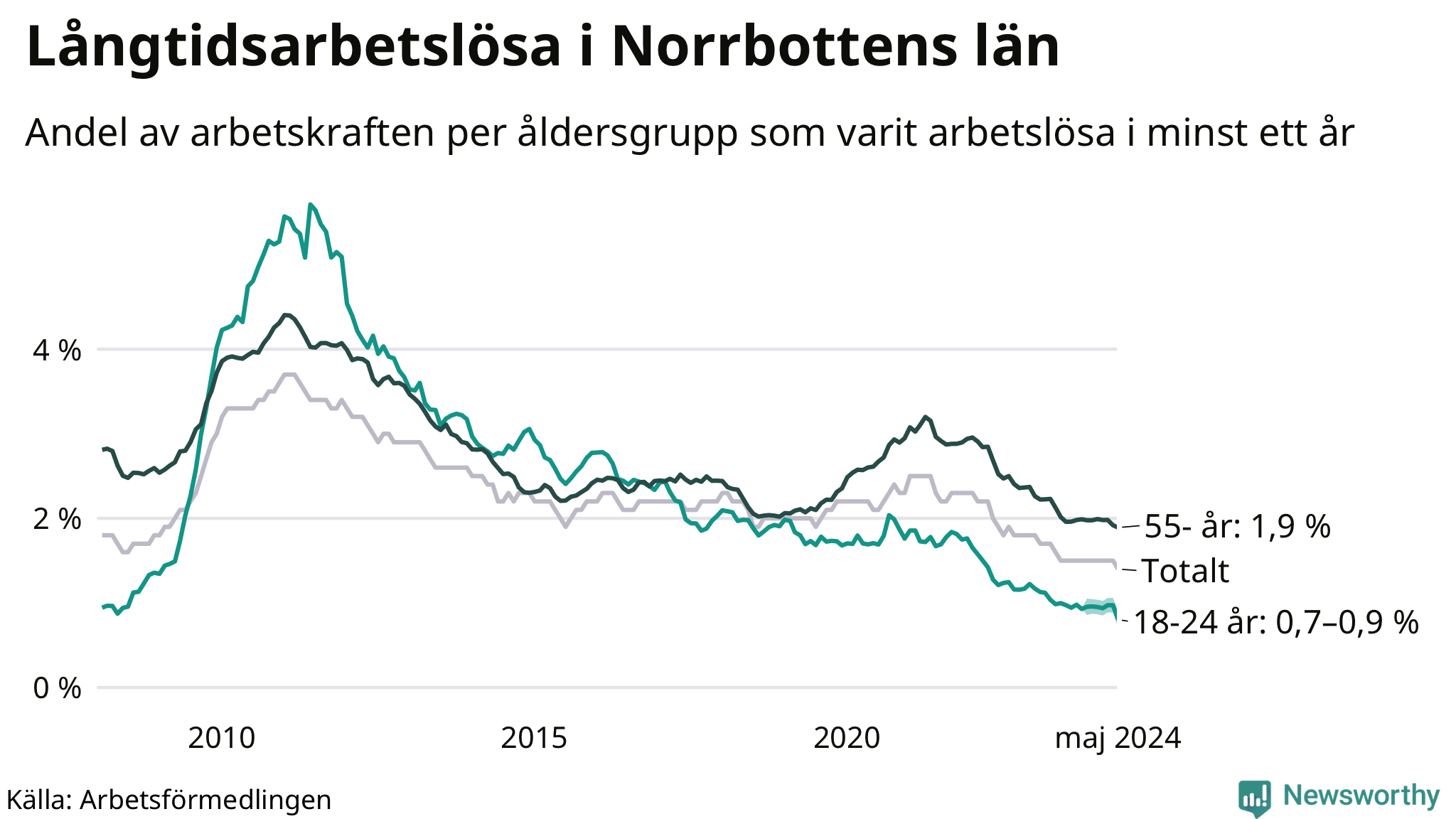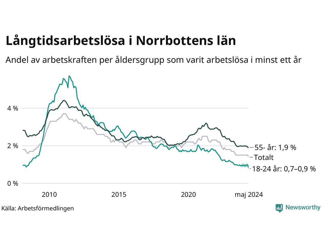 Av de 1 765 personerna som varit arbetslösa i mer än ett år i Norrbottens län är mellan 532 och 538 personer mellan 55 och 651 år och mellan 98 och 125 är mellan 18 och 24 år. För den äldre gruppen är andelen arbetslösa 1,9 procent medan den i den yngre gruppen är mellan 0,7 och 0,9 procent. Även i riket som helhet är långtidsarbetslösheten högre i gruppen äldre.