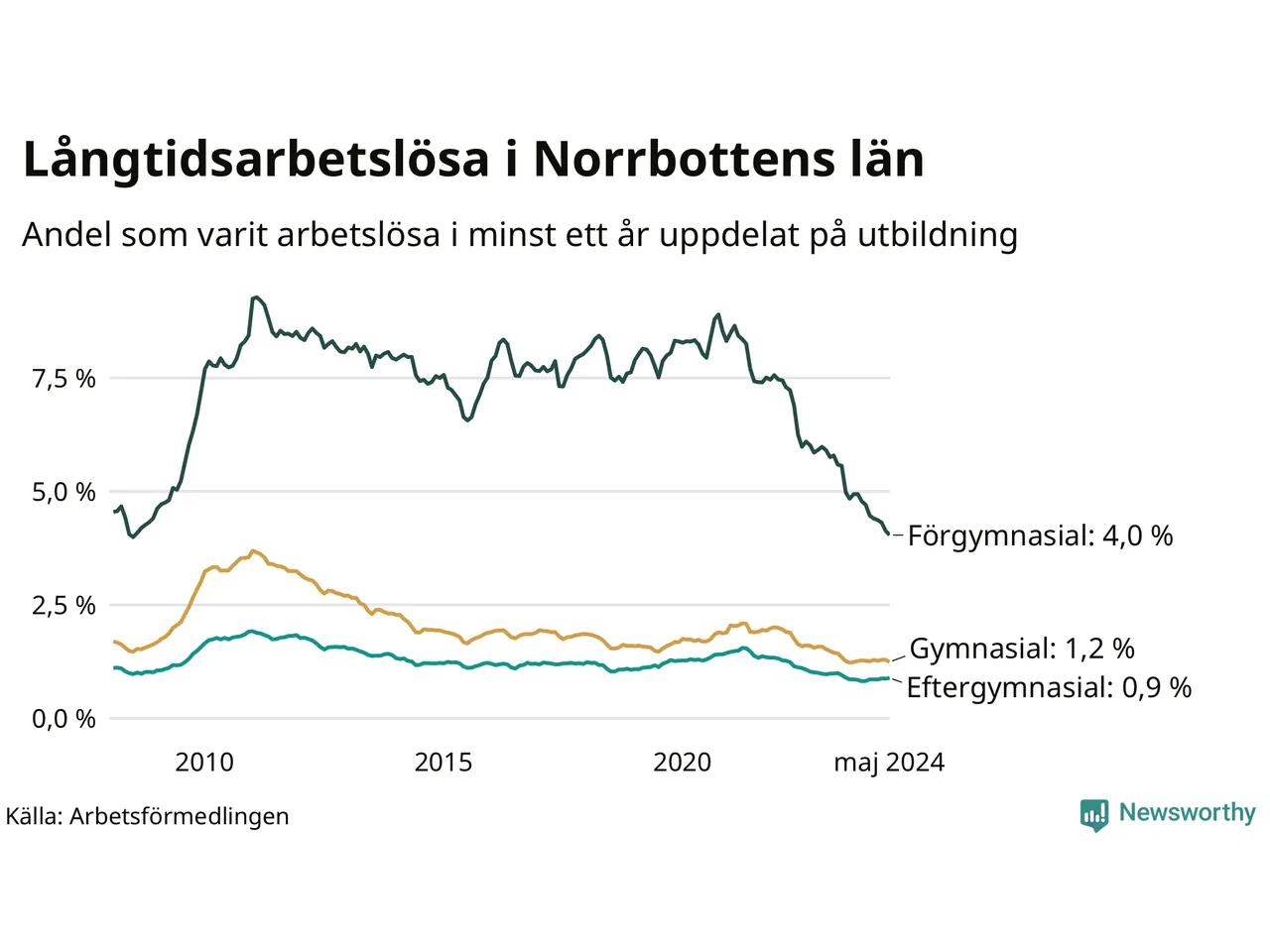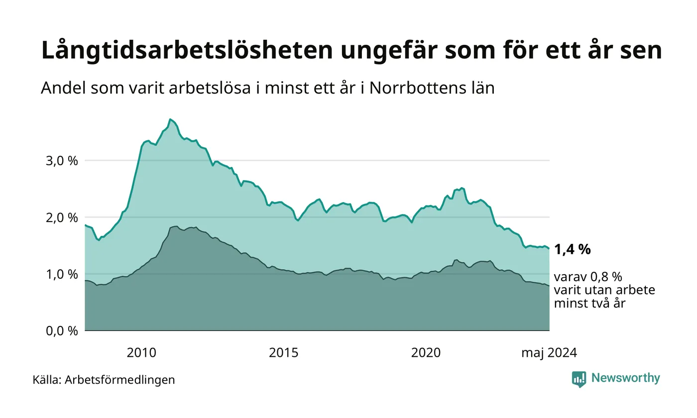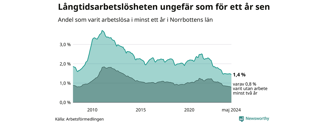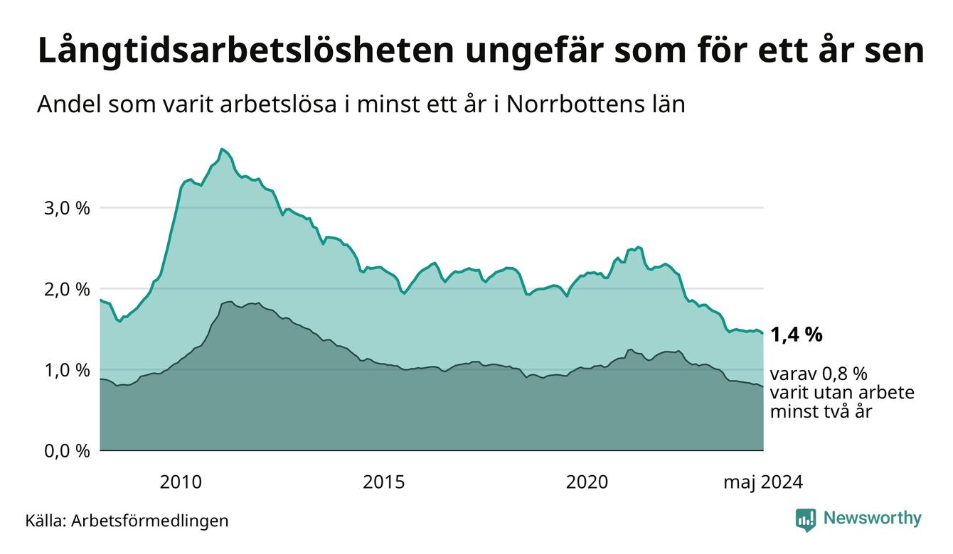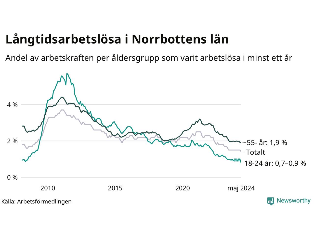 I maj hade 1 765 Norrbottensbor varit arbetslösa i minst ett år, vilket är 36 färre än månaden innan. 1 765 personer motsvarar 1,4 procent av arbetskraften i länet – andelen långtidsarbetslösa är ungefär på samma nivå som för ett år sedan. Det är också den den lägsta andelen långtidsarbetslösa under de senaste 15 åren. Norrbottens län hade tredje lägst andel långtidsarbetslösa i landet i maj.