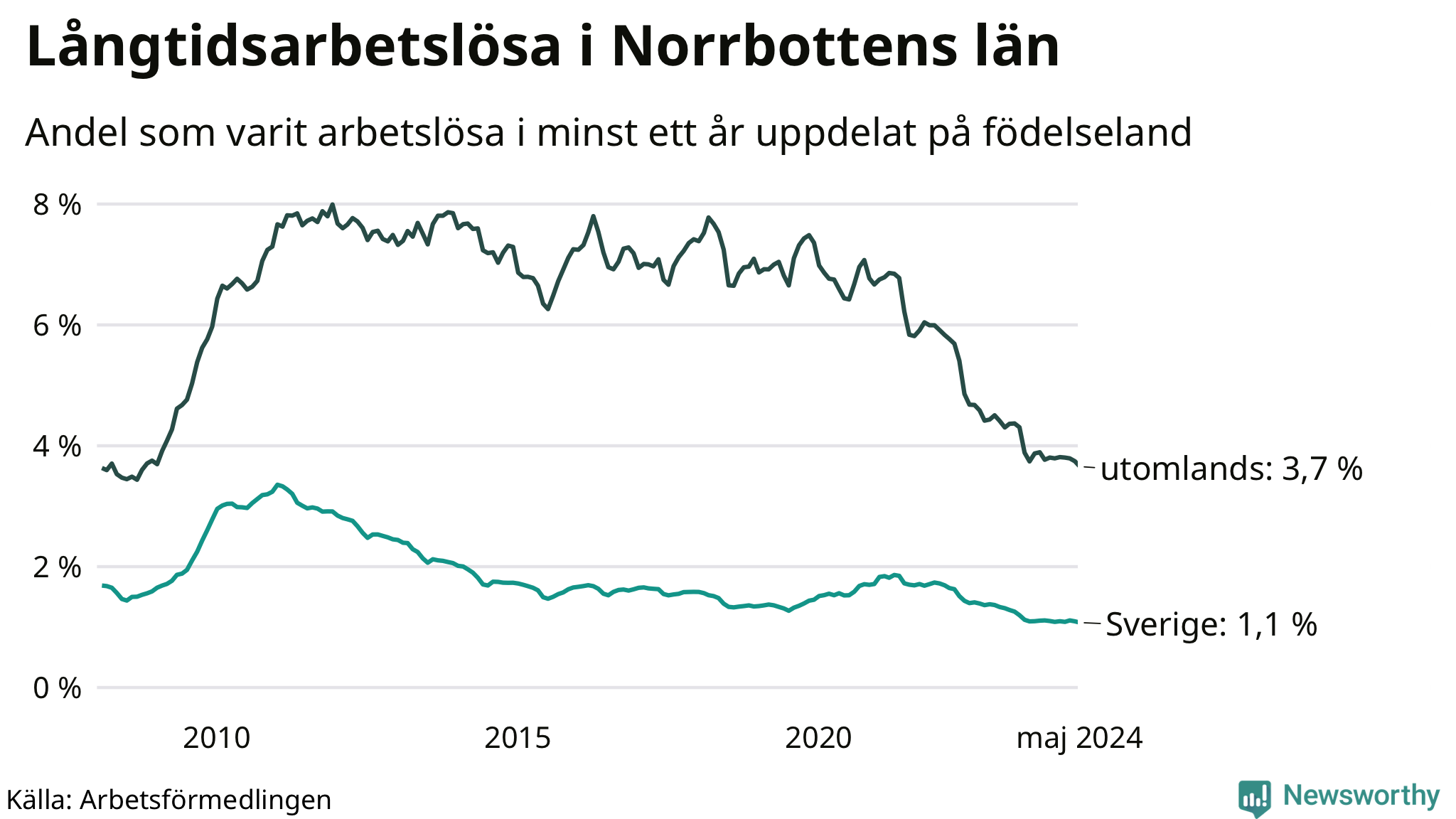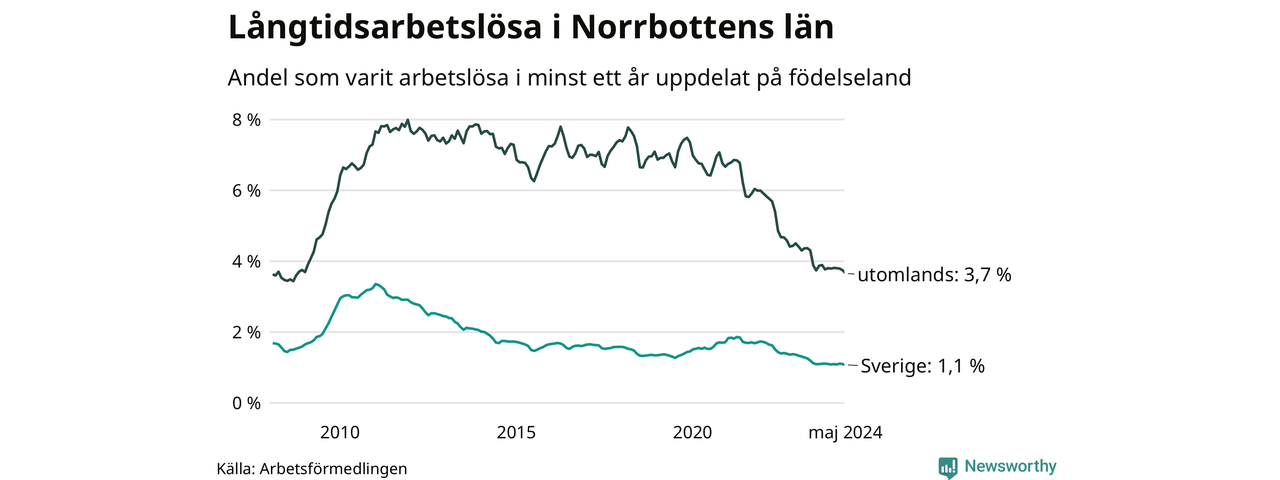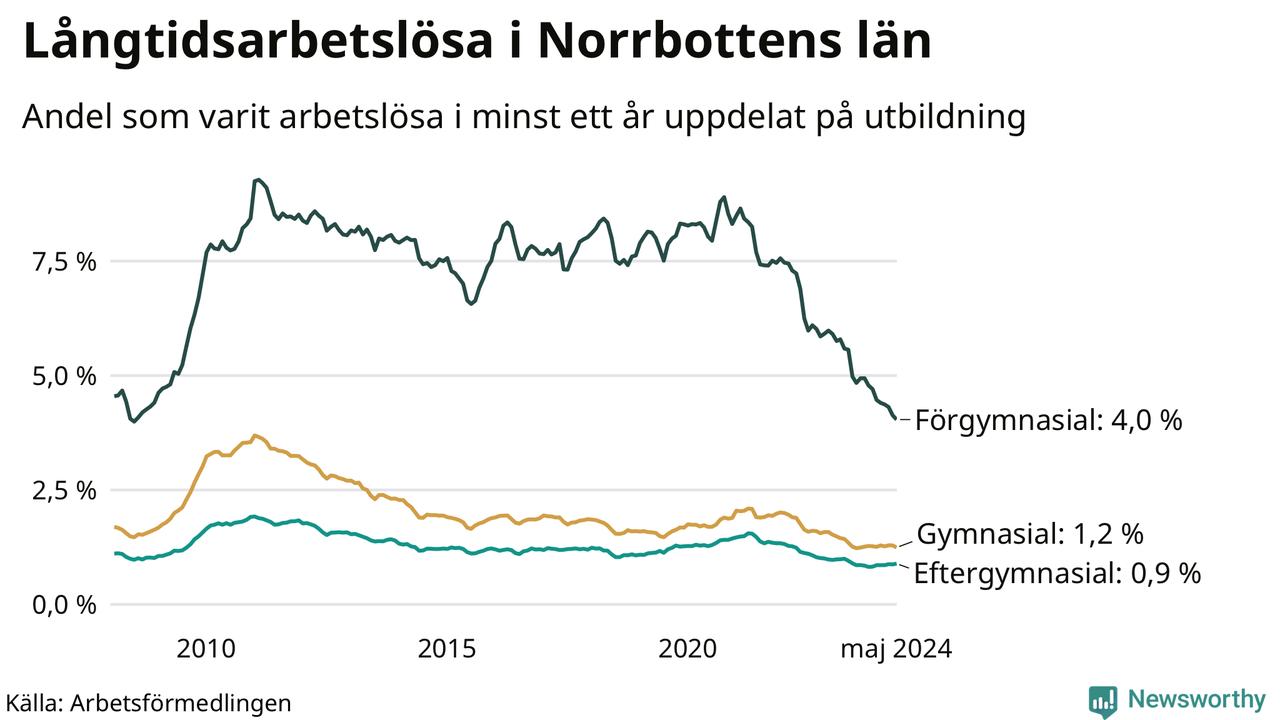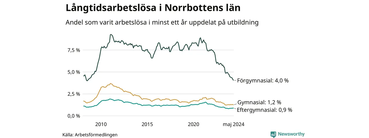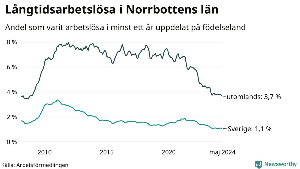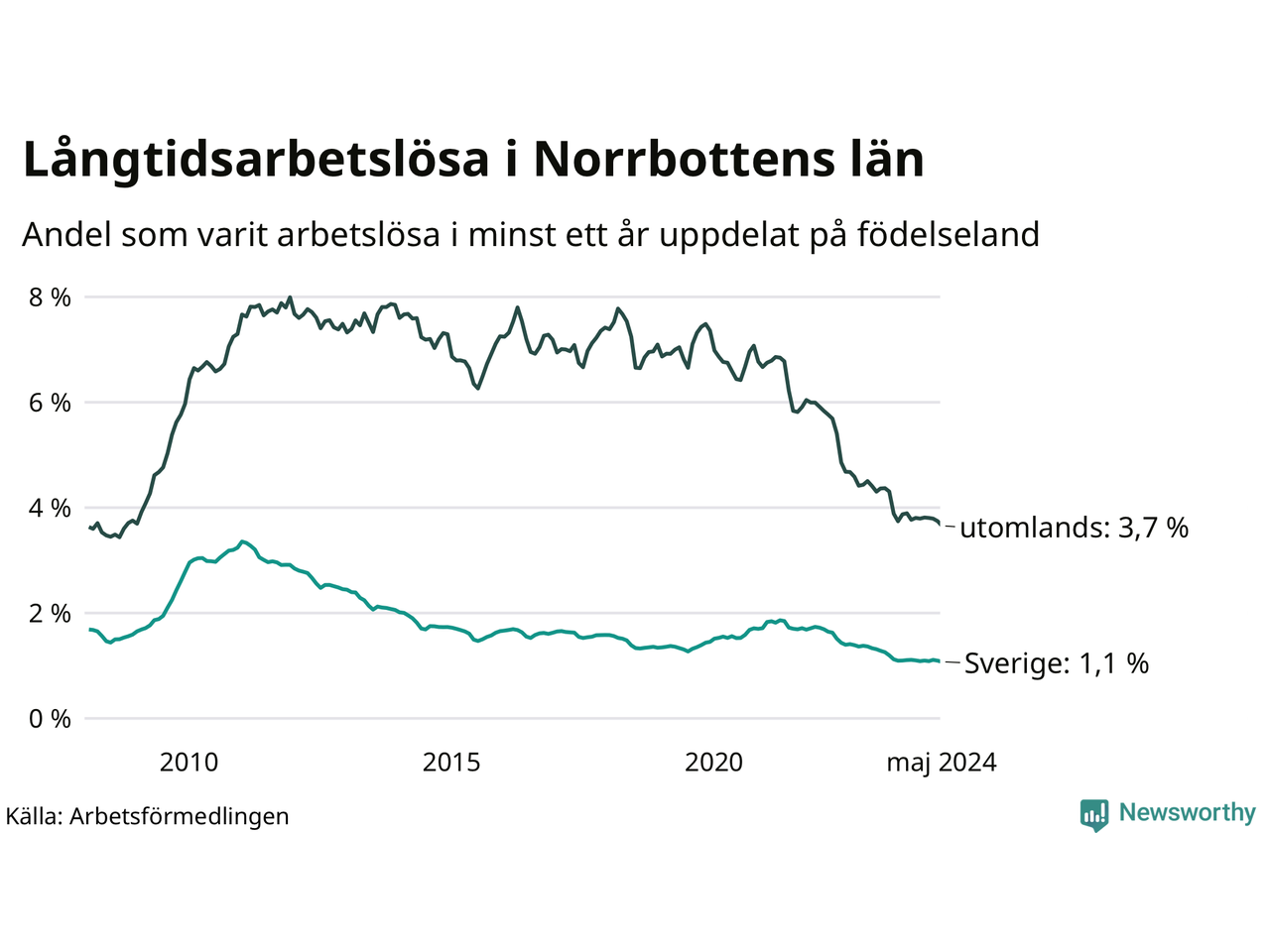 I maj hade 1 765 Norrbottensbor varit arbetslösa i minst ett år, vilket är 36 färre än månaden innan. 1 765 personer motsvarar 1,4 procent av arbetskraften i länet – andelen långtidsarbetslösa är ungefär på samma nivå som för ett år sedan. Det är också den den lägsta andelen långtidsarbetslösa under de senaste 15 åren. Norrbottens län hade tredje lägst andel långtidsarbetslösa i landet i maj.