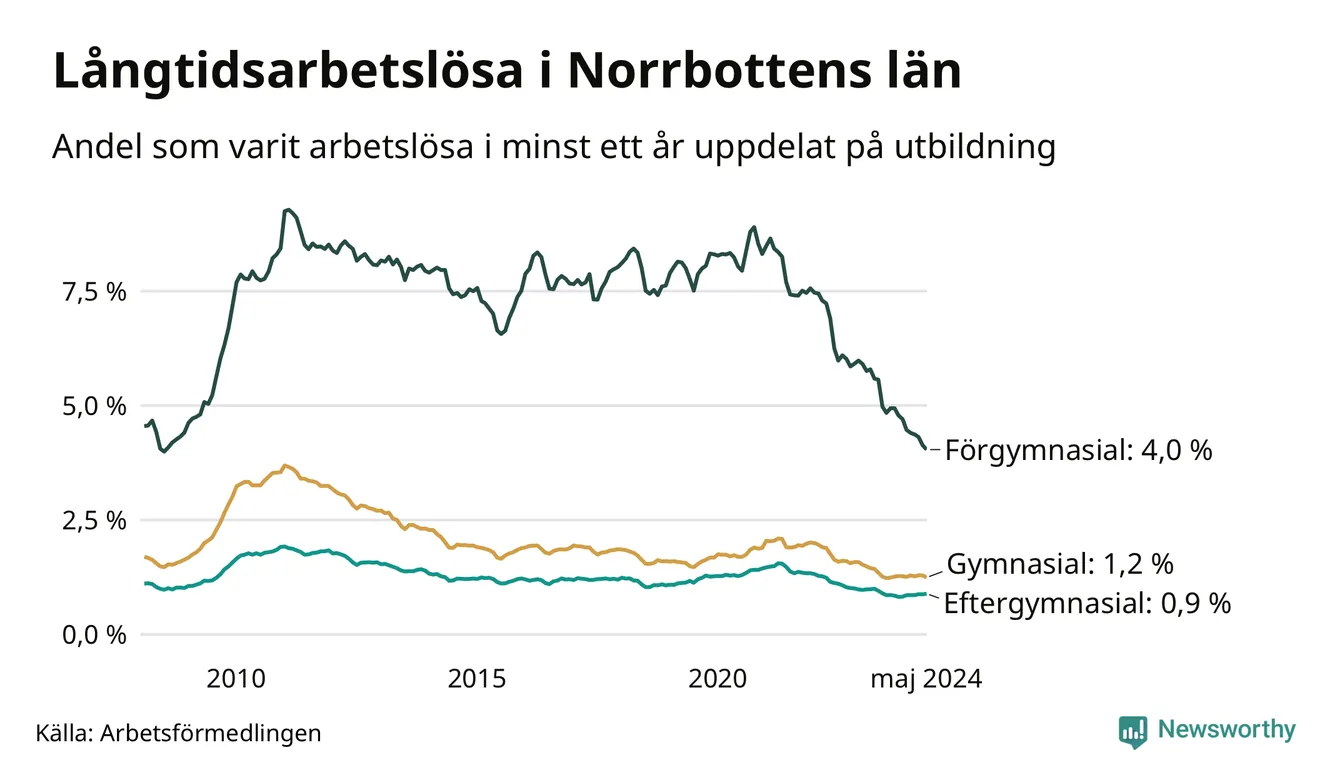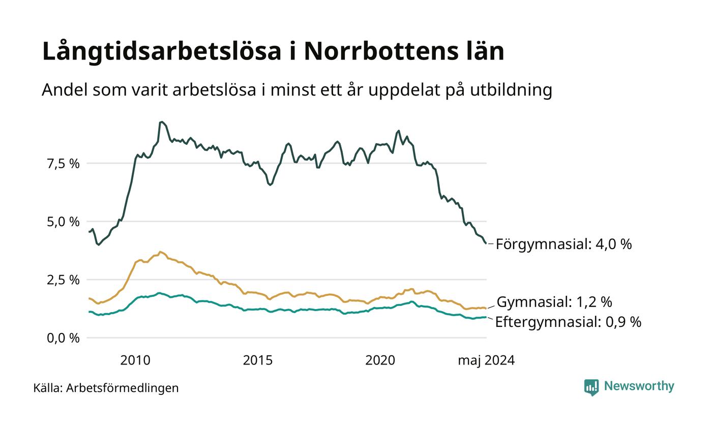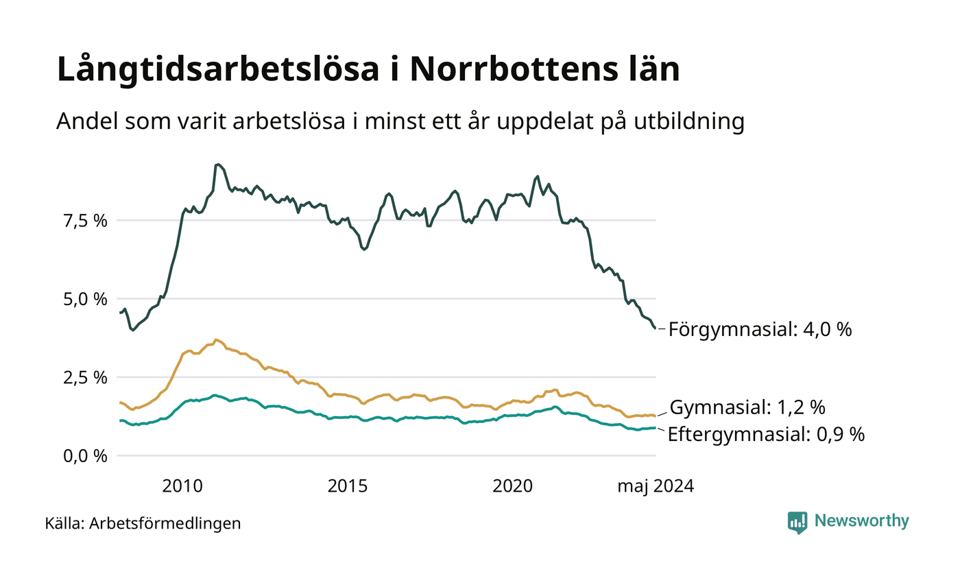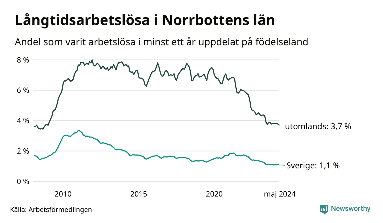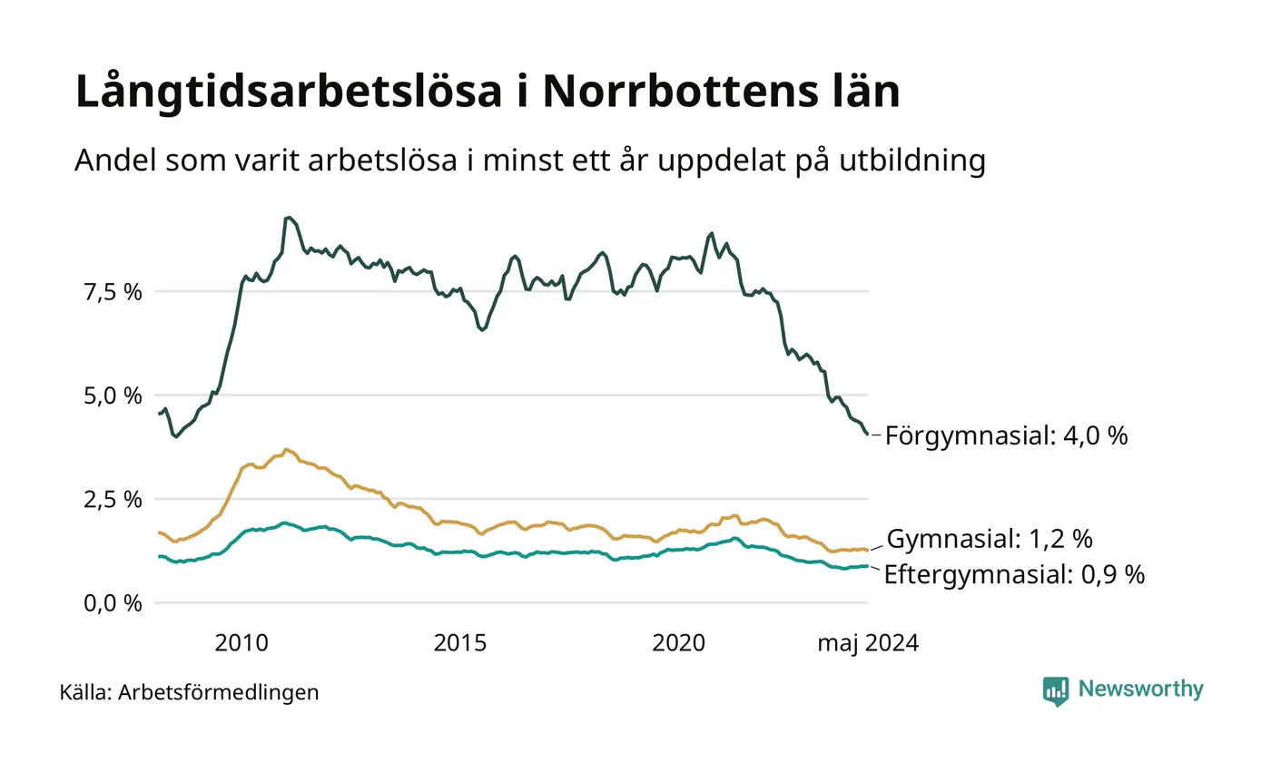 I maj hade 1 765 Norrbottensbor varit arbetslösa i minst ett år, vilket är 36 färre än månaden innan. 1 765 personer motsvarar 1,4 procent av arbetskraften i länet – andelen långtidsarbetslösa är ungefär på samma nivå som för ett år sedan. Det är också den den lägsta andelen långtidsarbetslösa under de senaste 15 åren. Norrbottens län hade tredje lägst andel långtidsarbetslösa i landet i maj.