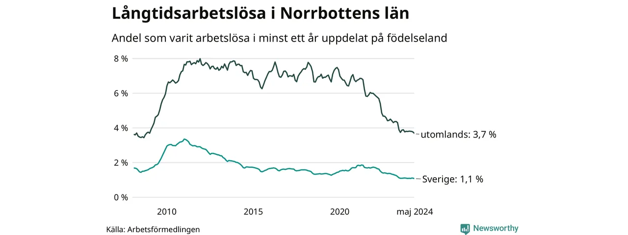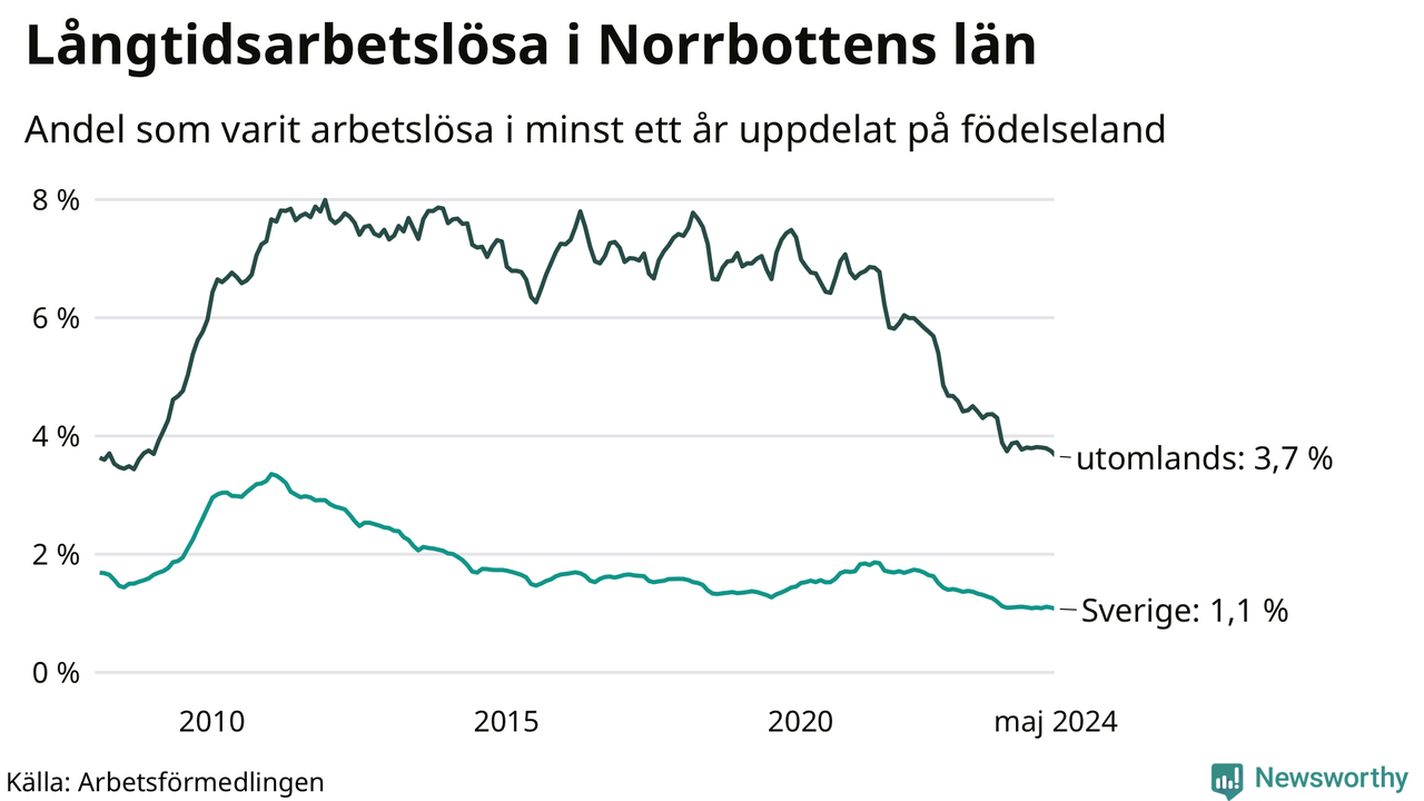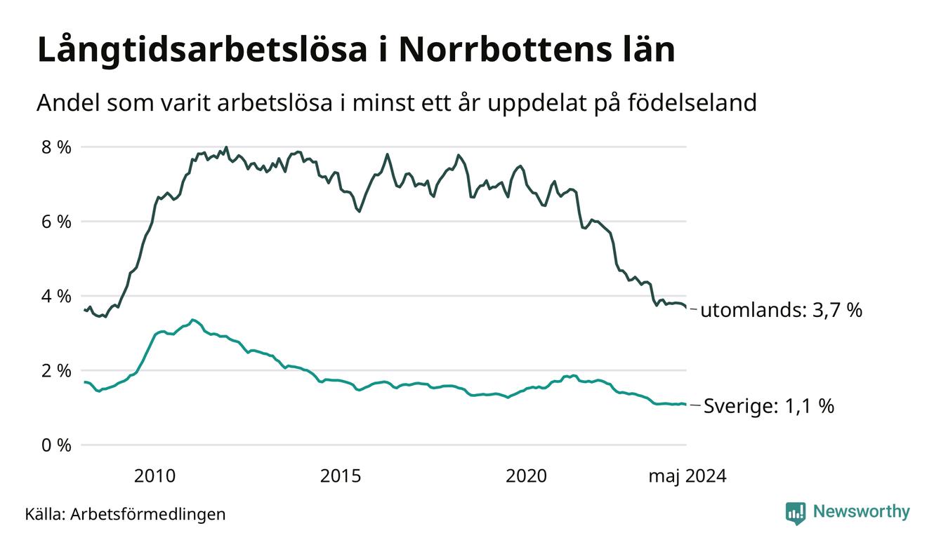 1 129 av de långtidsarbetslösa i Norrbotten är födda i Sverige, medan 636 är födda utomlands. Det innebär att långtidsarbetslösheten bland Sverigefödda är 1,1 procent, medan den är tre gånger så hög – 3,7 procent – bland födda utomlands. Även i riket som helhet är arbetslösheten högre bland utrikesfödda.