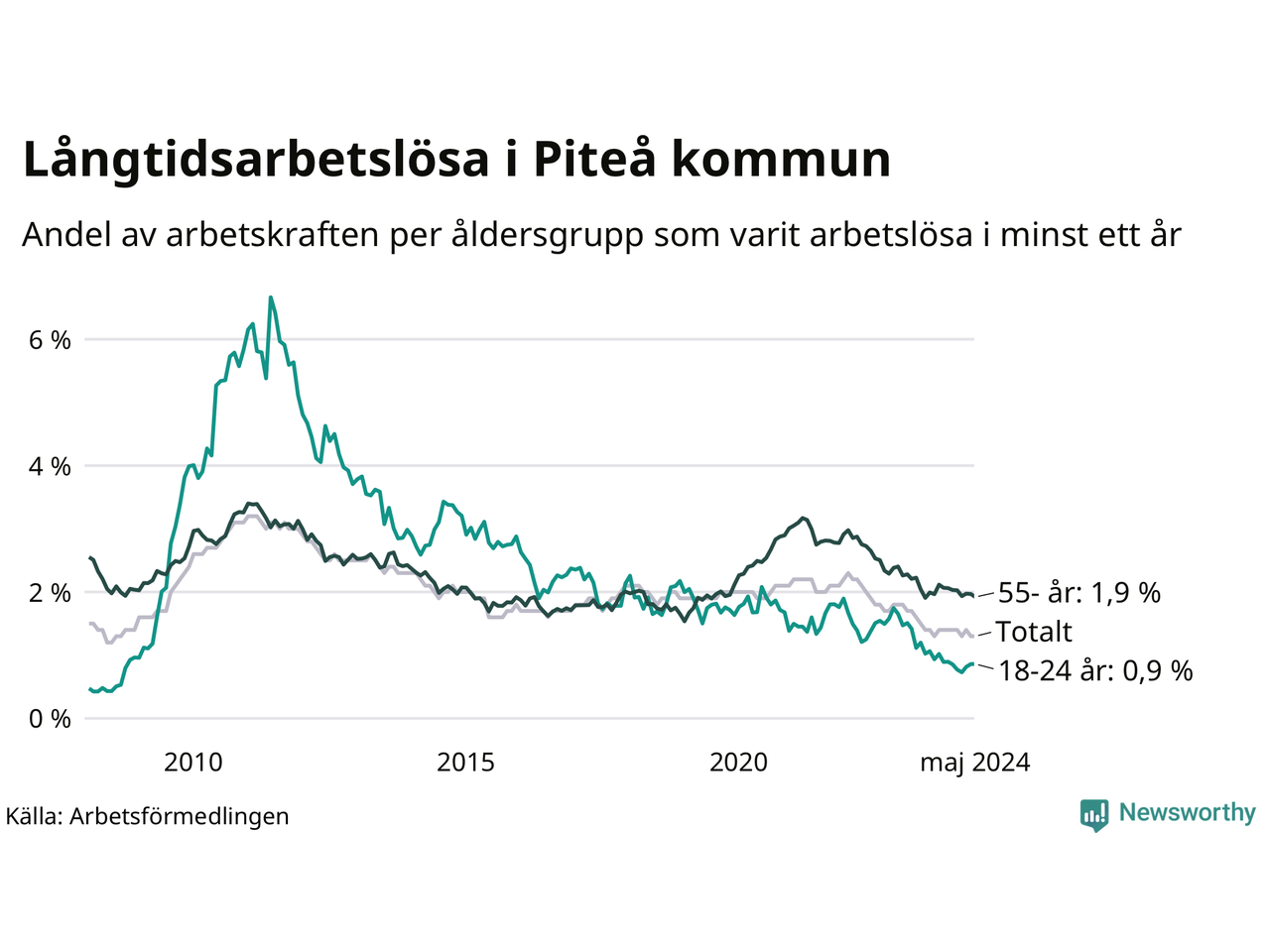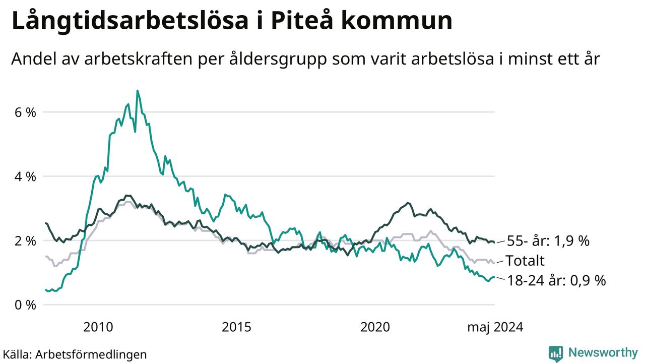 Av de 271 personerna som varit arbetslösa i mer än ett år i Piteå kommun är 89 personer mellan 55 och 651 år och 20 är mellan 18 och 24 år. För den äldre gruppen är andelen arbetslösa 1,9 procent medan den i den yngre gruppen är 0,9 procent. Även i riket som helhet är långtidsarbetslösheten högre i gruppen äldre.