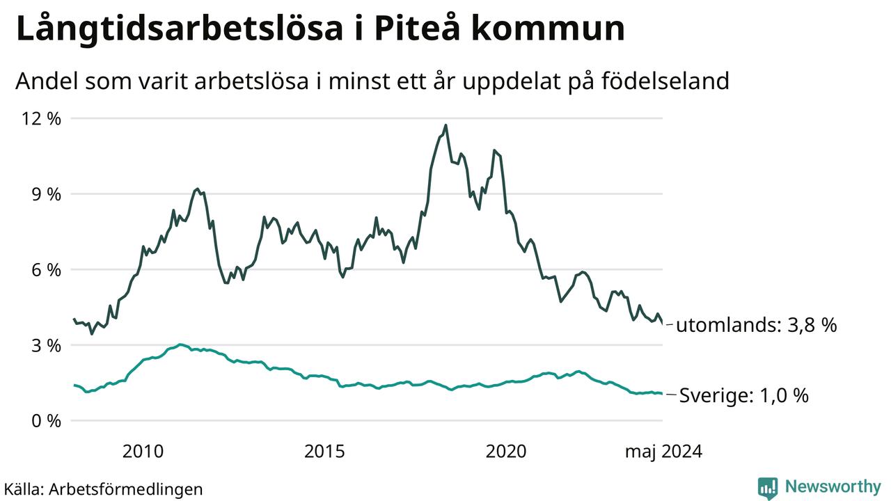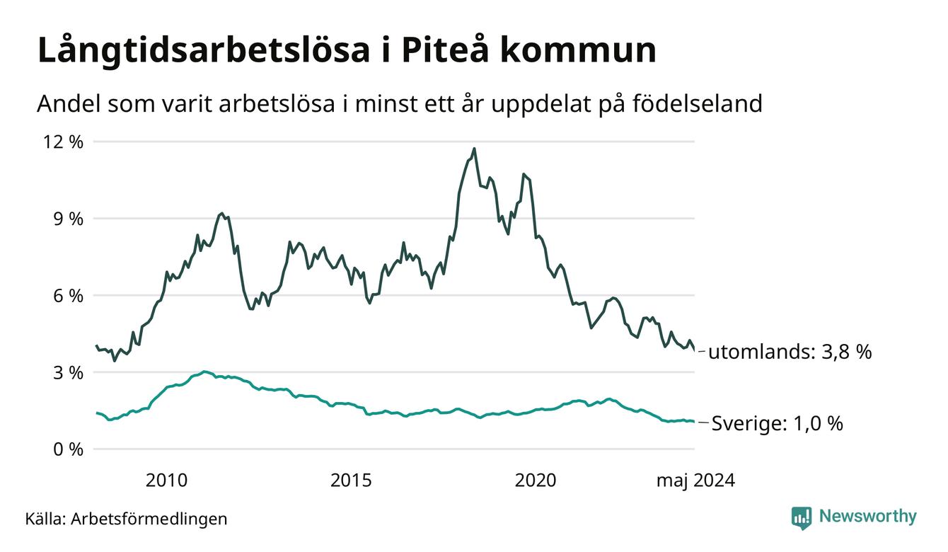 200 av de långtidsarbetslösa i Piteå är födda i Sverige, medan 71 är födda utomlands. Det innebär att långtidsarbetslösheten bland Sverigefödda är 1,0 procent, medan den är fyra gånger så hög – 3,8 procent – bland födda utomlands. Även i riket som helhet är arbetslösheten högre bland utrikesfödda.