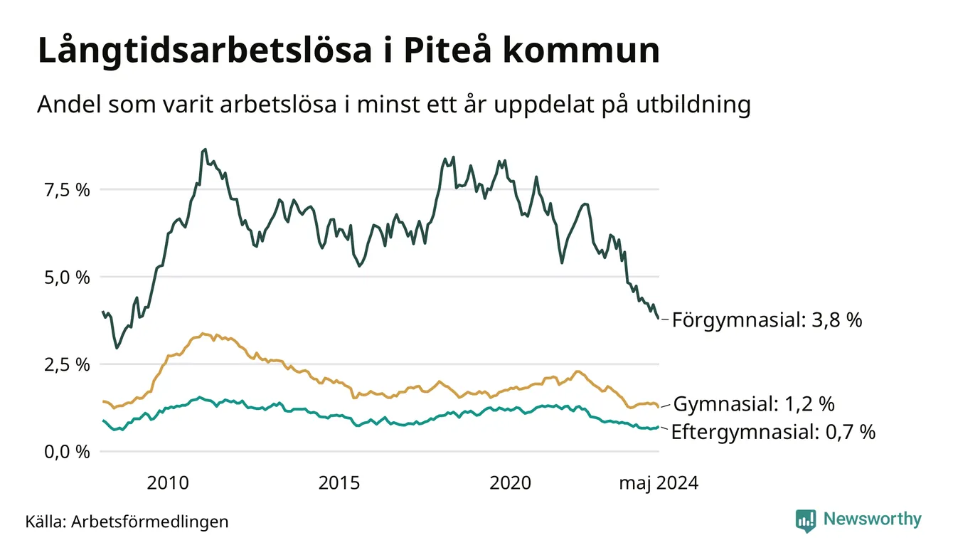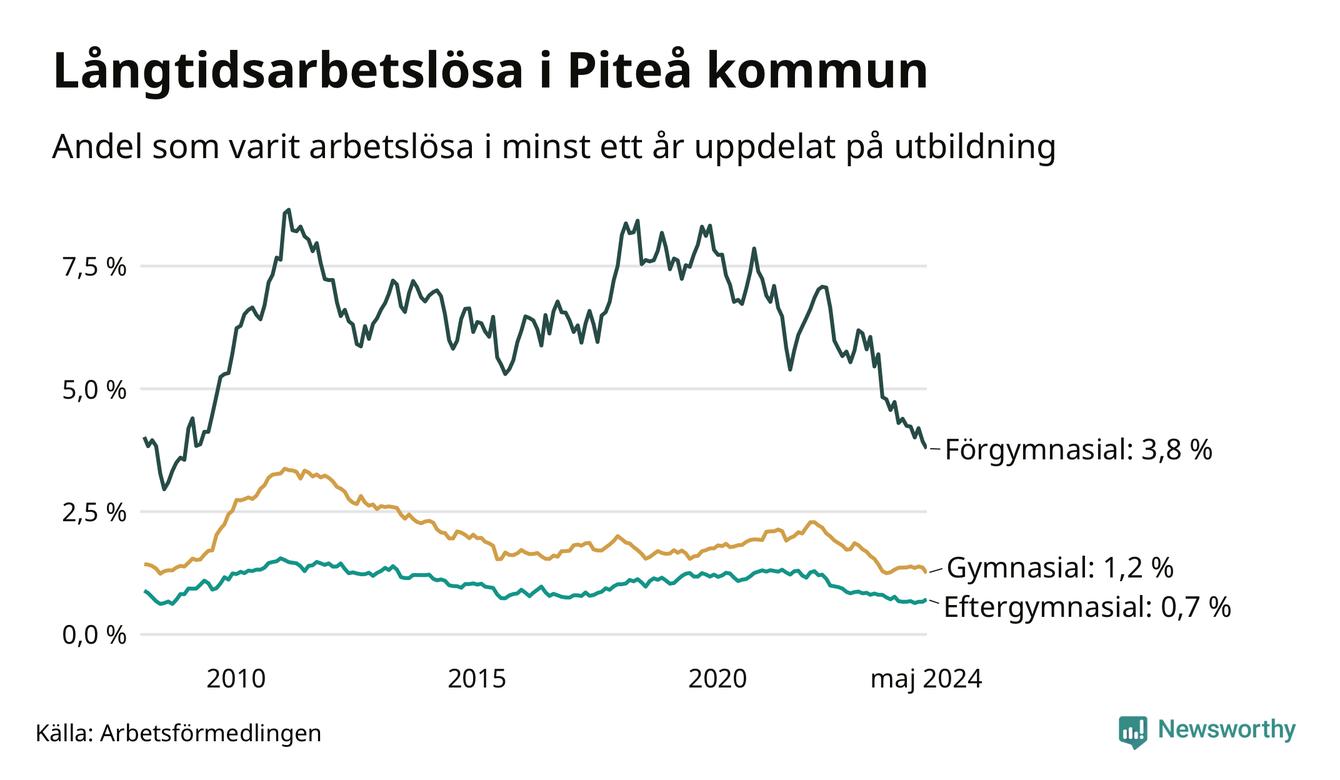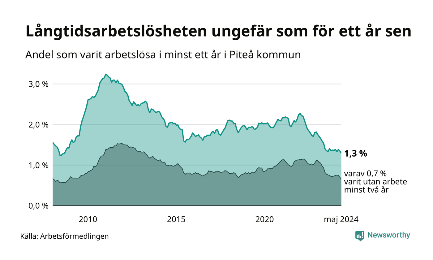 I maj hade 271 Piteåbor varit arbetslösa i minst ett år, vilket är tolv färre än månaden innan. 271 personer motsvarar 1,3 procent av arbetskraften i kommunen – andelen långtidsarbetslösa är ungefär på samma nivå som för ett år sedan.