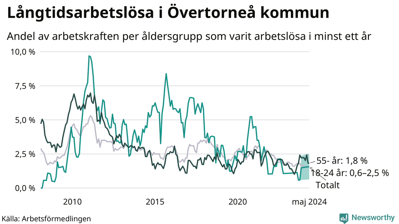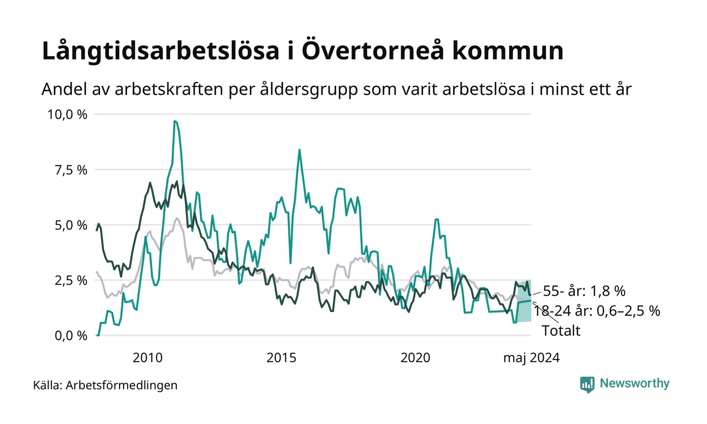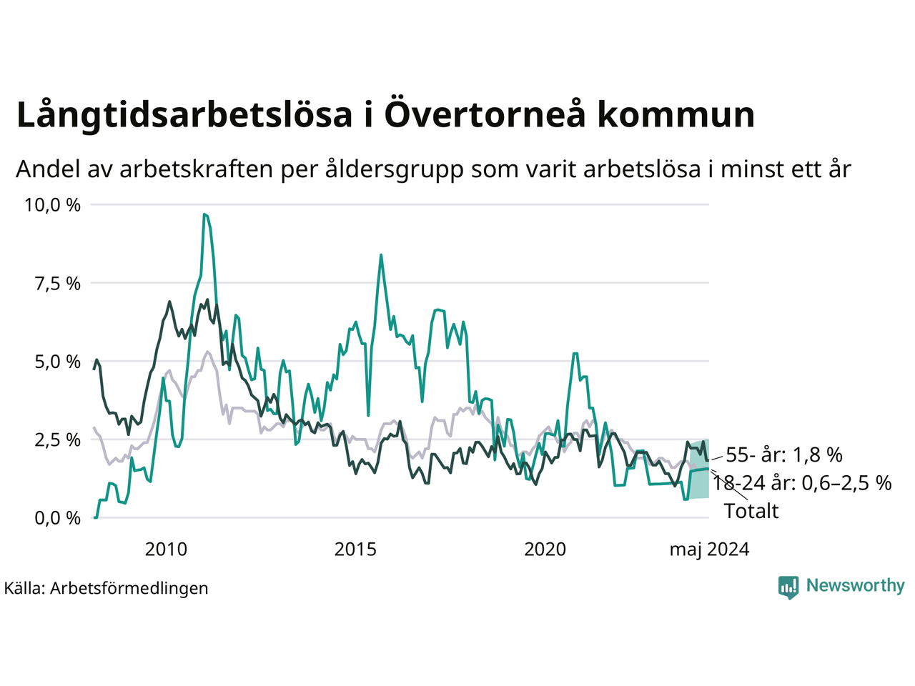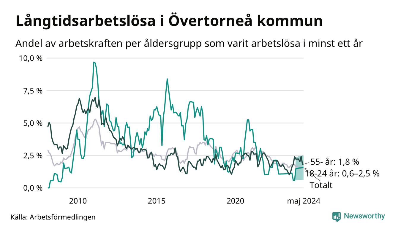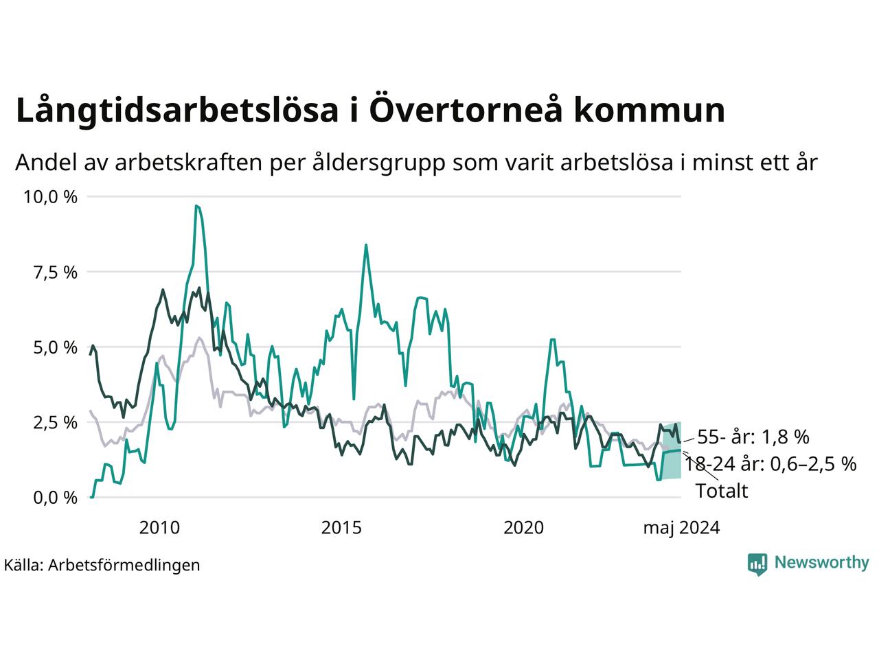 Av de 25 personerna som varit arbetslösa i mer än ett år i Övertorneå kommun är nio personer mellan 55 och 651 år och mellan en och fyra är mellan 18 och 24 år. För den äldre gruppen är andelen arbetslösa 1,8 procent medan den i den yngre gruppen är mellan 0,6 och 2,5 procent. Även i riket som helhet är långtidsarbetslösheten högre i gruppen äldre.