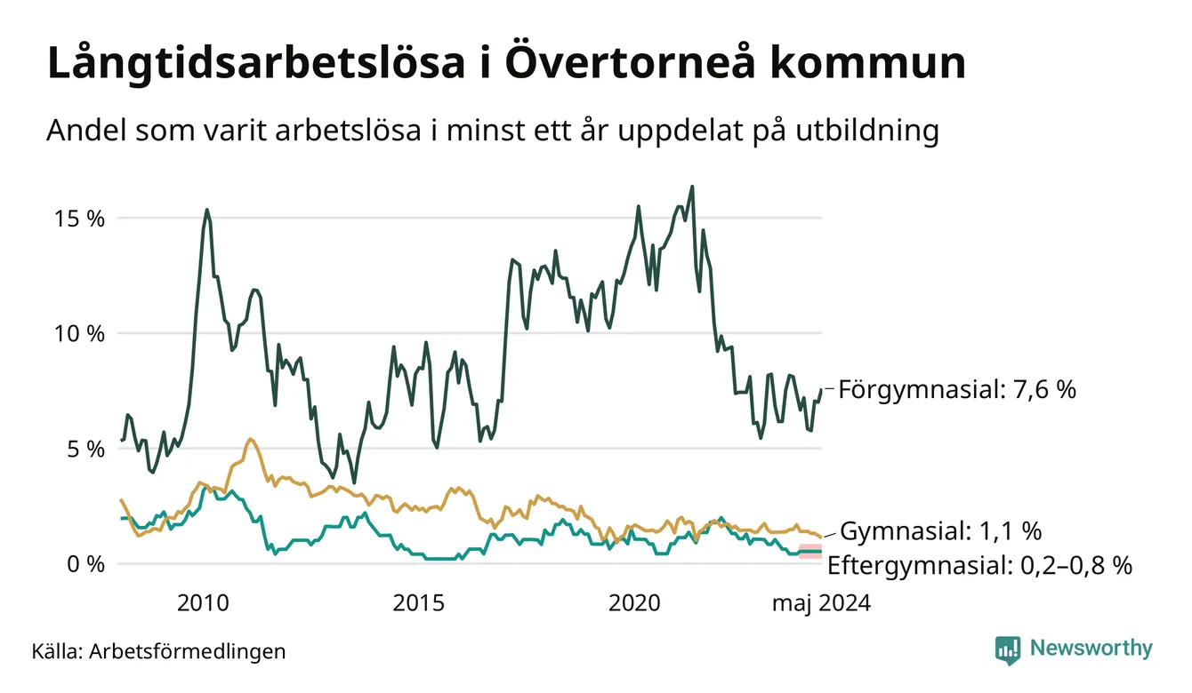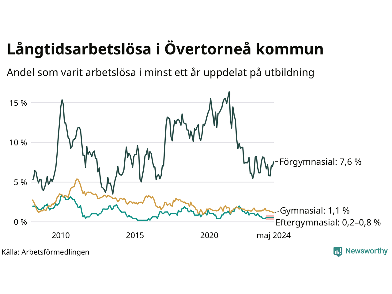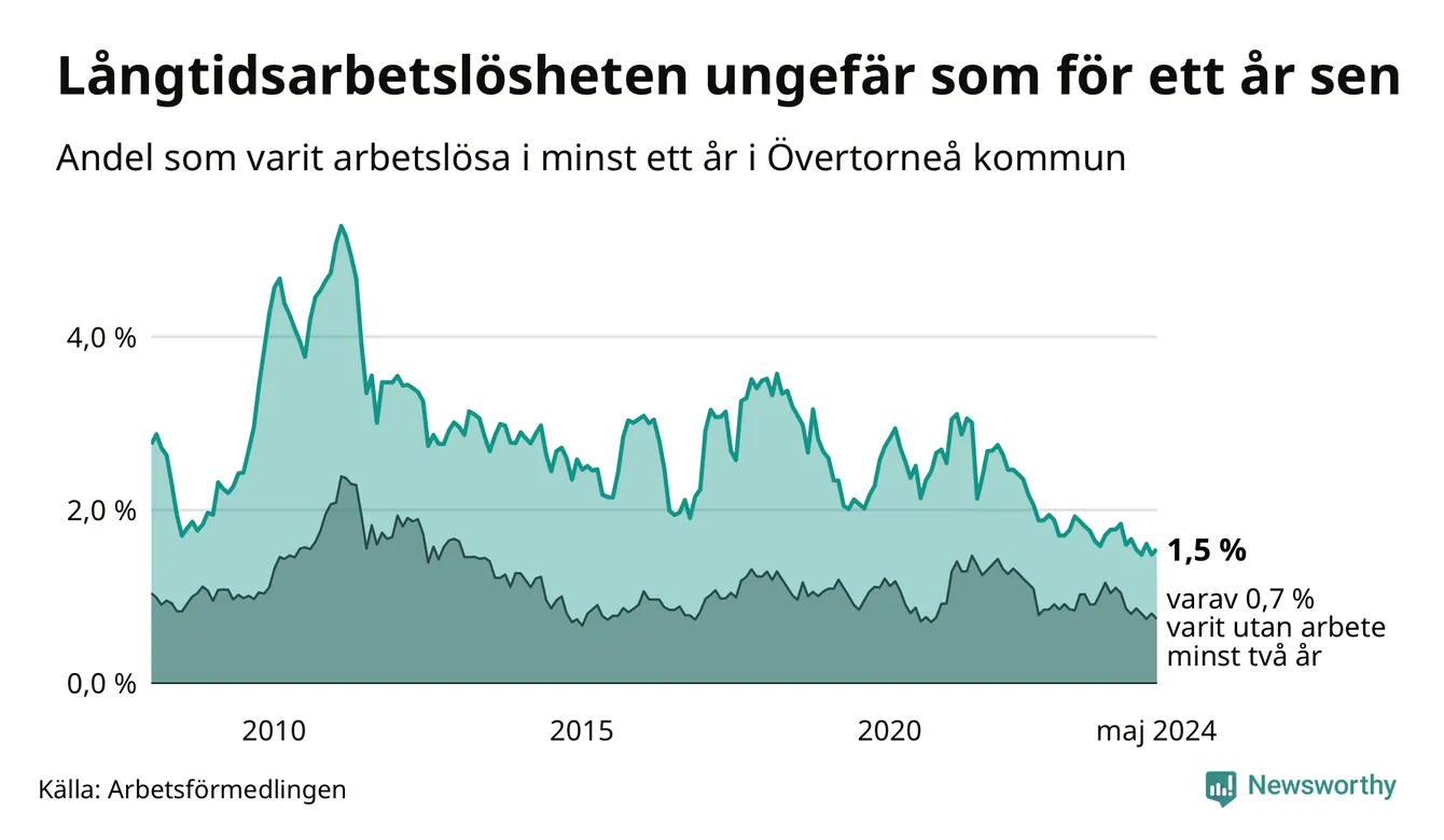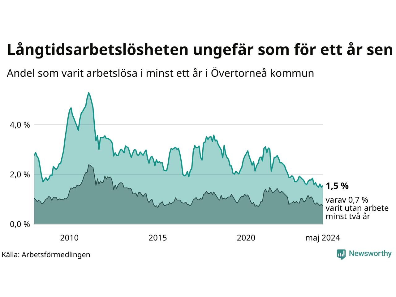 I maj hade 25 Övertorneåbor varit arbetslösa i minst ett år, vilket är en fler än månaden innan. 25 personer motsvarar 1,5 procent av arbetskraften i kommunen – andelen långtidsarbetslösa är ungefär på samma nivå som för ett år sedan.