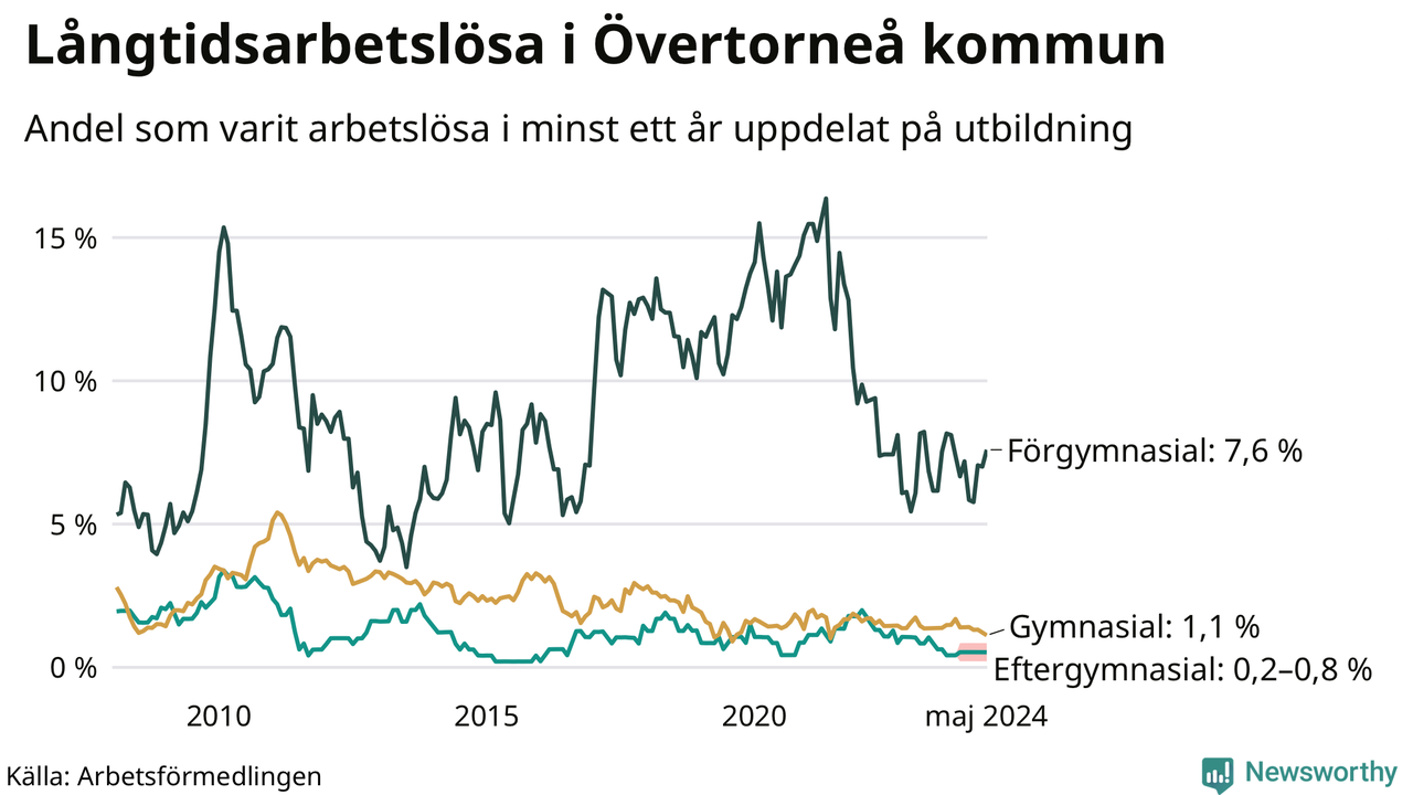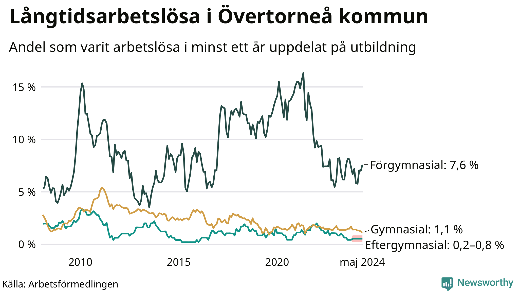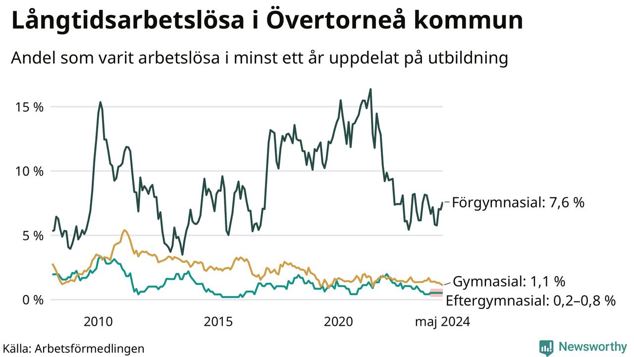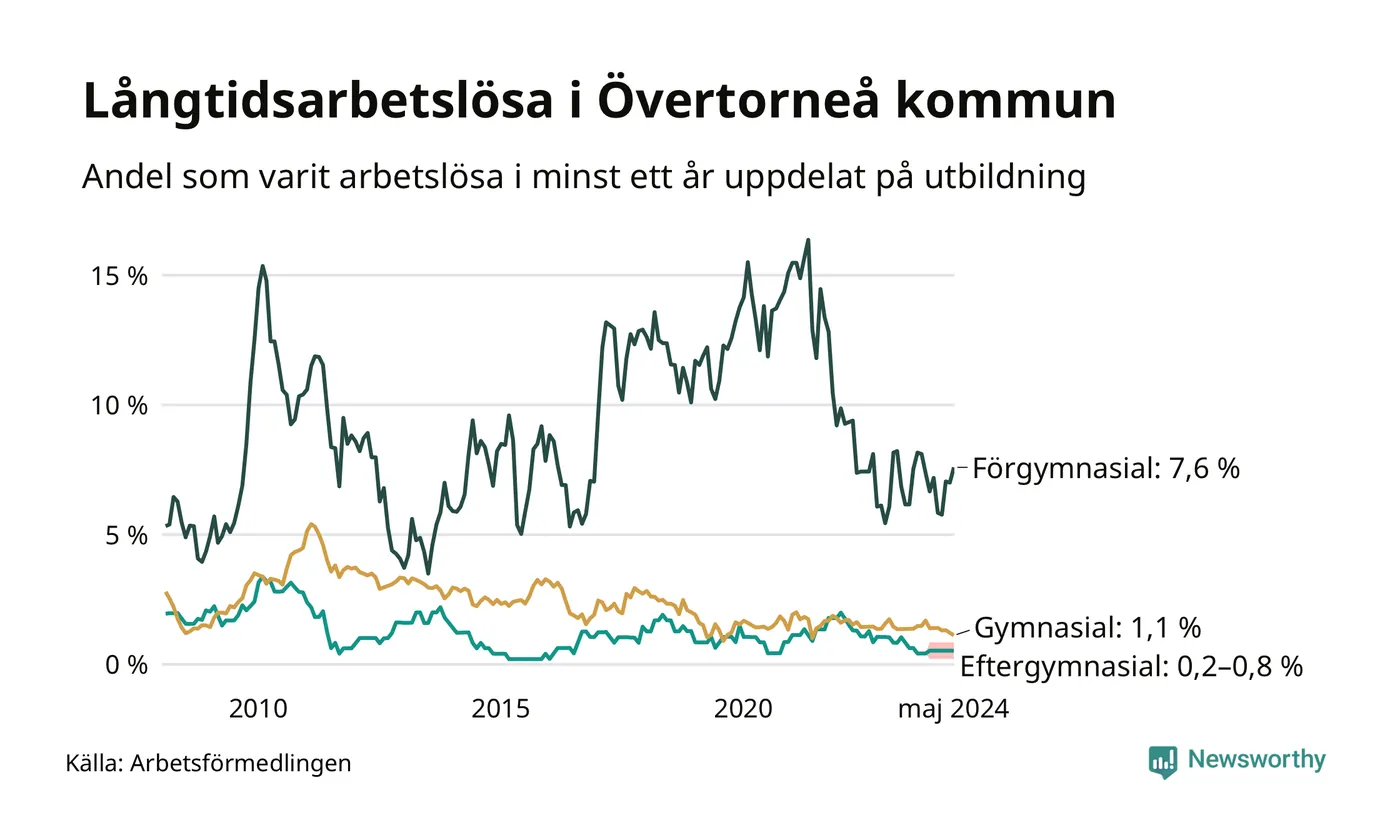 I maj hade 25 Övertorneåbor varit arbetslösa i minst ett år, vilket är en fler än månaden innan. 25 personer motsvarar 1,5 procent av arbetskraften i kommunen – andelen långtidsarbetslösa är ungefär på samma nivå som för ett år sedan.