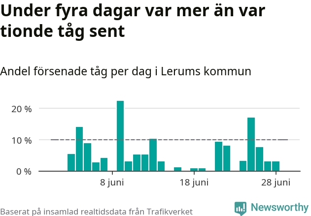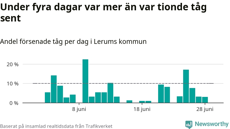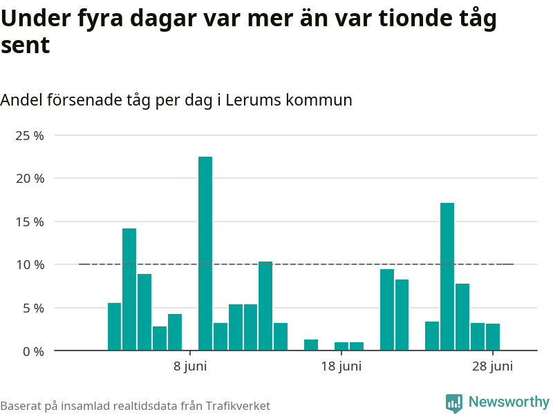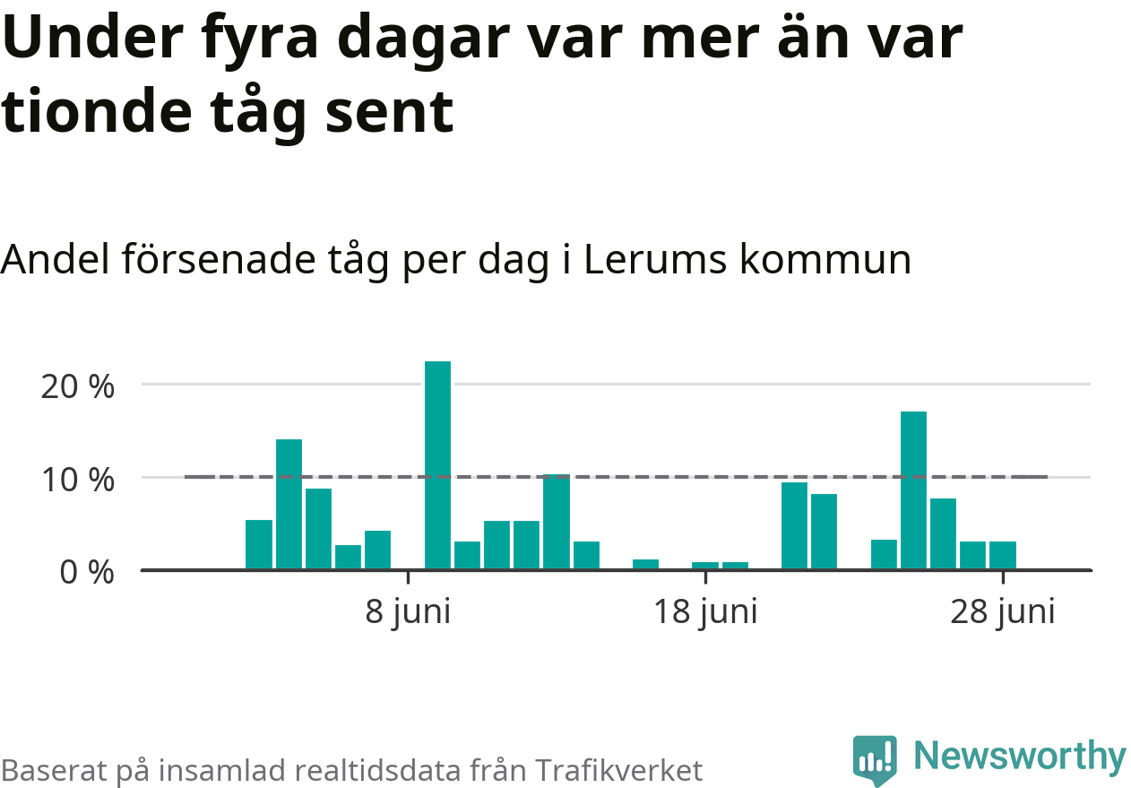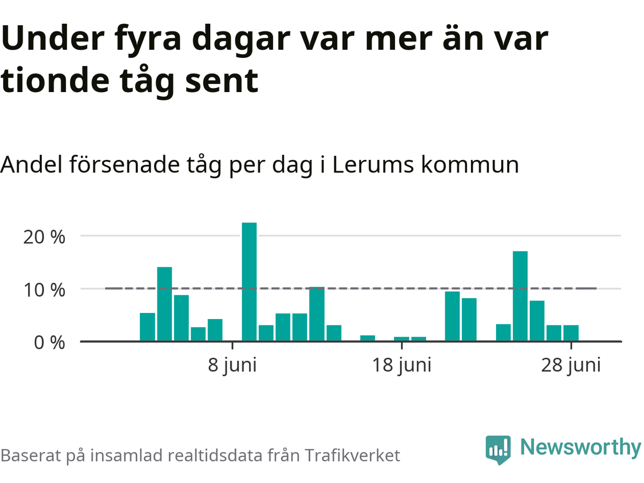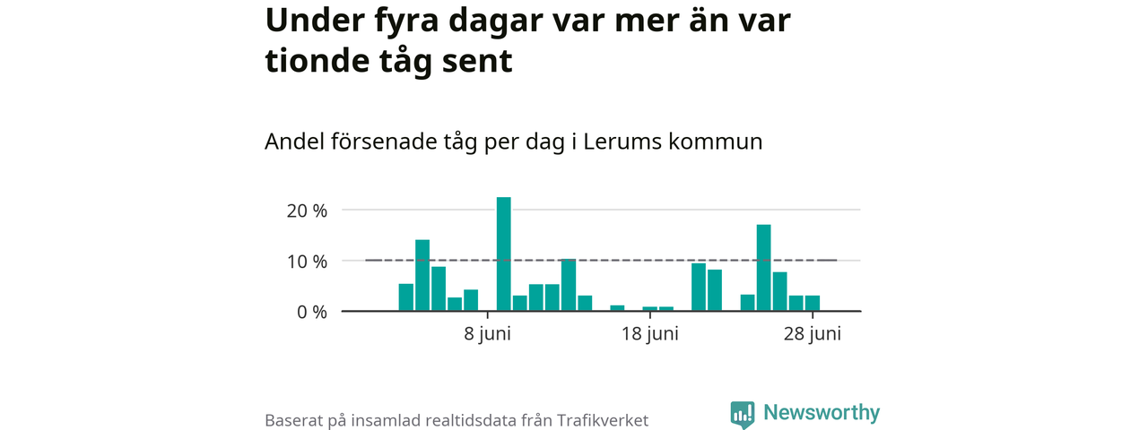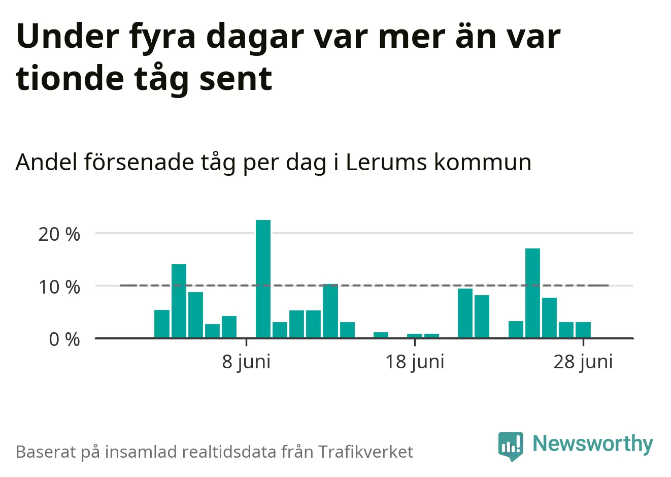Den svenska tågtrafiken har dragits med historiskt dålig punktlig under första halvan av 2024. Juni månad har dock sett något bättre ut än maj. Newsworthy har samlat in tågens ankomsttider under juni, för att se hur stor andel av tågen till Lerums kommun som var i tid under den senaste månaden.