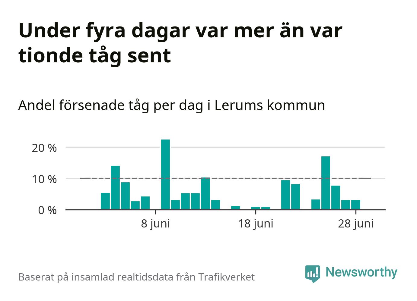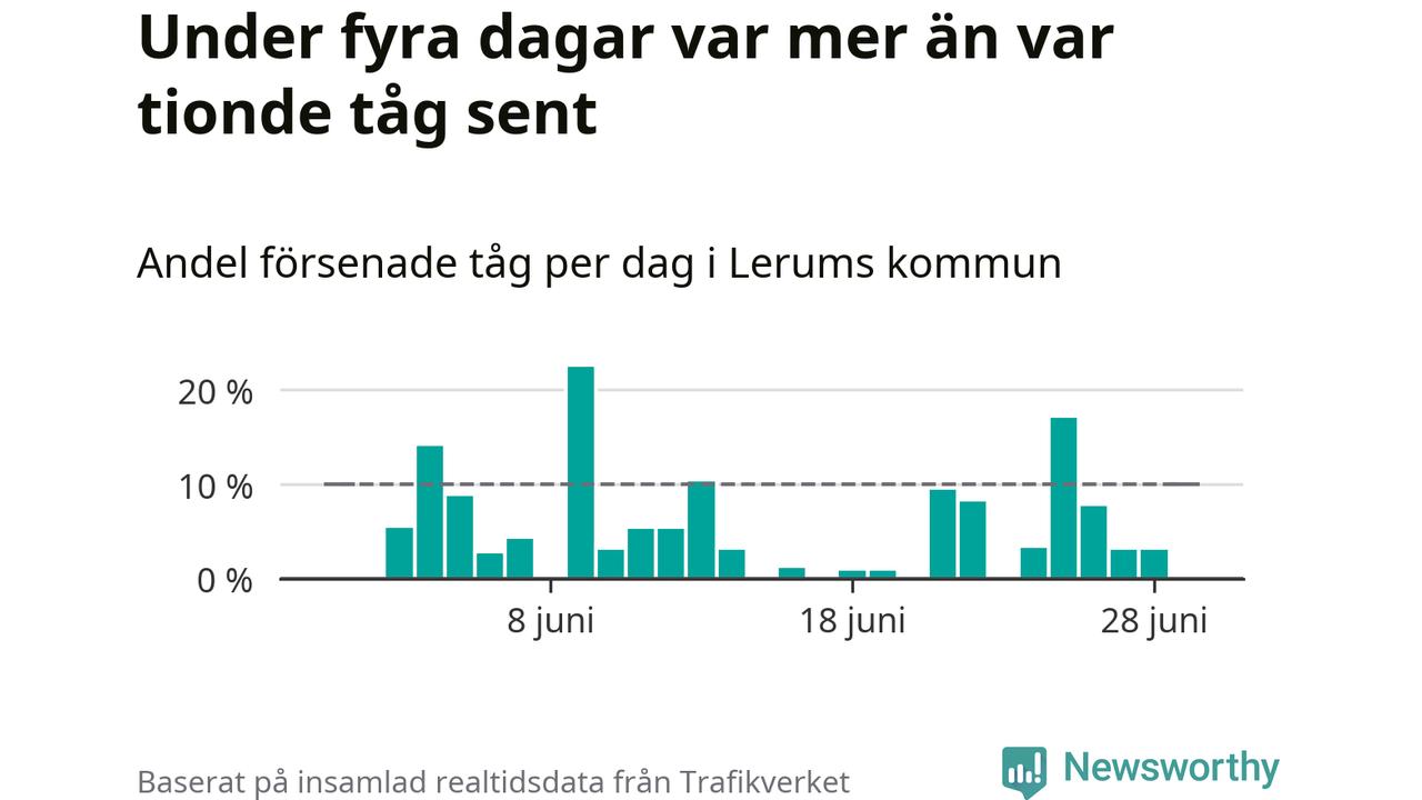 Totalt var fem procent av de ankommande tågen i Lerums kommun mer än fem minuter försenade under juni bland de tåg som angjorde någon av stationerna i kommunen. En procent var så mycket som en kvart försenade.
