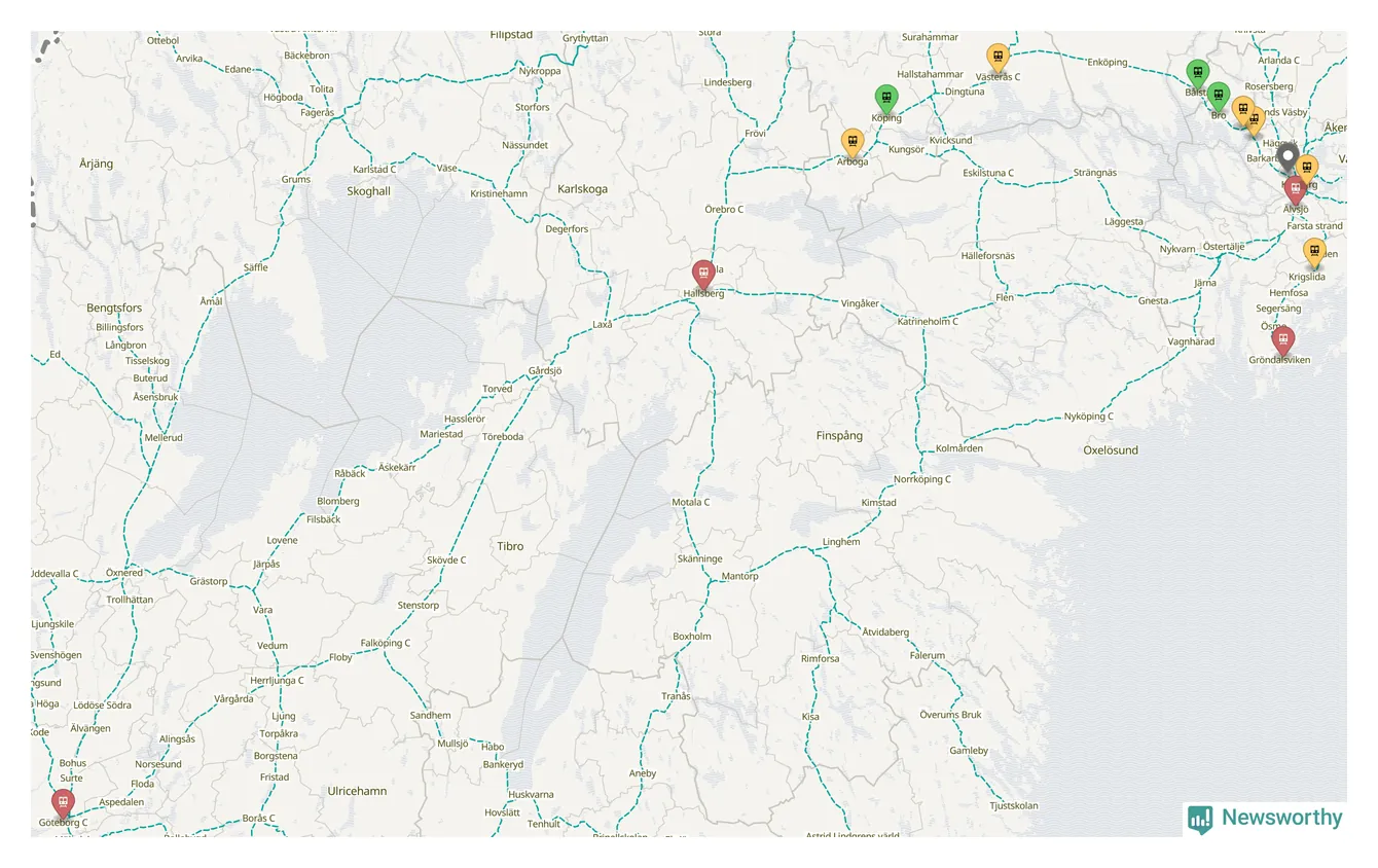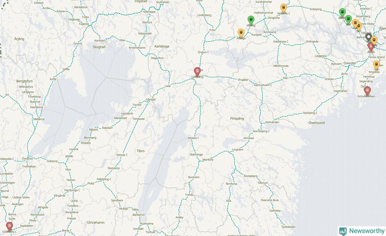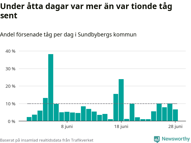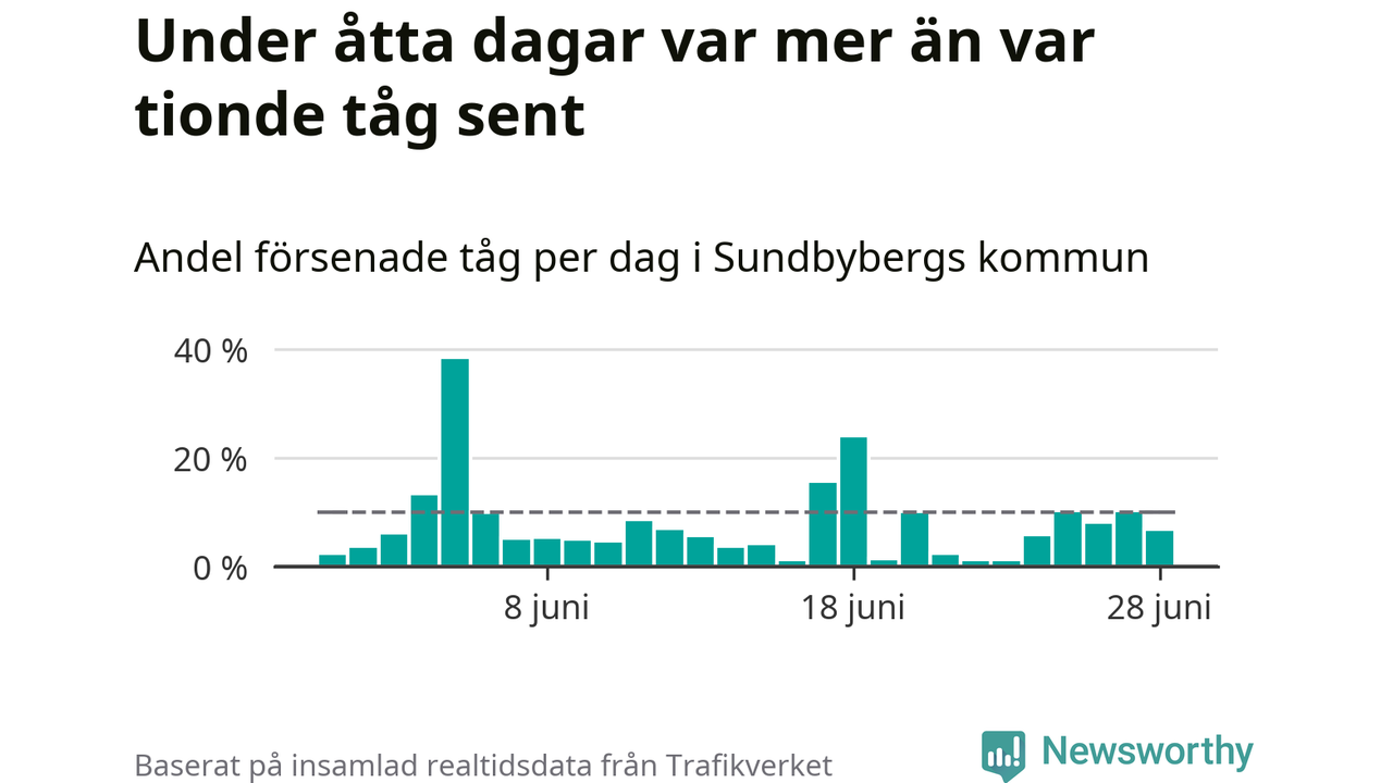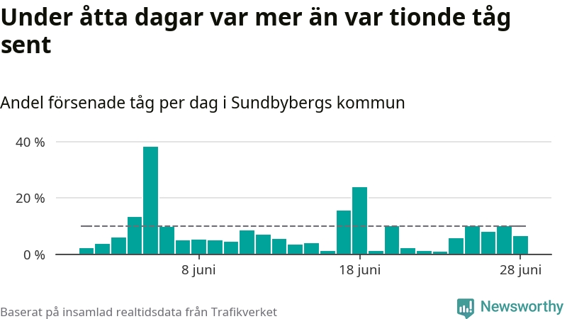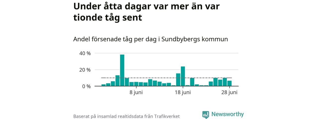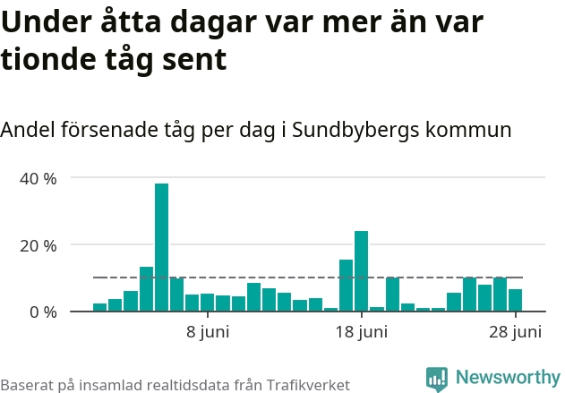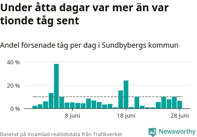 Åtta procent av tågen vid Sundbyberg var sena under juni, och sträckan Stockholm–Göteborg var extra drabbad. Det visar Newsworthys sammanställning av alla sena och inställda förra månaden.