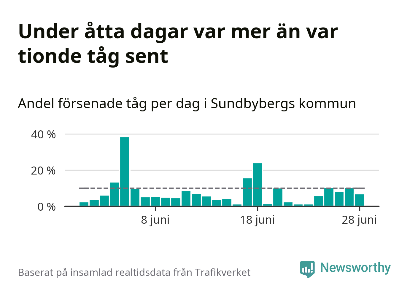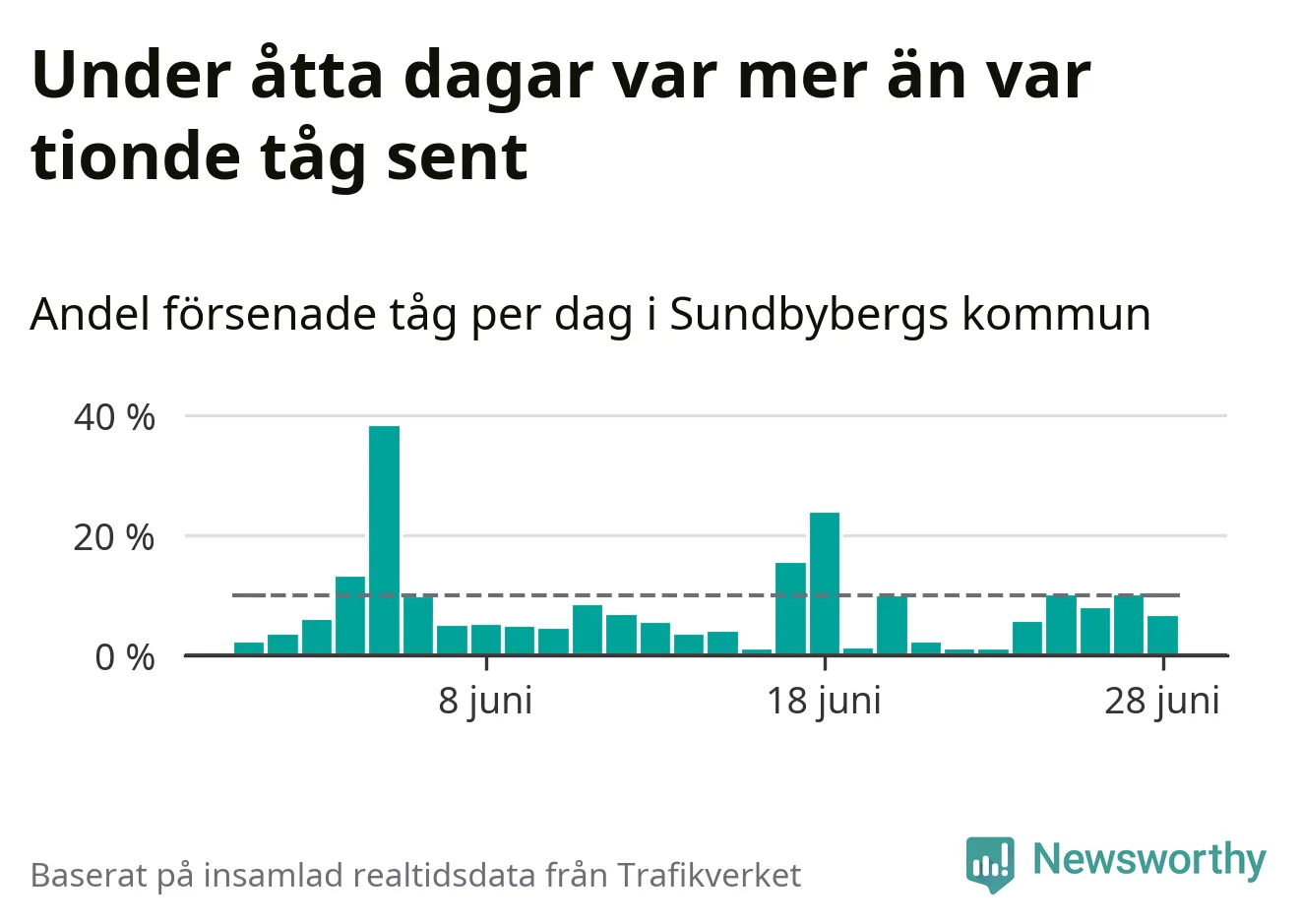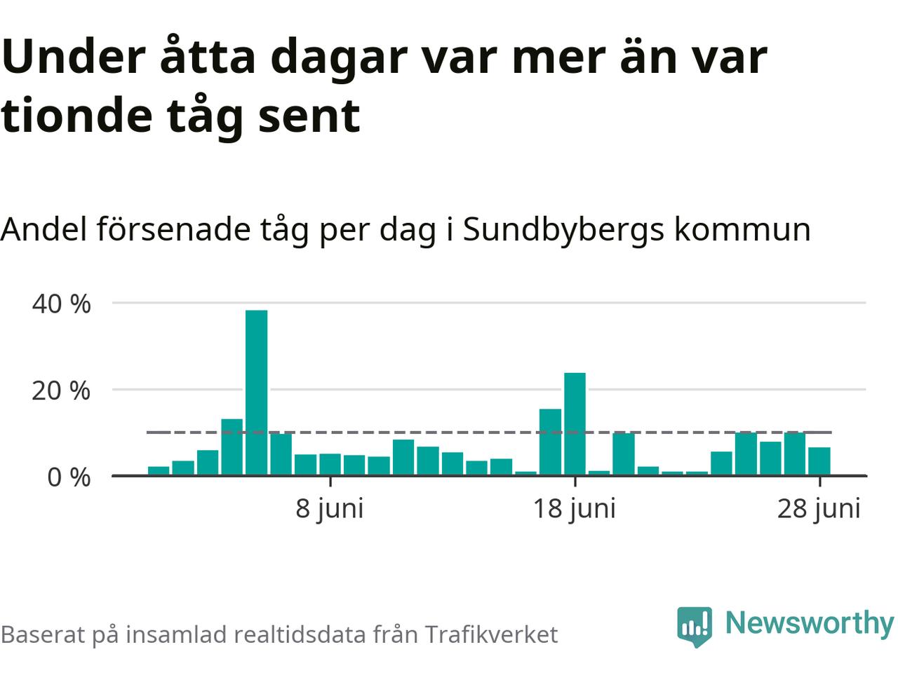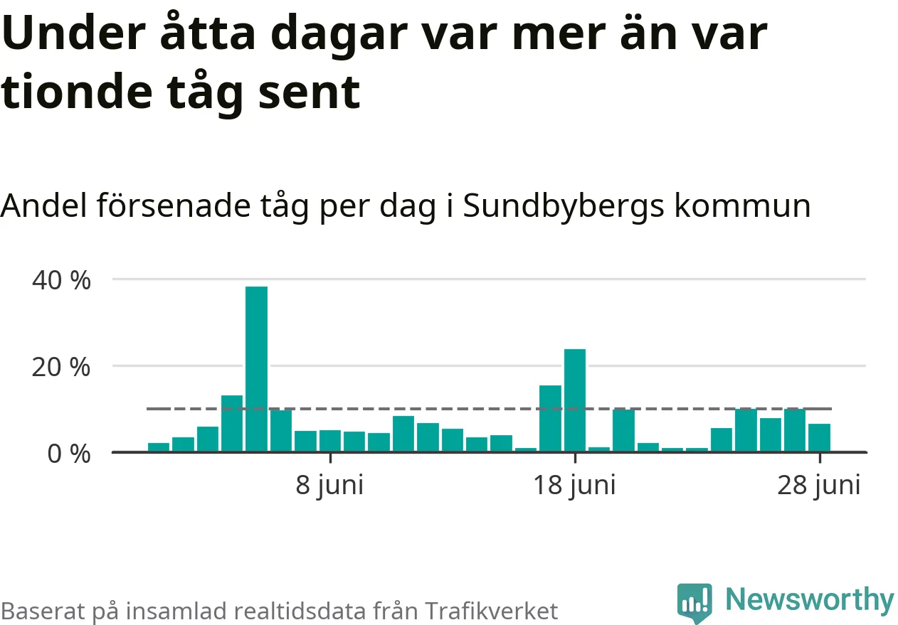 Dagen med flest sena tåg var onsdag den 5 juni, när 38 procent av tågen var mer än fem minuter försenade. Under åtta dagar var mer än var tionde tåg sent.