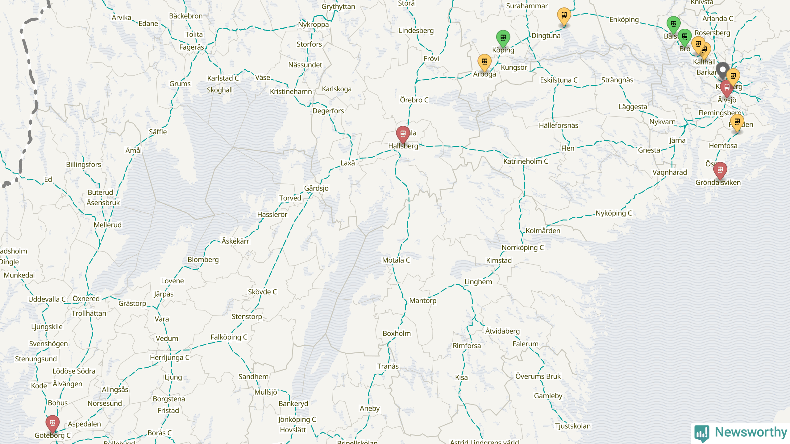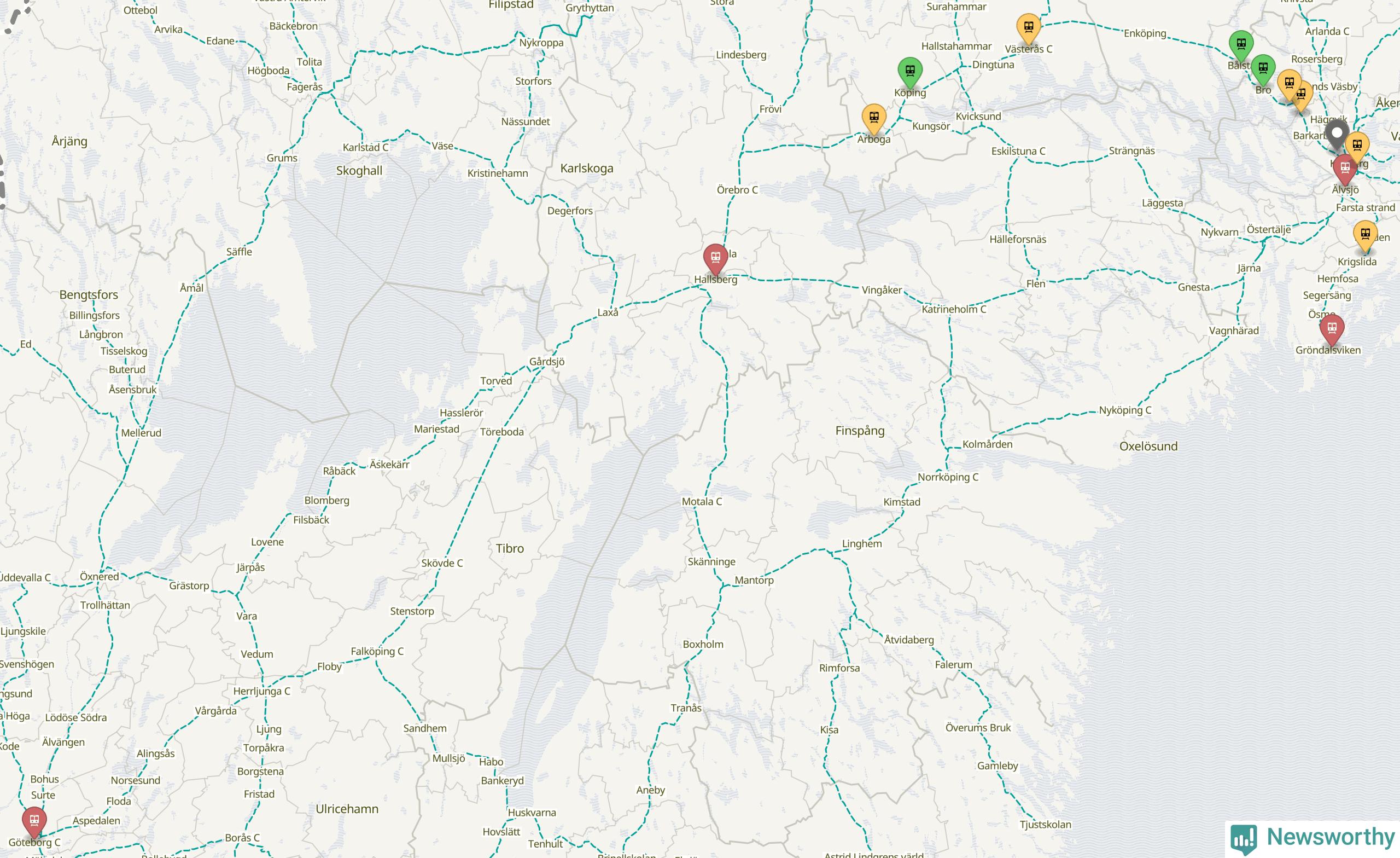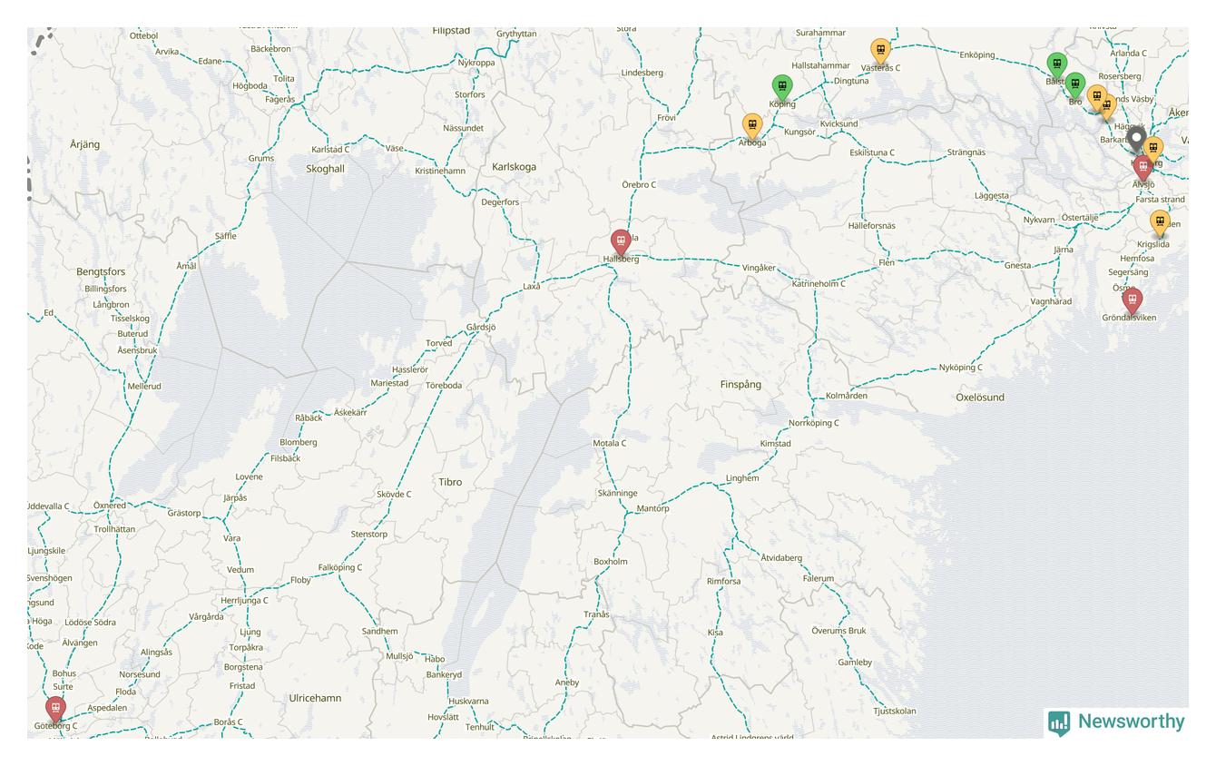Kartdata från Mapbox, Newsworthy, OpenStreetMap och Trafikverket. Uppgifter om sträckor med passagerartrafik från jarnvag.net.