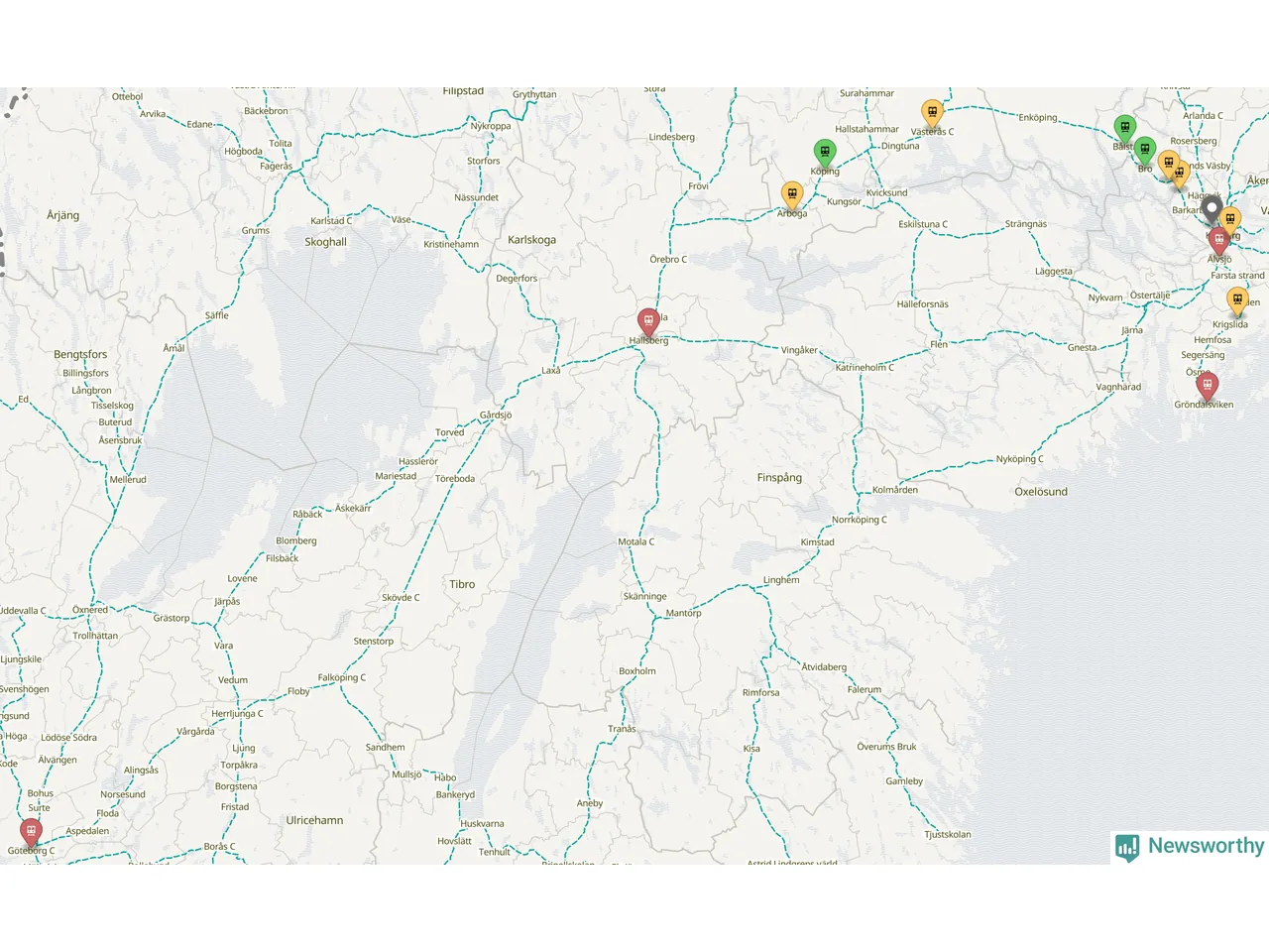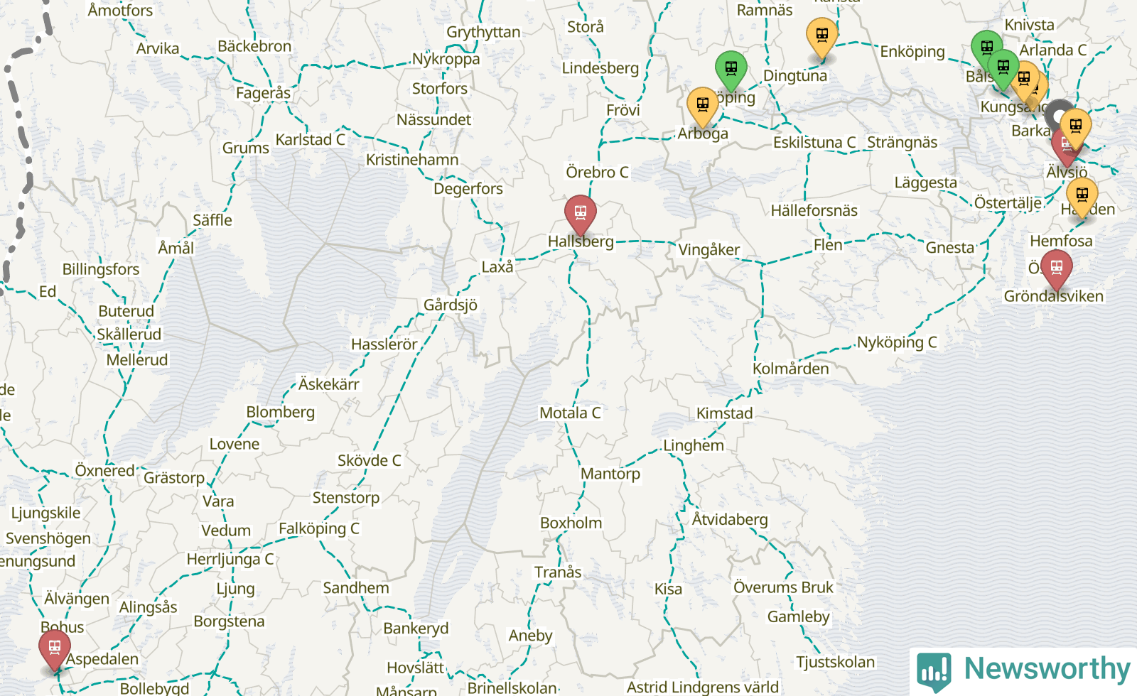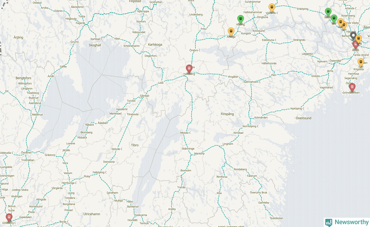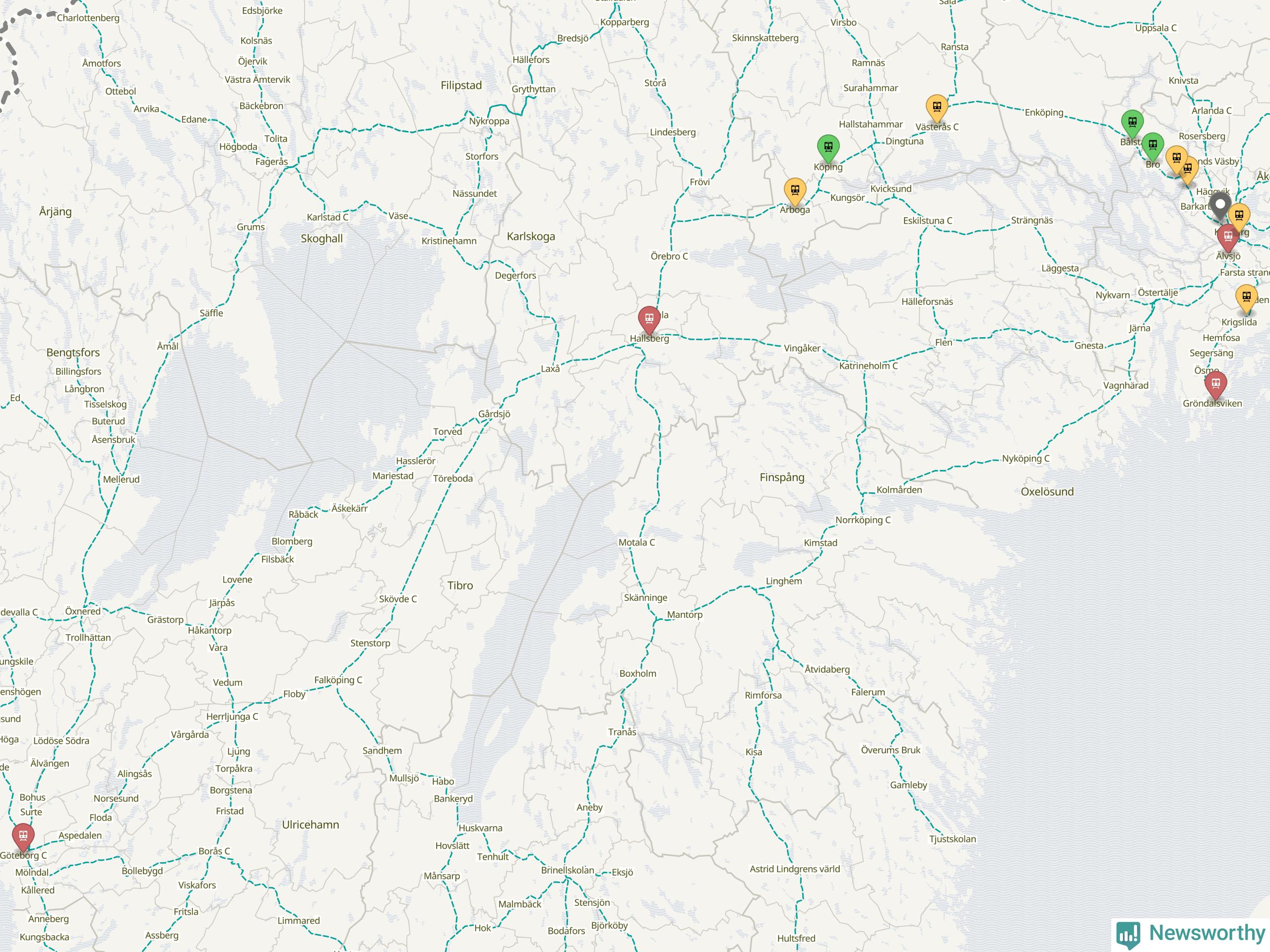 Kartdata från Mapbox, Newsworthy, OpenStreetMap och Trafikverket. Uppgifter om sträckor med passagerartrafik från jarnvag.net.