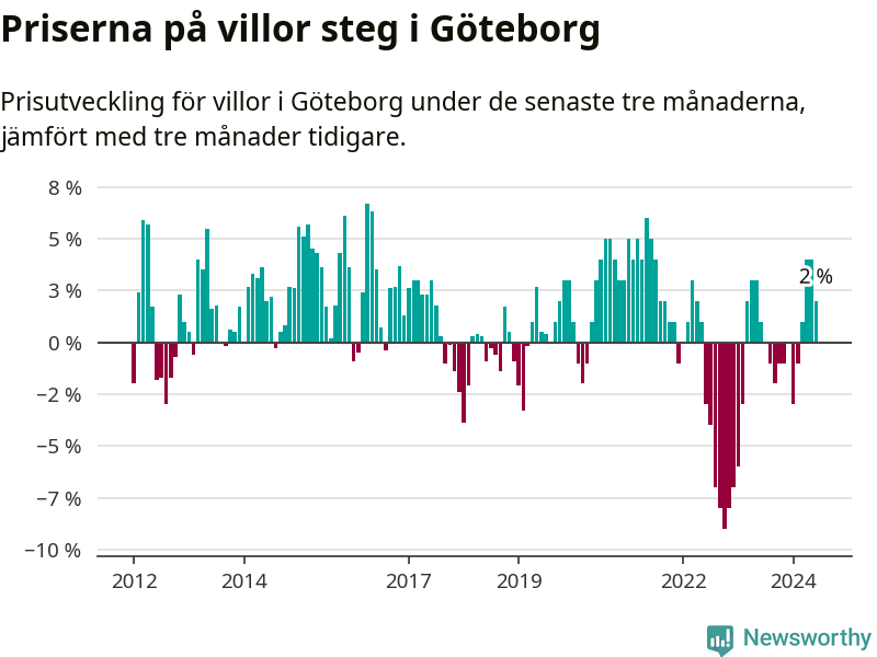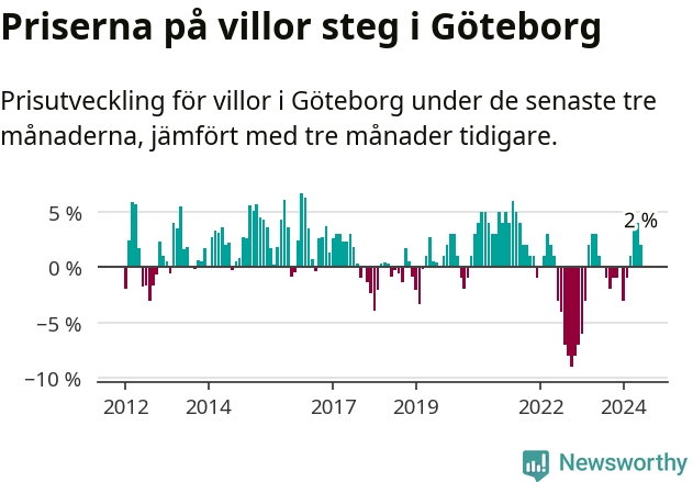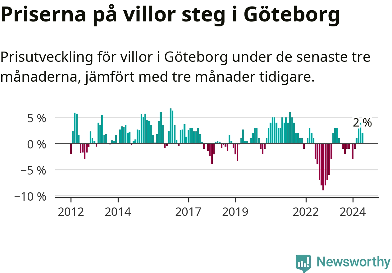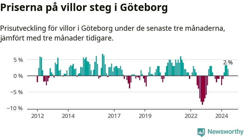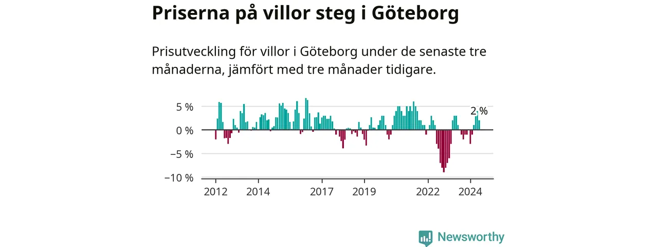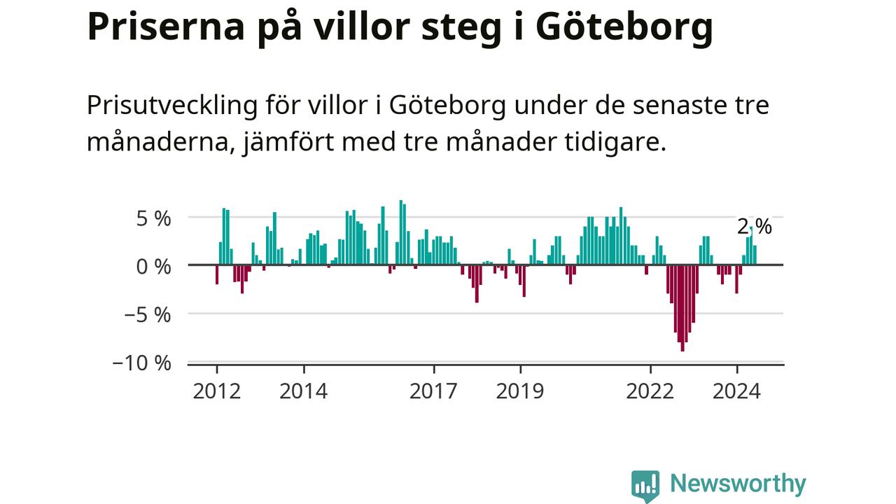 Villapriserna har gått upp i Göteborgs kommun. Medelpriset på försäljningarna under de senaste tre månaderna visar på en uppgång med 2 procent.