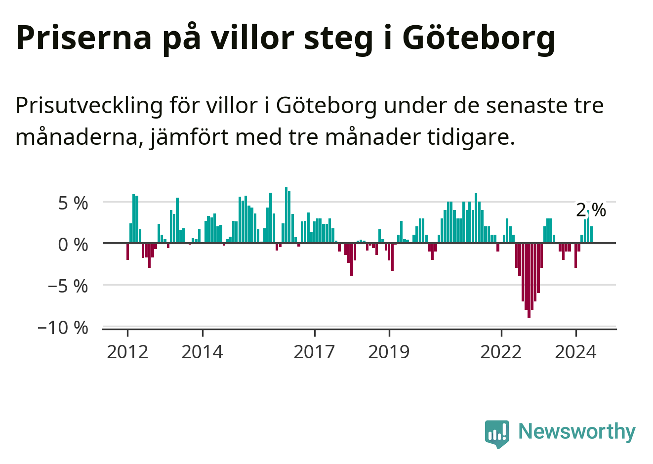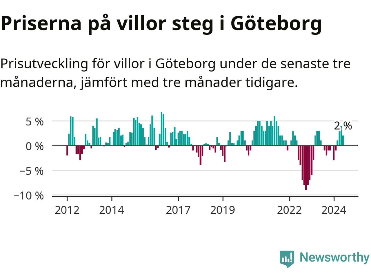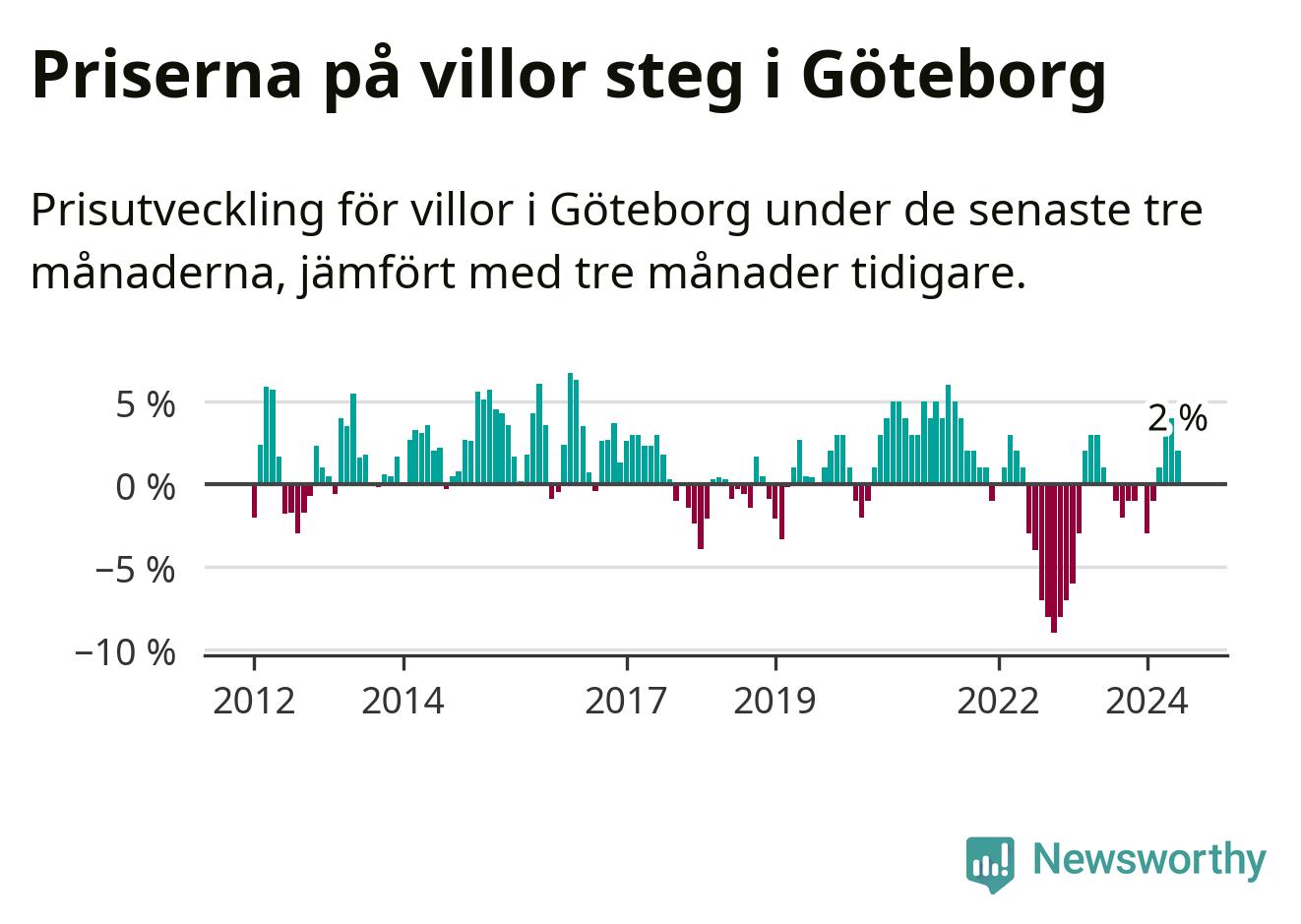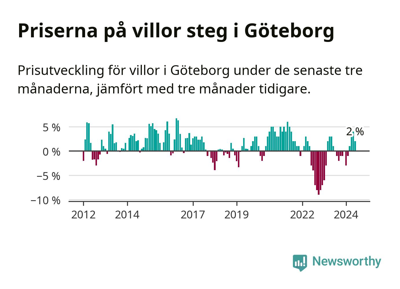 Villapriserna har gått upp i Göteborgs kommun. Medelpriset på försäljningarna under de senaste tre månaderna visar på en uppgång med 2 procent.