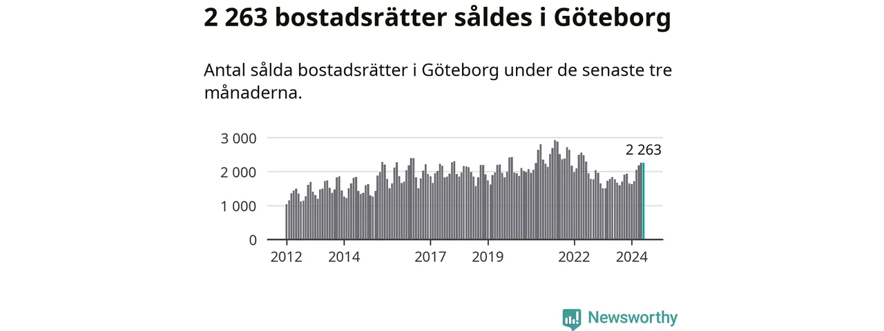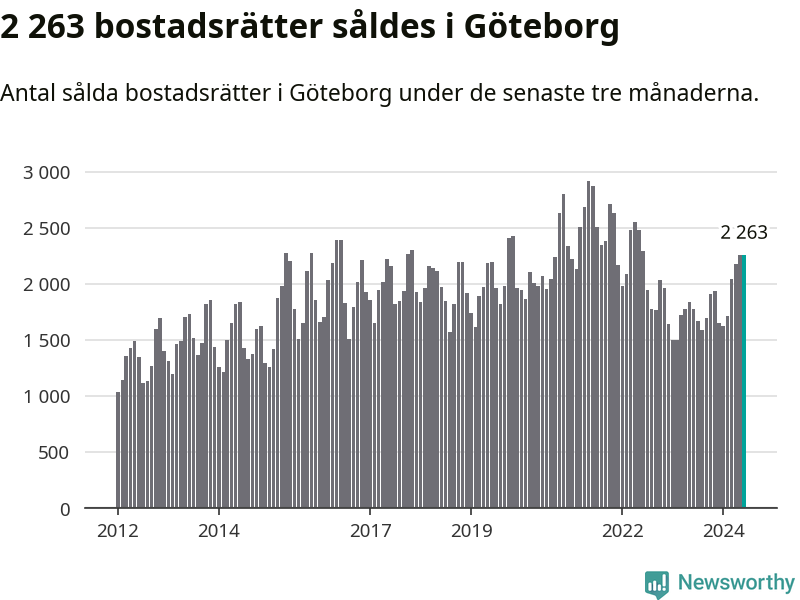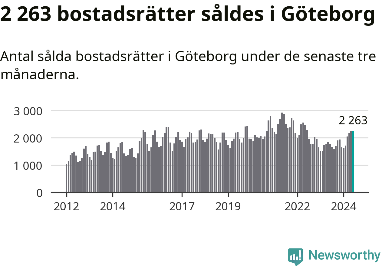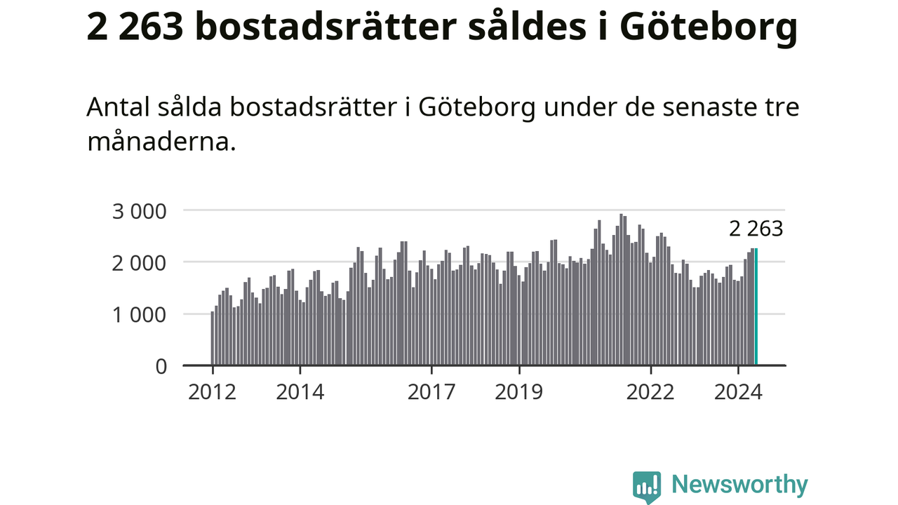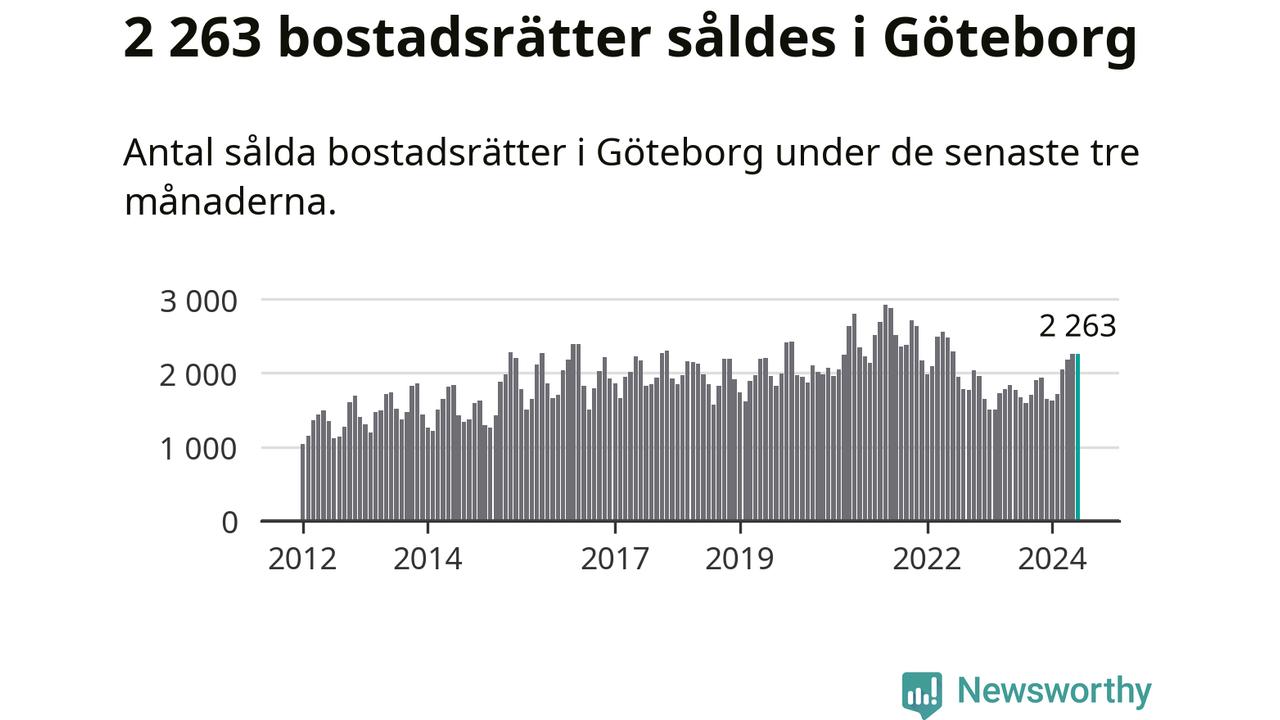 Sammanlagt såldes 2 263 bostadsrätter i Göteborgs kommun mellan april och juni till ett genomsnittligt pris på 3,3 miljoner kronor. I fjol gjordes 1 776 affärer vid den här tiden på året.